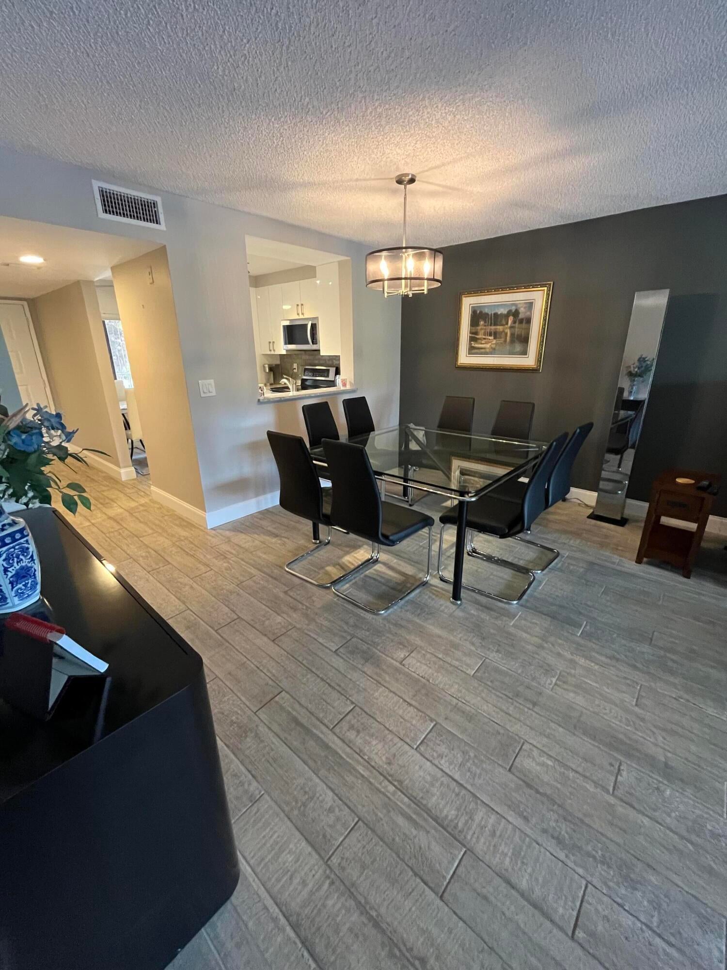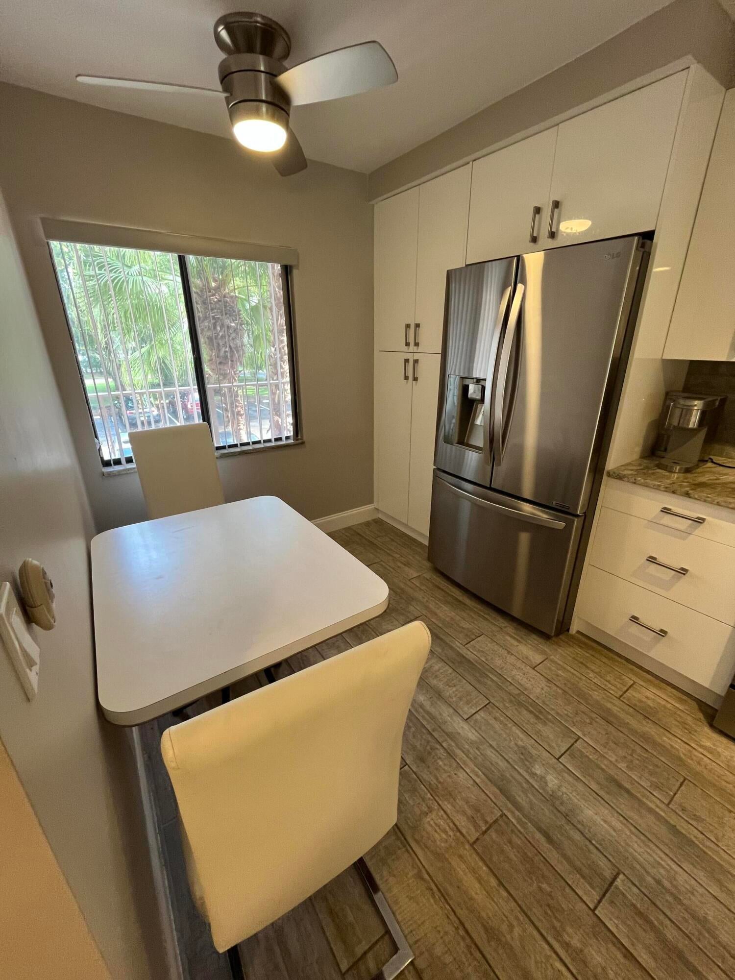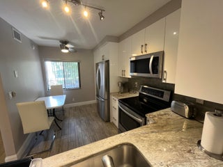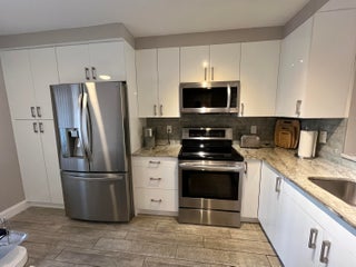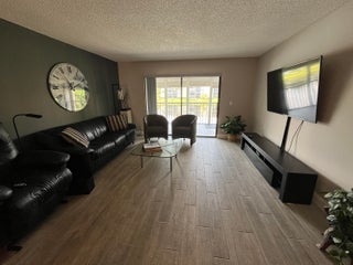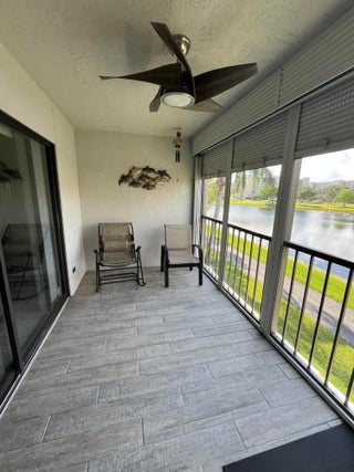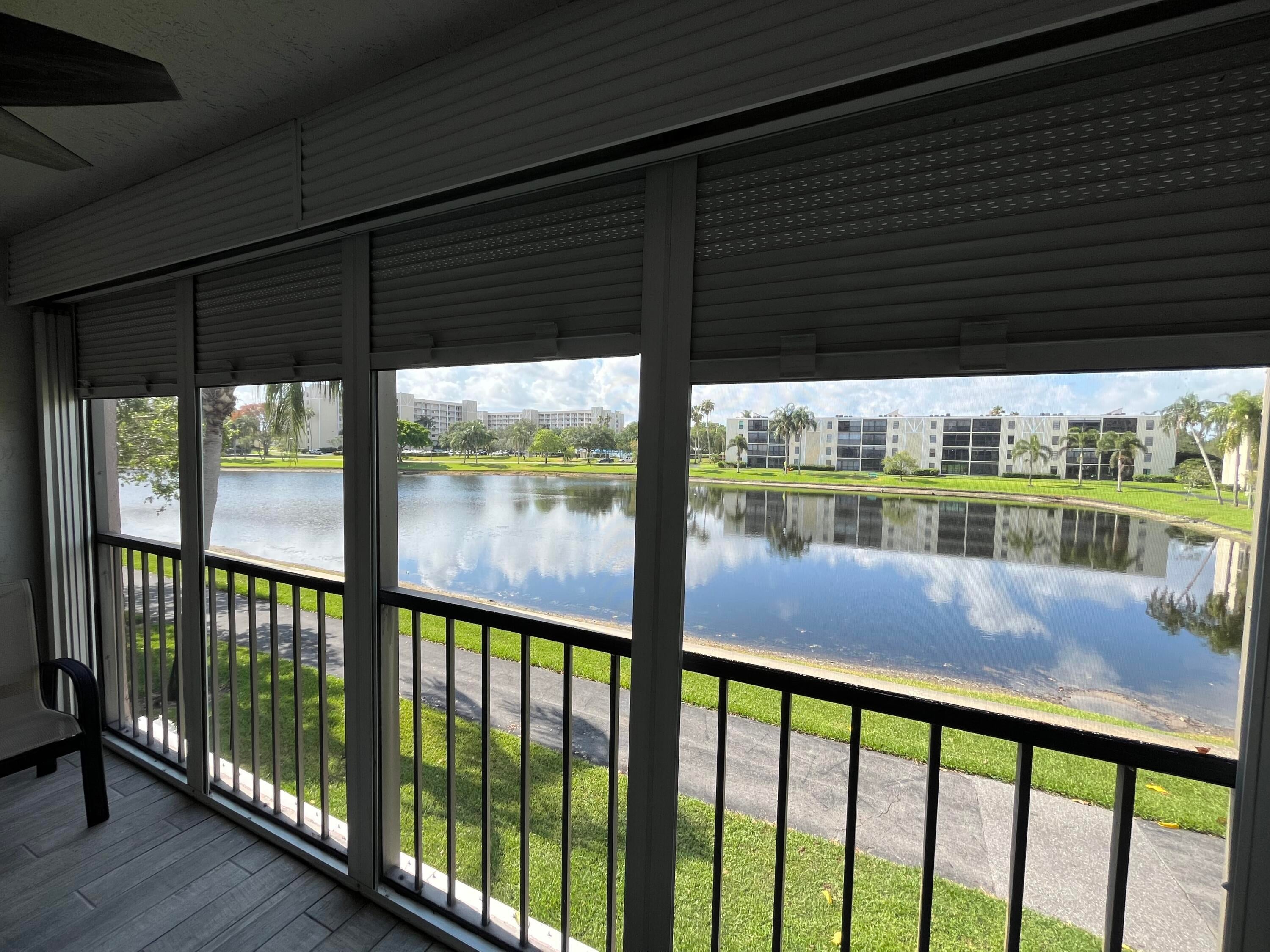 Gorgeous re-done Lancaster model in section 4 of Huntington Lakes. Great expansive wide lake view from your southern exposure facing patio with roll-down shutters as well. As soon as you enter this condo, you are met with updated gray plank tiling throughout the main area. Your kitchen has upgrades that include an undercounter lazy susan corner for additional storage. Roll-out cabinets in the pantry. Granite countertops with a subway tiled backsplash. Both bathrooms designed similarly in whites and grays exquisitely and tastefully. Guest/2nd bathroom updated with stall shower too. Higher designer baseboards all around. A/C unit 2024. Water heater April 2025. Full side by side washer/dryer in utility room. Primary b/r with 2 walk-in closets. Parking space #1. Lowest maint in comm