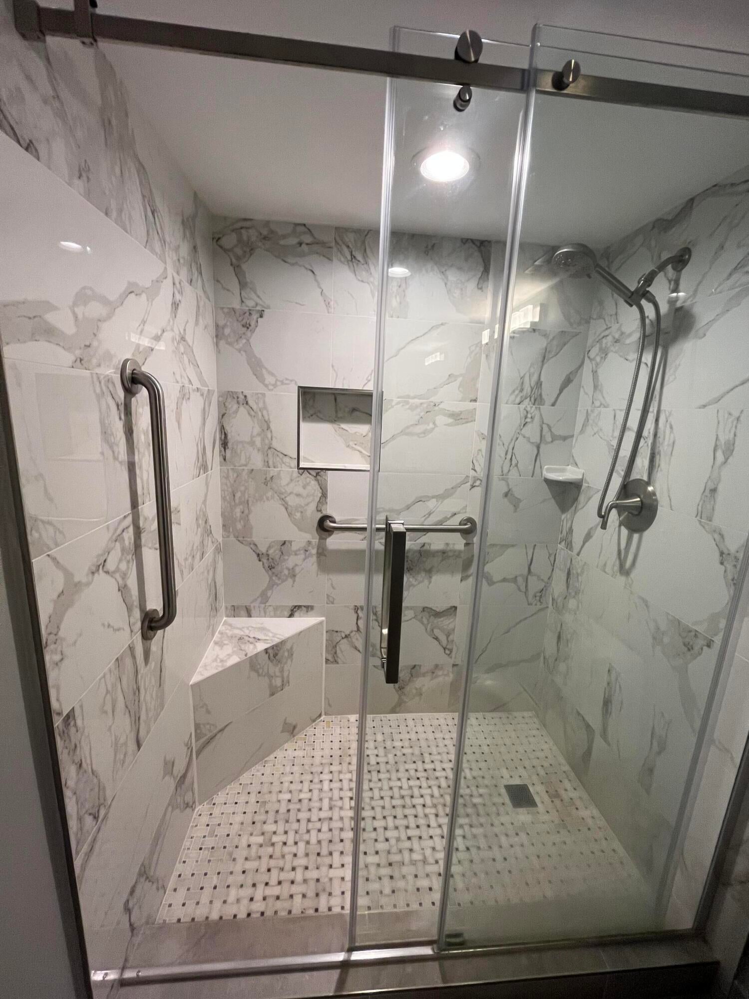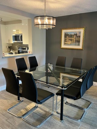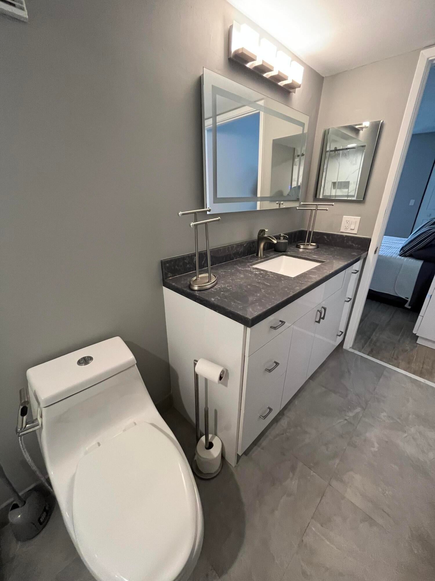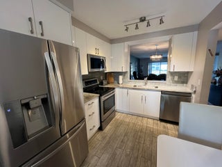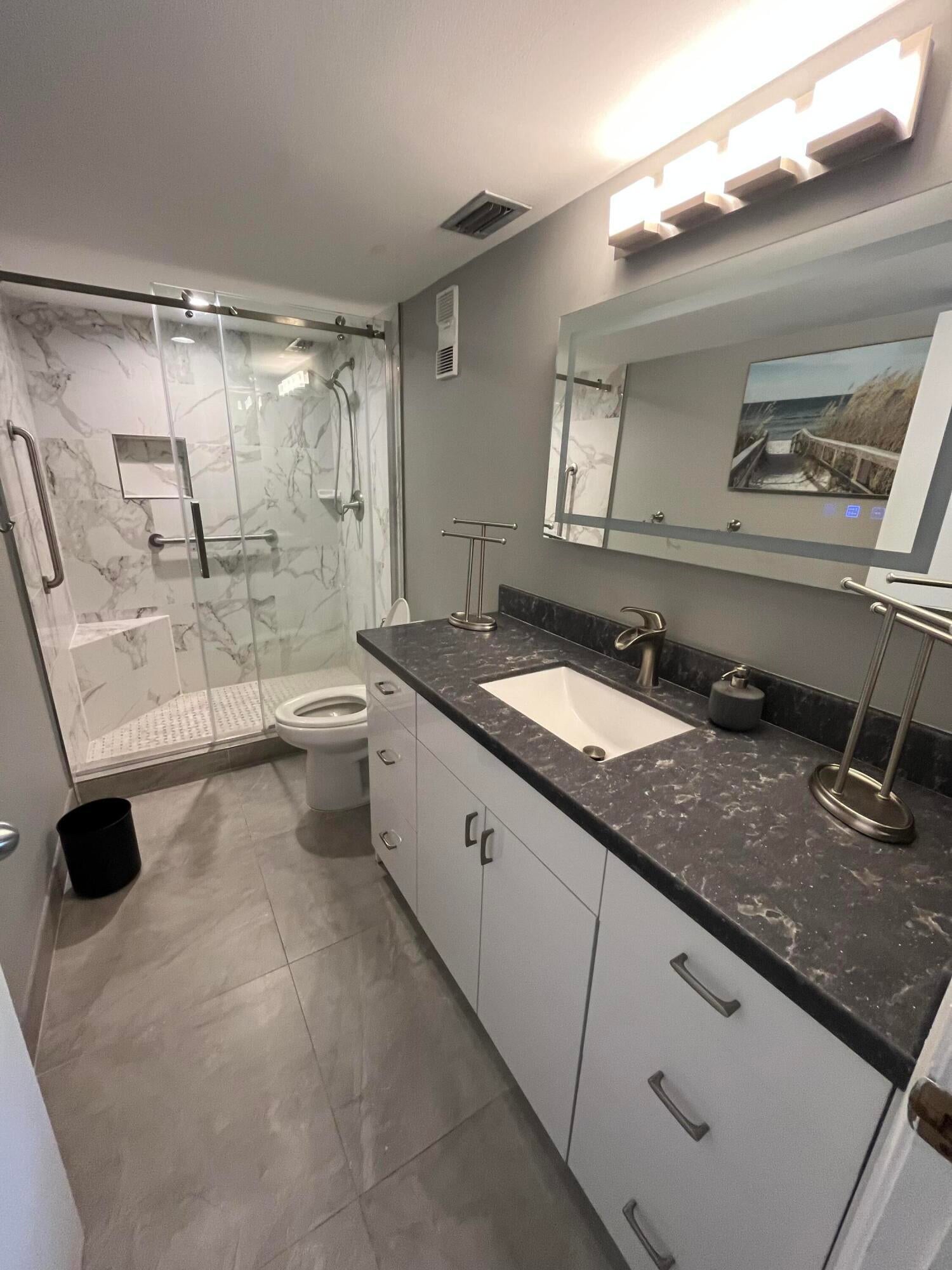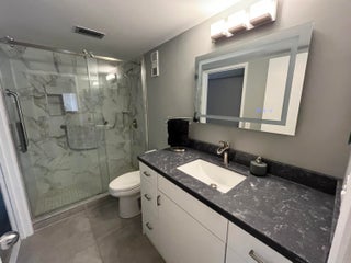 Gorgeous re-done Lancaster model in section 4 of Huntington Lakes. Great expansive wide lake view from your southern exposure facing patio with roll-down shutters as well. As soon as you enter this condo, you are met with updated gray plank tiling throughout the main area. Your kitchen has upgrades that include an undercounter lazy susan corner for additional storage. Roll-out cabinets in the pantry. Granite countertops with a subway tiled backsplash. Both bathrooms designed similarly in whites and grays exquisitely and tastefully. Guest/2nd bathroom updated with stall shower too. Higher designer baseboards all around. A/C unit 2024. Water heater April 2025. Full side by side washer/dryer in utility room. Primary b/r with 2 walk-in closets. Parking space #1. Lowest maint in comm