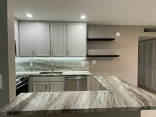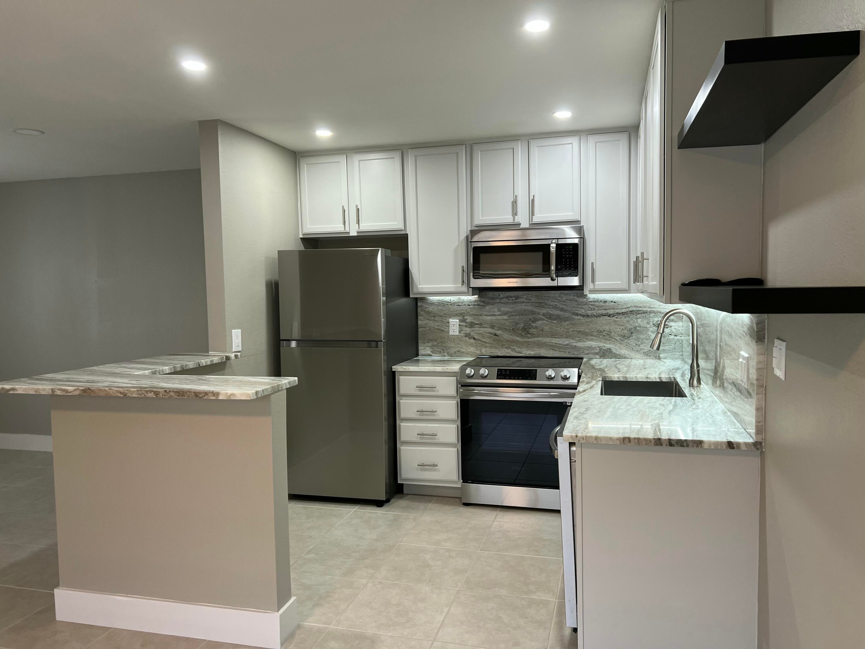 Fantastic, newly renovated, and move-in ready condo with lots of upgrades, including new quartz countertops in kitchen, under cabinet lights, open concept breakfast bar, stainless steel appliances, new electrical panel, LED recessed ceiling lights in every room, and a new full-sized washer and dryer. There are no popcorn ceilings and no carpet! Beautiful tiled bathrooms are new too! The location of this condo is superb...it's at a dead-end street with little or no traffic, lots of green space, big trees, and parklike yard to enjoy. Minutes away from 2 different community gates for easy access. This is a 55 and older community with LOTS of amenities, plus it is convenient to shopping, restaurants, doctors' offices, and hospital.