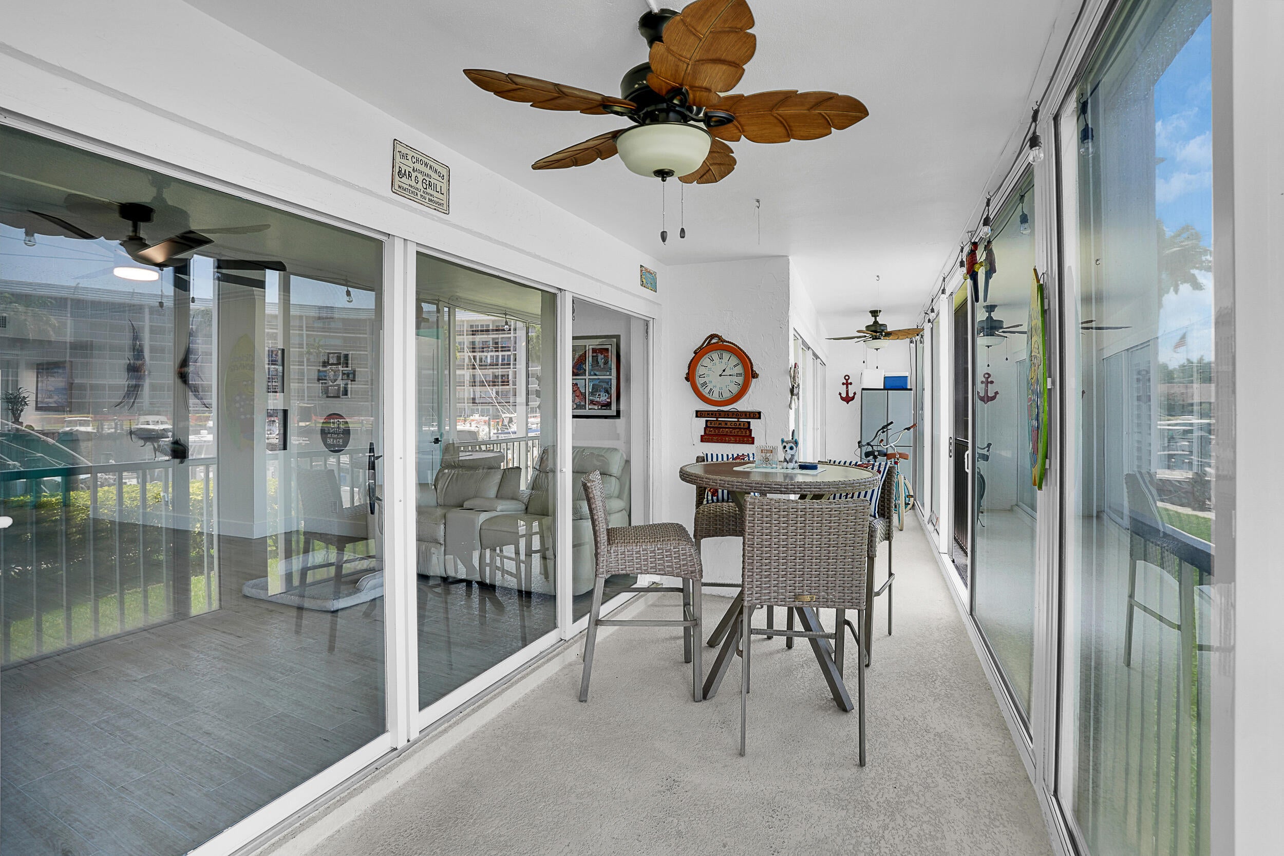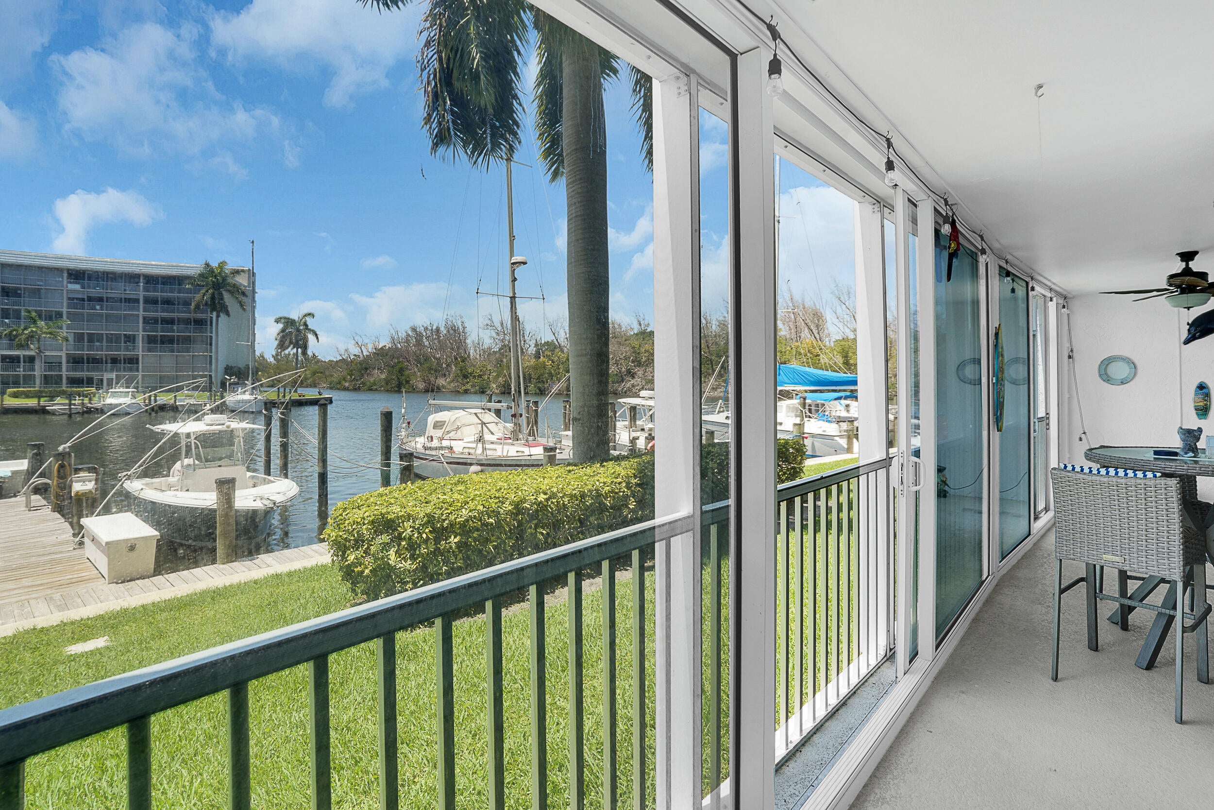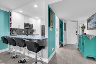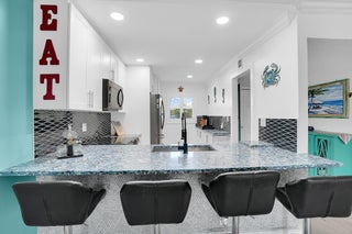 Fabulous waterfront condominium with a complete transformation, coastal theme with marina views. The custom kitchen is equipped with top-tier stainless appliances & features a full-sized washer & dryer within the cabinetry. Crown molding adorns every room, complemented by custom interior doors with custom closet systems throughout. Impact windows & doors offer security & custom plantation window treatments. The newly installed (last few months) A/C system & insta-hot water to ensure climate control & immediate hot water. The association has a resort style pool & picnic areas with outdoor grills. Covered parking is located steps from your front door. Concrete restoration has been settled, & the property is outfitted with hi-speed fiber for TV & internet connectivity.Boat slips when available - Low $! Ready for occupancy, this home offers negotiable furnishings for a quick move experience!