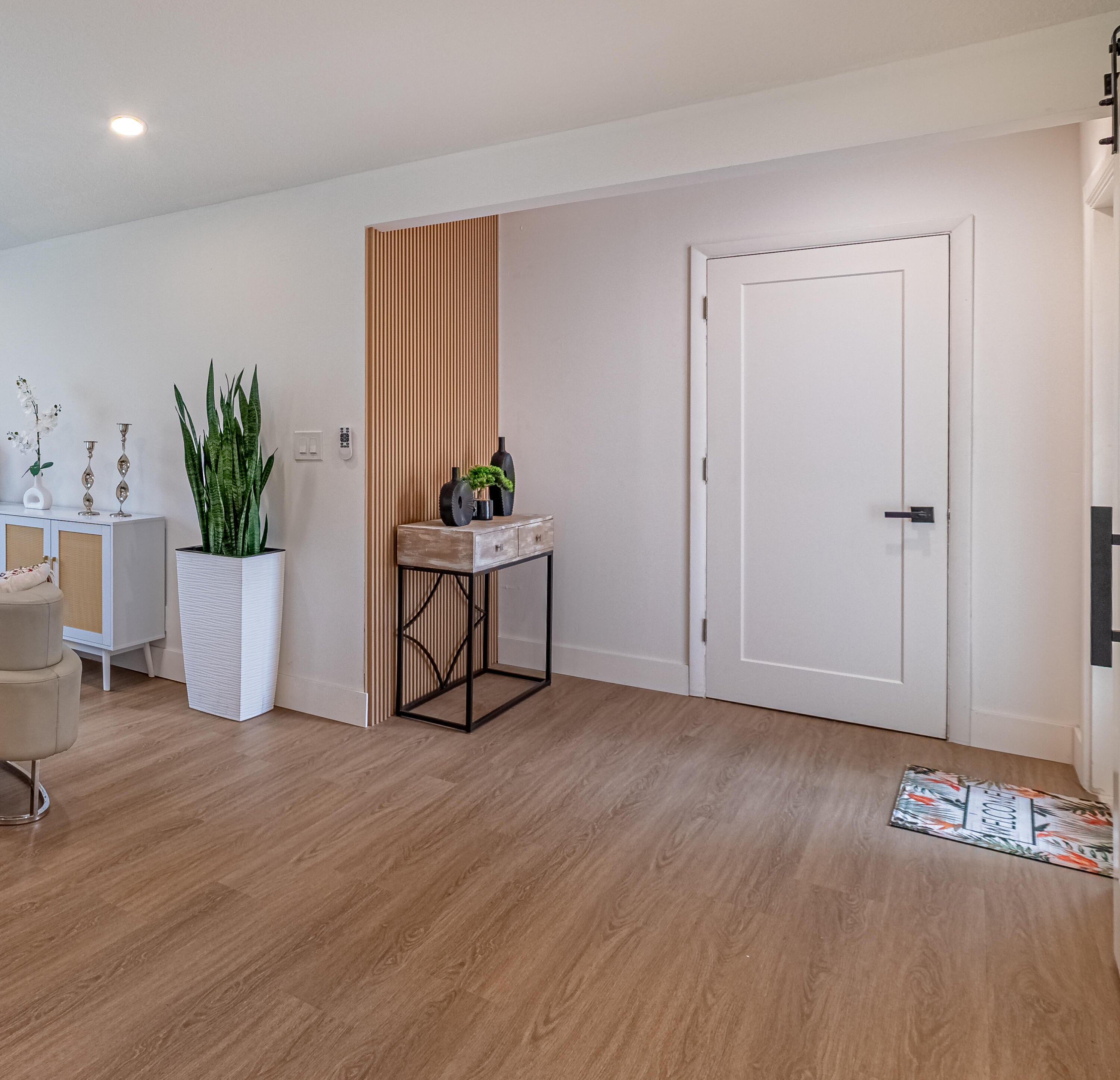 *+55 *. All is top of the line in this designer house! first the location, +8000 SFT lot on a very quiet cul de sac with well maintained houses around. Second the roof was installed in 2021, the windows were installed in 2012 with permit, including the sliders leading to a beautiful large patio. A new Trane AC system. The main living area has an open concept kitchen with Kitchen Aid appliances! A snack bar and a gorgeous white quartz counter top. Waterproof vinyl flooring looking like real wood. Recessed ceiling lights in all rooms, 3 good size bedrooms, 2 new bathrooms, one of the bedroom opens on the living area through a large barn door There is a covered patio with a peaceful nature view. A large one car garage with a washer and a dryer dedicated area completes this perfect home There is a covered patio with a peaceful nature view. A one car garage, a washer and a dryer dedicated area completes this perfect home! Sprinkler system