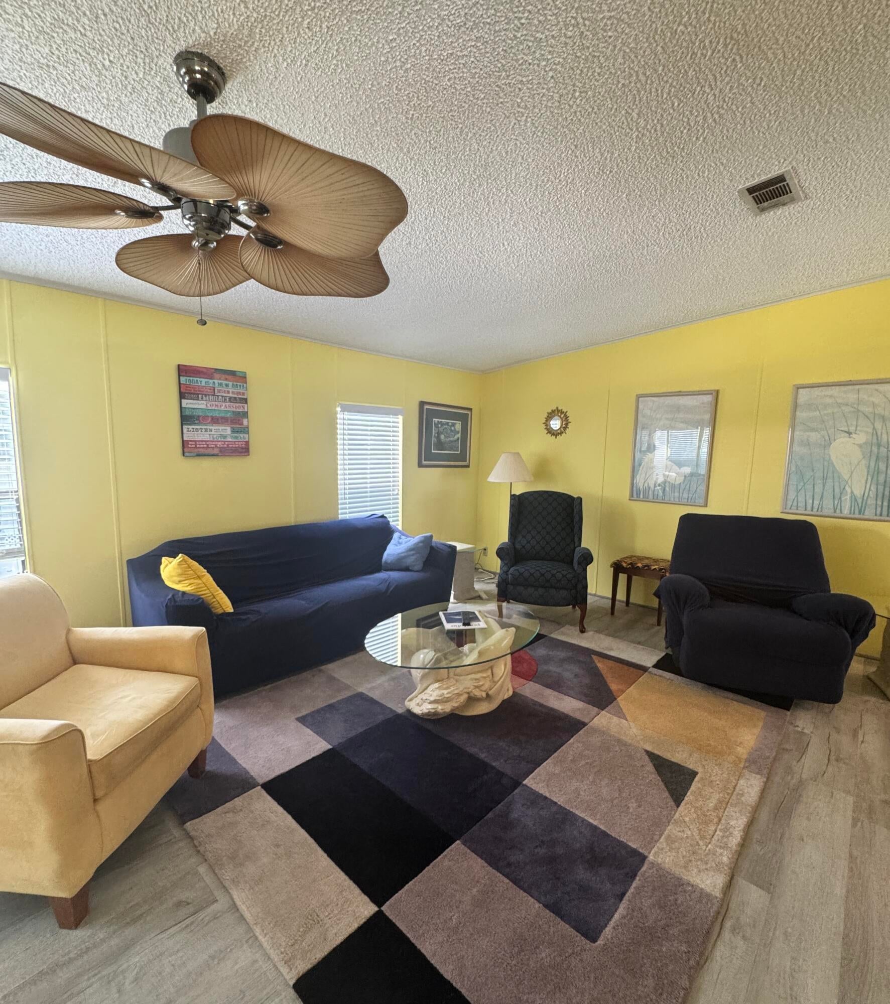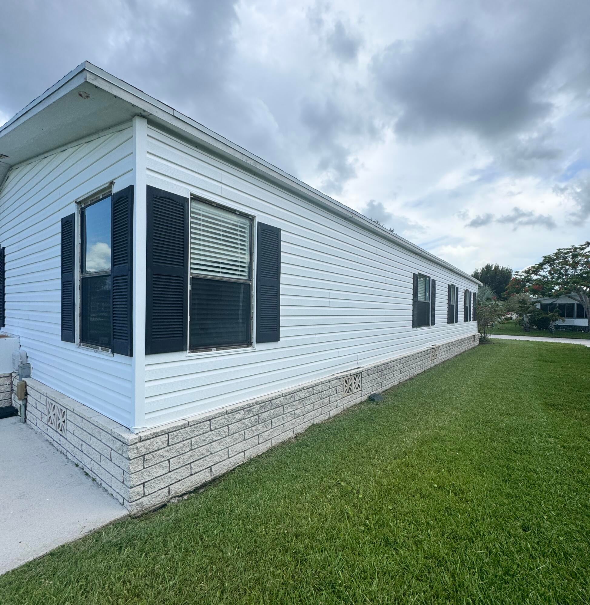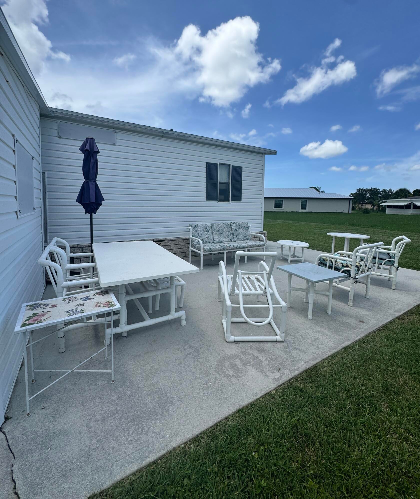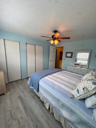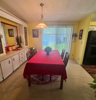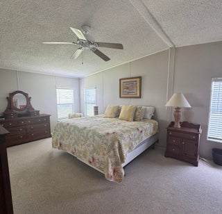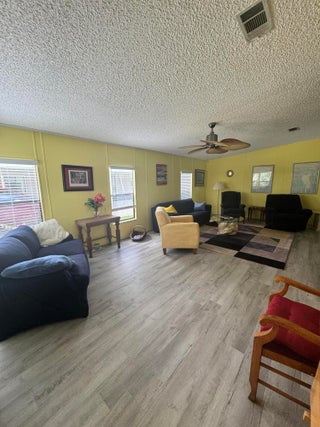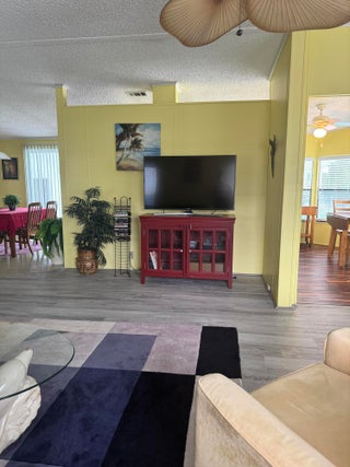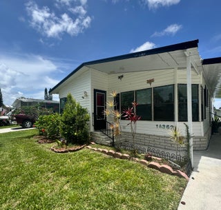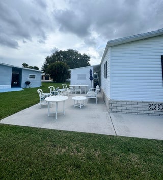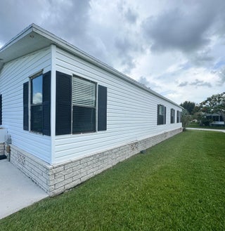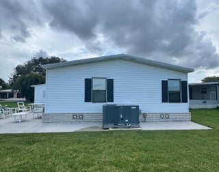 Very well kept 2 bedroom 2 bath home in the desirable 55+Spanish Lakes community. Home has open kitchen with eat in area as well as dining. Double sink in kitchen with kitchen widow over the sink. Home has lots of natural light. Ceiling fans in all rooms. Laminate flooring in main living area. carpet in bedrooms. Large spacious Primary suite with walk in closet. Spacious laundry room is inside home. Built in shelves in dining area for added storage. Large patio off back of home for enjoying the Florida sun. Large green space in backyard with added privacy. Home sits on a very quite street. Lawn care and trash removal included in lot rent. 2 pools, tennis, pickleball, bocceball, shuffle board. club house and much more.