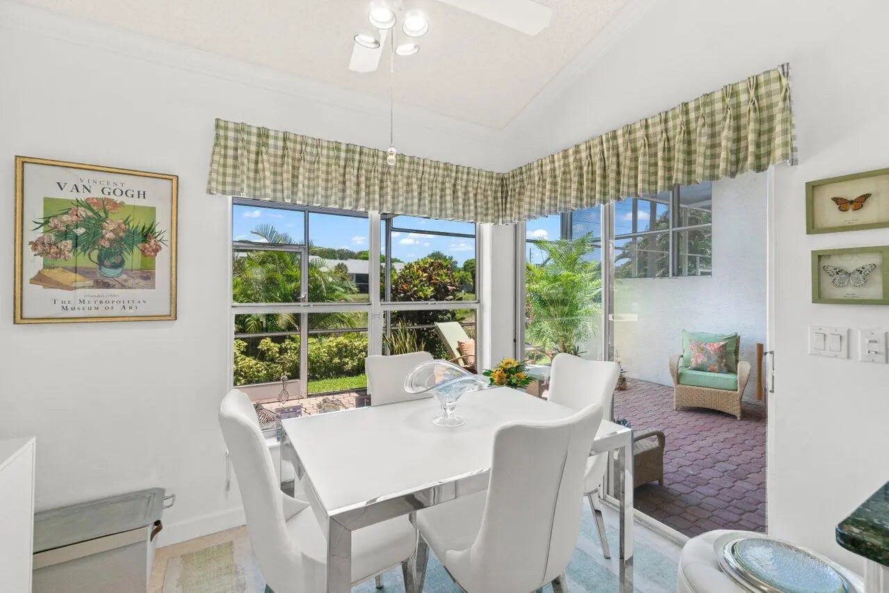 Don't miss this beautiful and inviting one-story townhome, ideally located just a short walk from the clubhouse! 3-bedroom, 2-bath, featuring a well-designed layout with volume ceilings creating a bright and airy atmosphere. Tastefully designed kitchen with abundant cabinetry for storage, and a functional layout that makes cooking a breeze. The primary suite offers a custom walk-in closet, spacious vanity with double sinks, a walk-in shower, and a separate soaking tub.Additional highlights include: 2019 new tile roof and A/C, new water heater in 2021, and newer appliances. Tile flooring and crown molding add a touch of elegance throughout the main living spaces. Plantation shutters, and access to an extended, screen-enclosed patio, are ideal for enjoying Florida living.