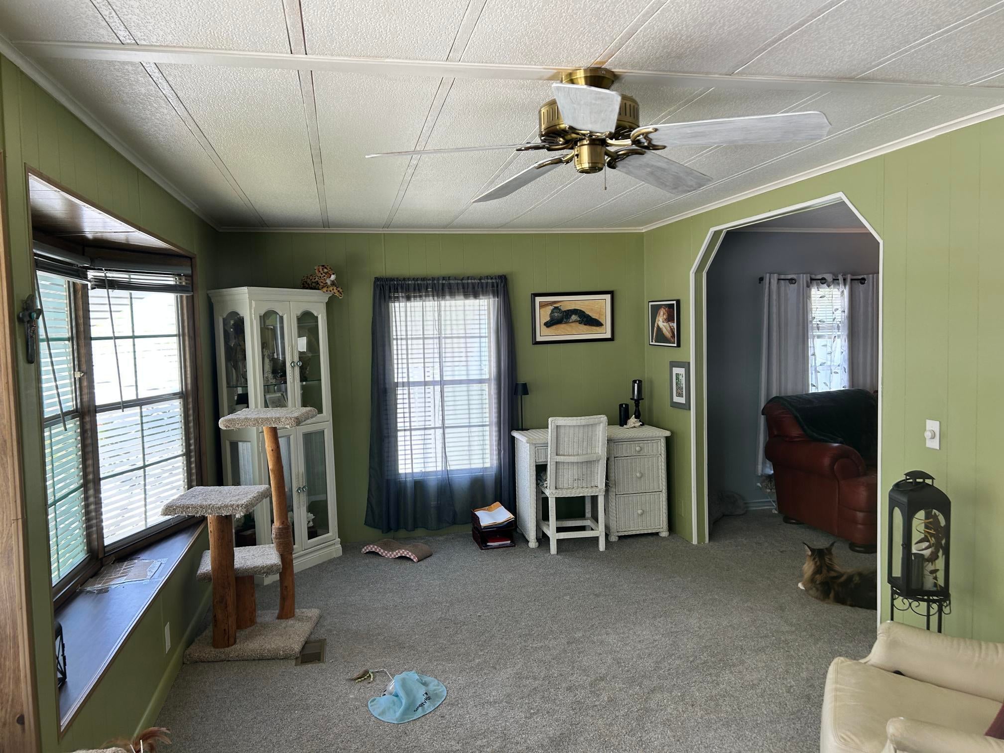 Spacious & Stylish 2 Bed, 2 Bath Home in Premier 55+ Community - Must See!Welcome to this large, tastefully furnished 2 bedroom, 2 bath home ideally situated near the front of the community for easy access. Enjoy not one but two inviting living areas perfect for relaxing or entertaining, plus a formal dining room with built-in cabinetry for added charm and storage.The expansive master suite features an enormous walk-in closet and serene views of the pond from both the bedroom and back patio. The well-designed galley kitchen includes a built-in wet bar, perfect for hosting guests.Stylish laminate flooring runs through the entry, kitchen, and dining areas, while cozy carpet adds warmth to the living room and bedrooms. Recent updates include a newer metal roof and newer AC unit,offering peace of mind for years to come. Additional highlights include a Large carport with extra storage shed, Double bay windows at the front and rear of the home Quiet backyard space with peaceful pond views. This home has it allspace, style, comfort, and convenience. Don't waithomes like this don't last long!