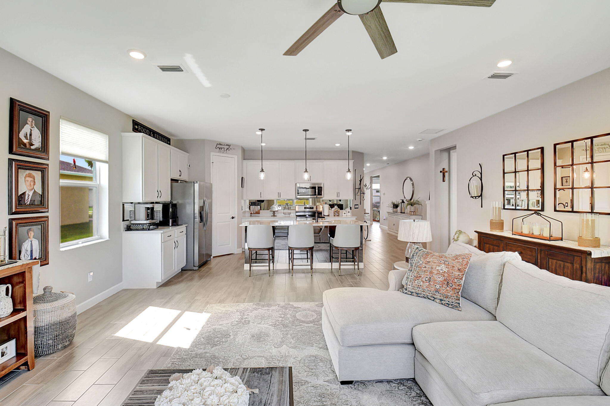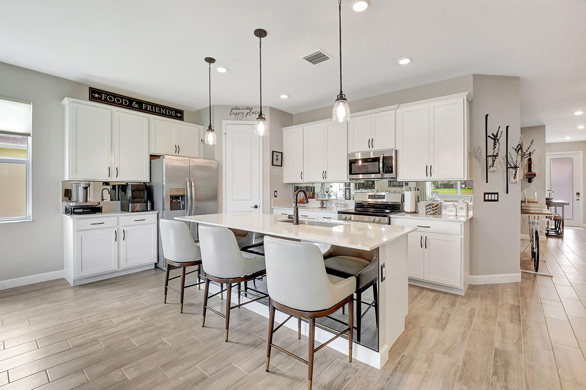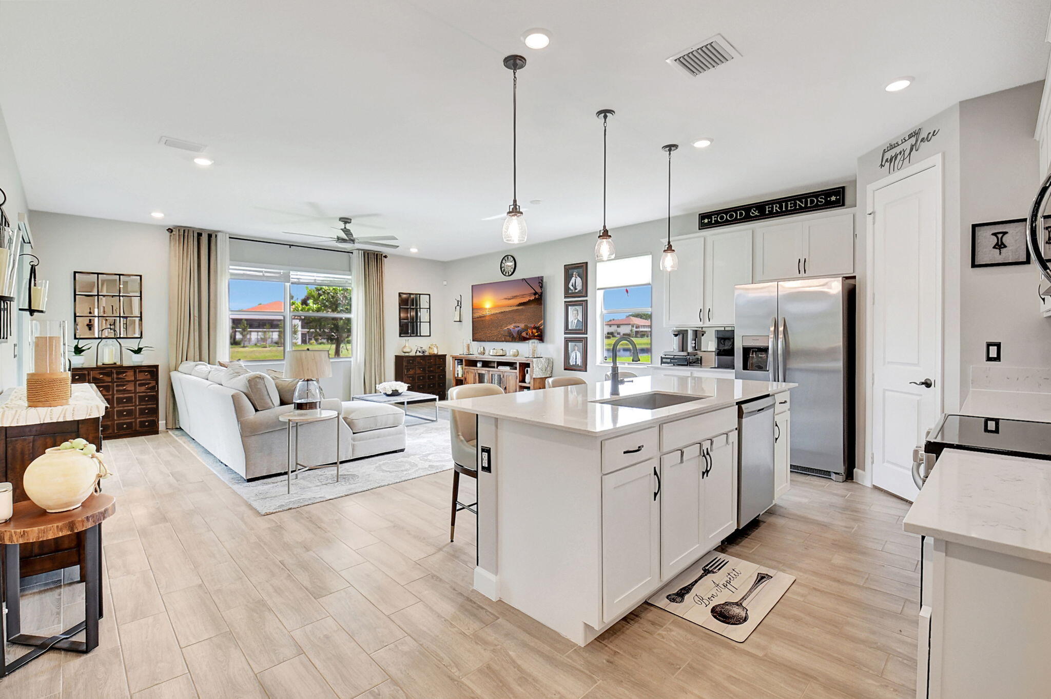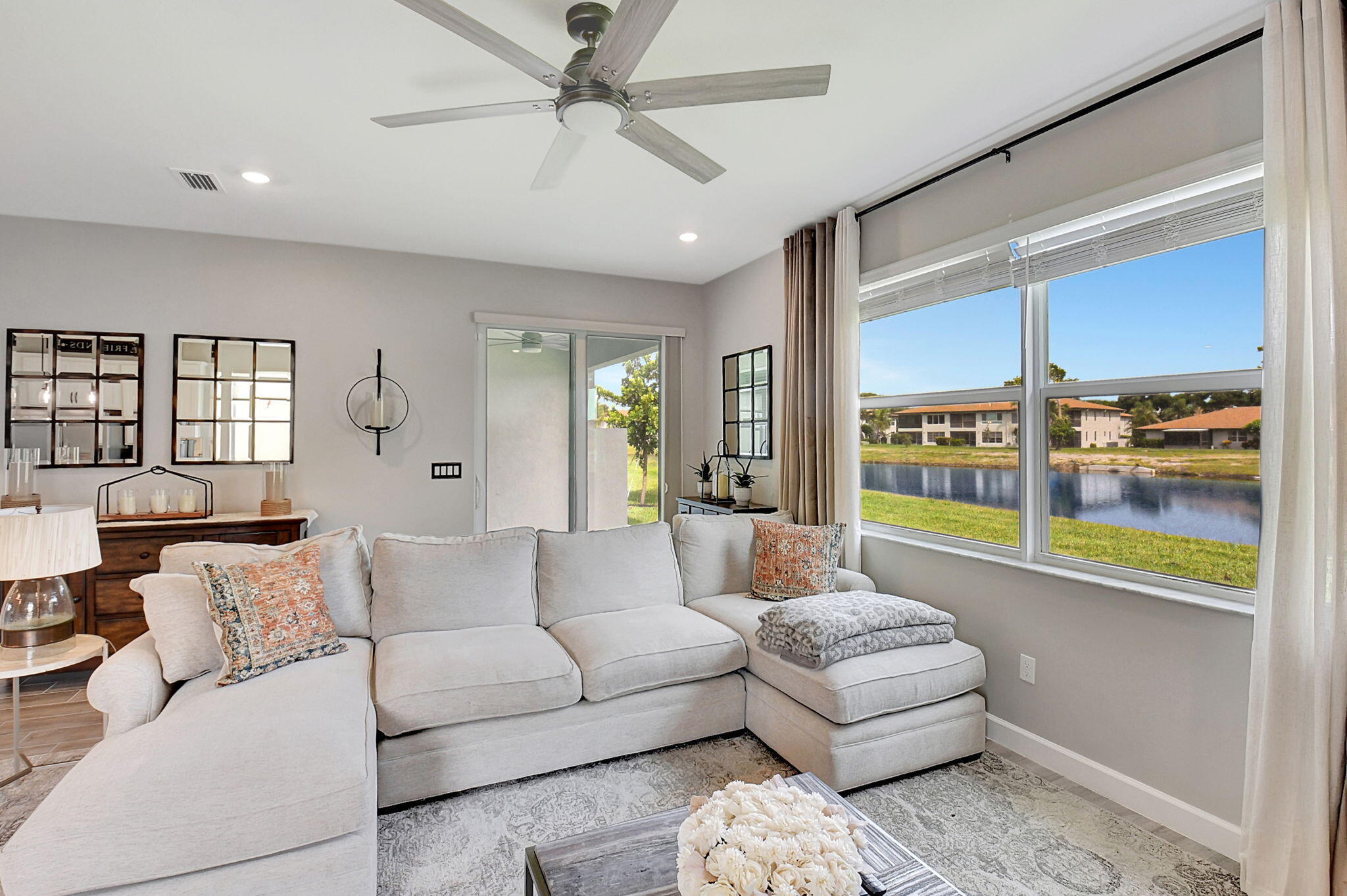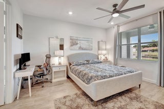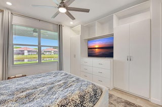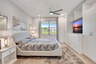 Fantastic opportunity to own this elegant NOW VACANT home with a lakefront view in active 55+ community with luxury amenities, just minutes to the beach, boutiques, and dining on the Ave, or charming Pineapple Grove. Lightly lived in seasonal home impeccably cared for is beautifully appointed with designer upgrades including porcelain tile, custom mirror backsplash, glass entry, a current palate; and practical ones like full impact windows that fill the home with light without excess solar gain. Enjoy the best of Florida living with 3 resort style pools, clubhouse, fitness facility, restaurant, tennis, and pickleball. Sidewalks and street lights offer a walkable community and this home's ideal location places you a short stroll to the amenities. See docs for more upgrades and features.