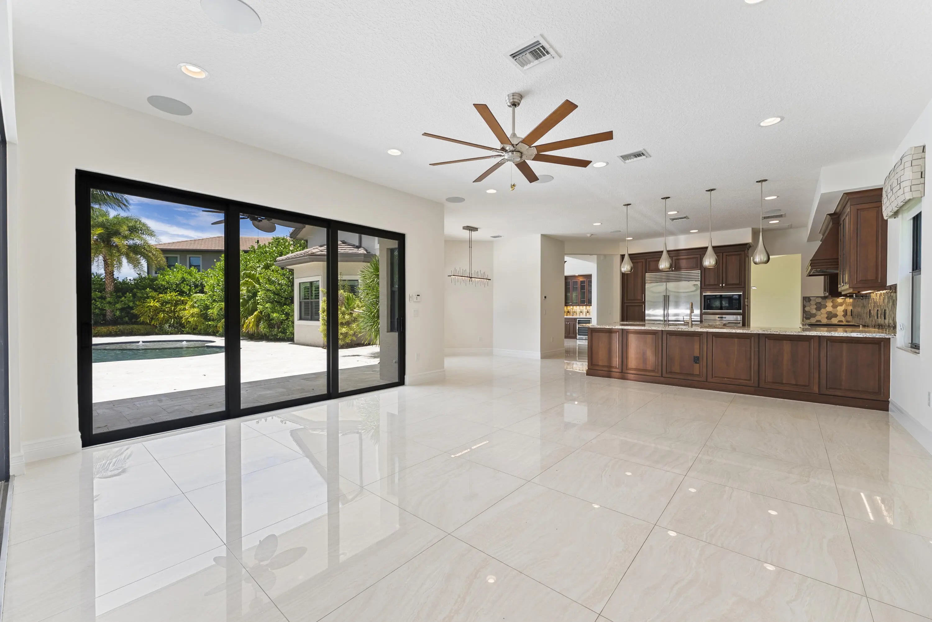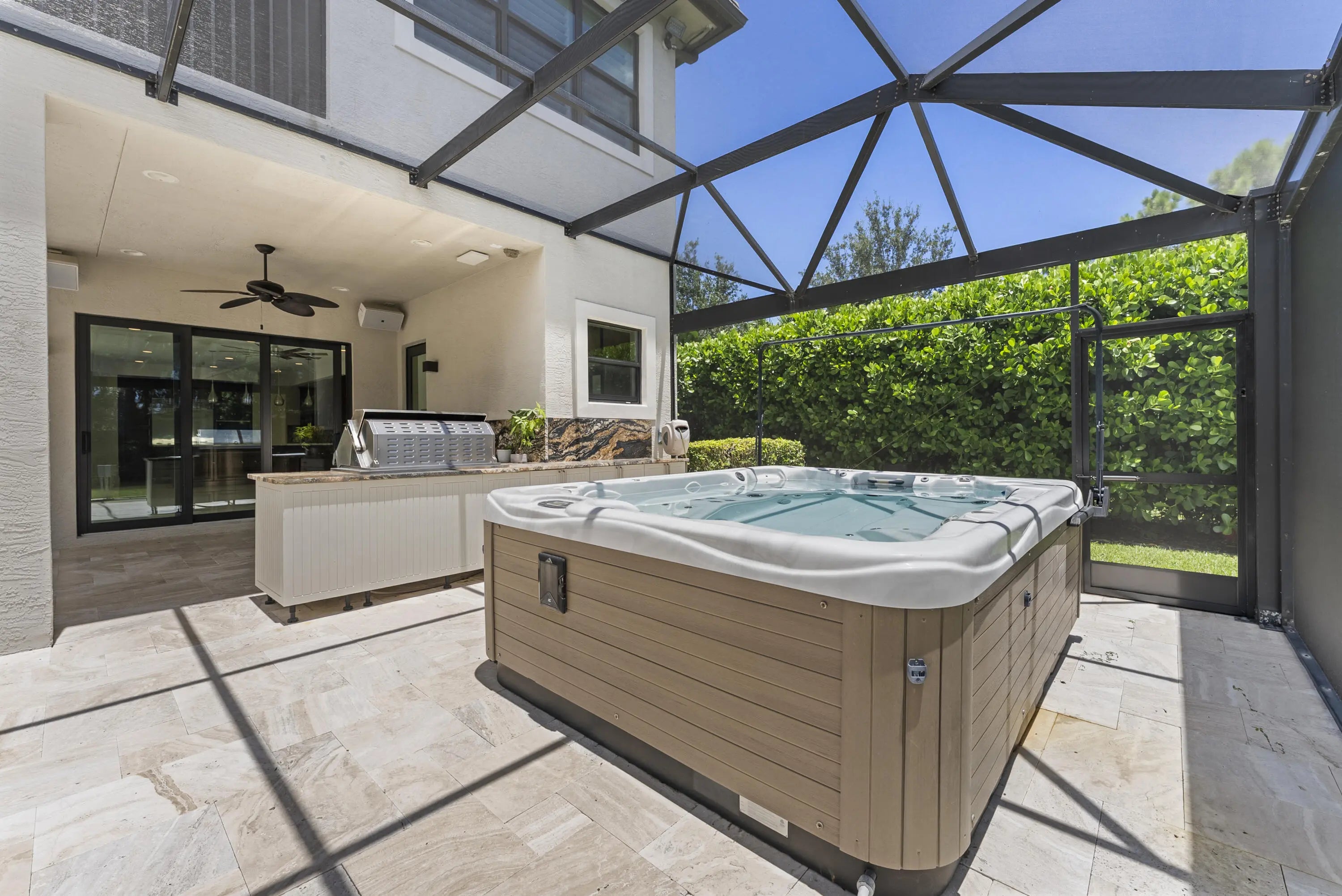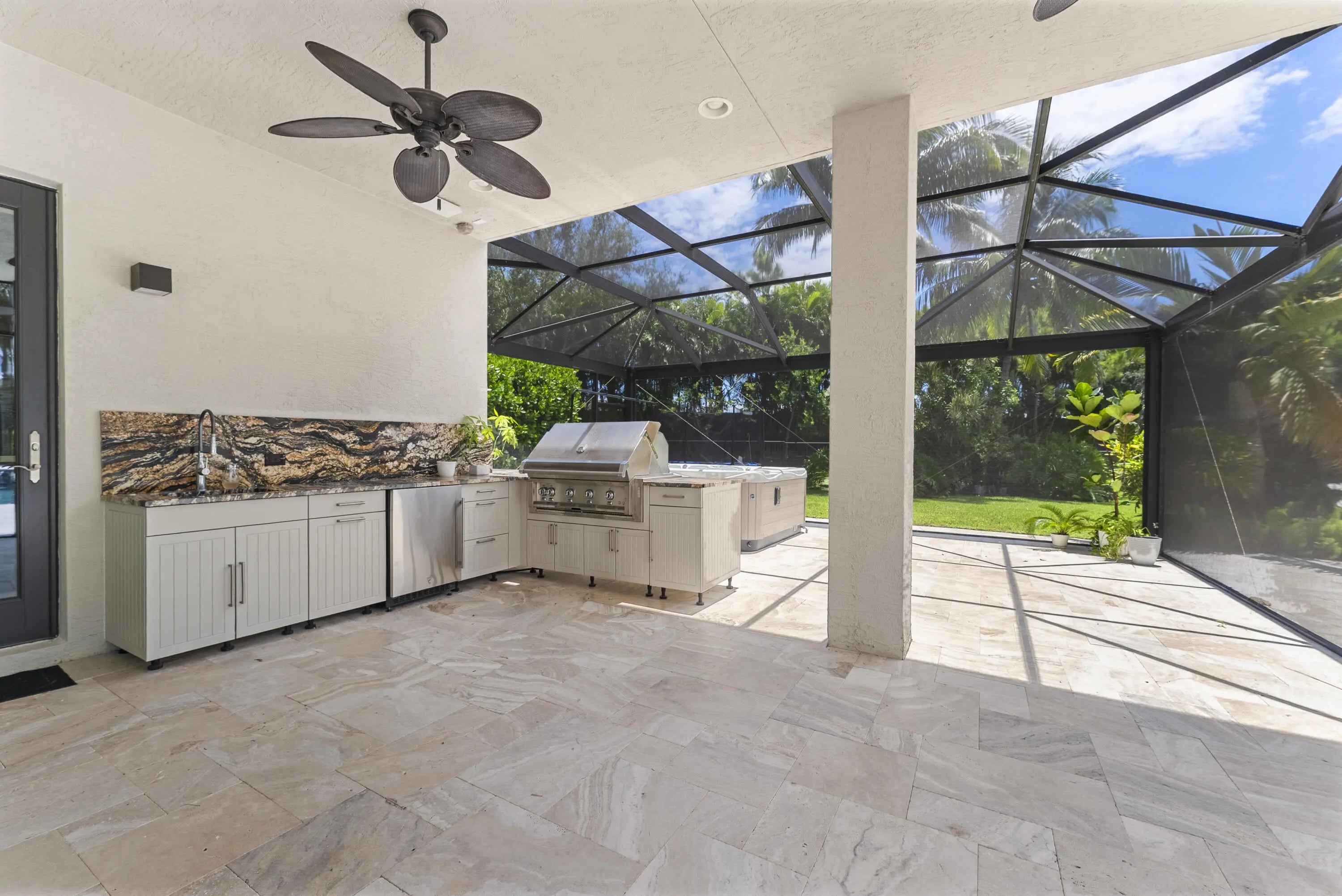 Auto Sprinkler, Built-in Grill, Covered Balcony, Custom Lighting, Fence, Fruit Tree(s), Open Patio, Screened Patio, Summer Kitchen