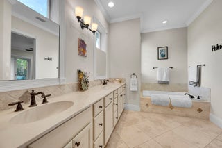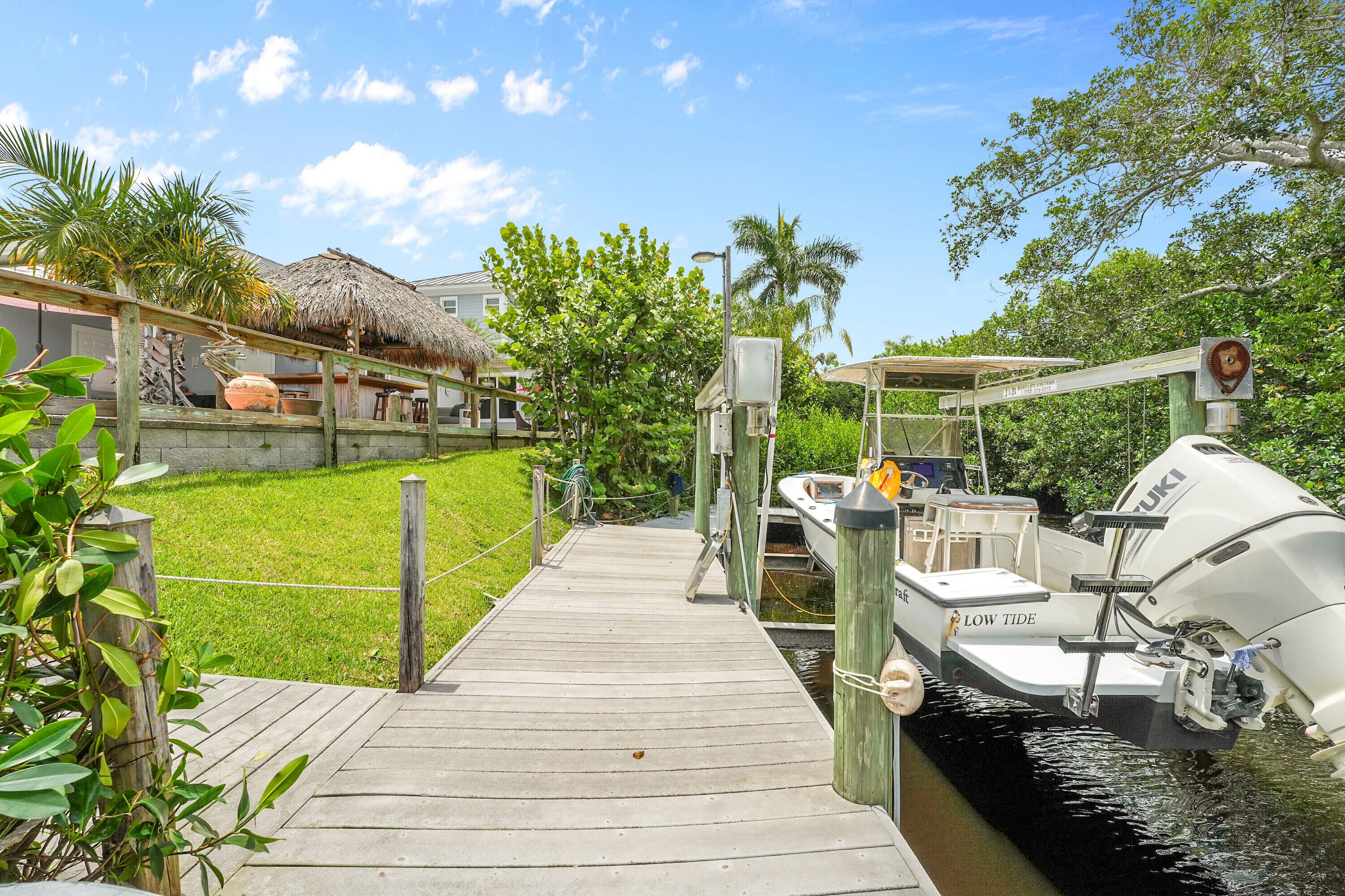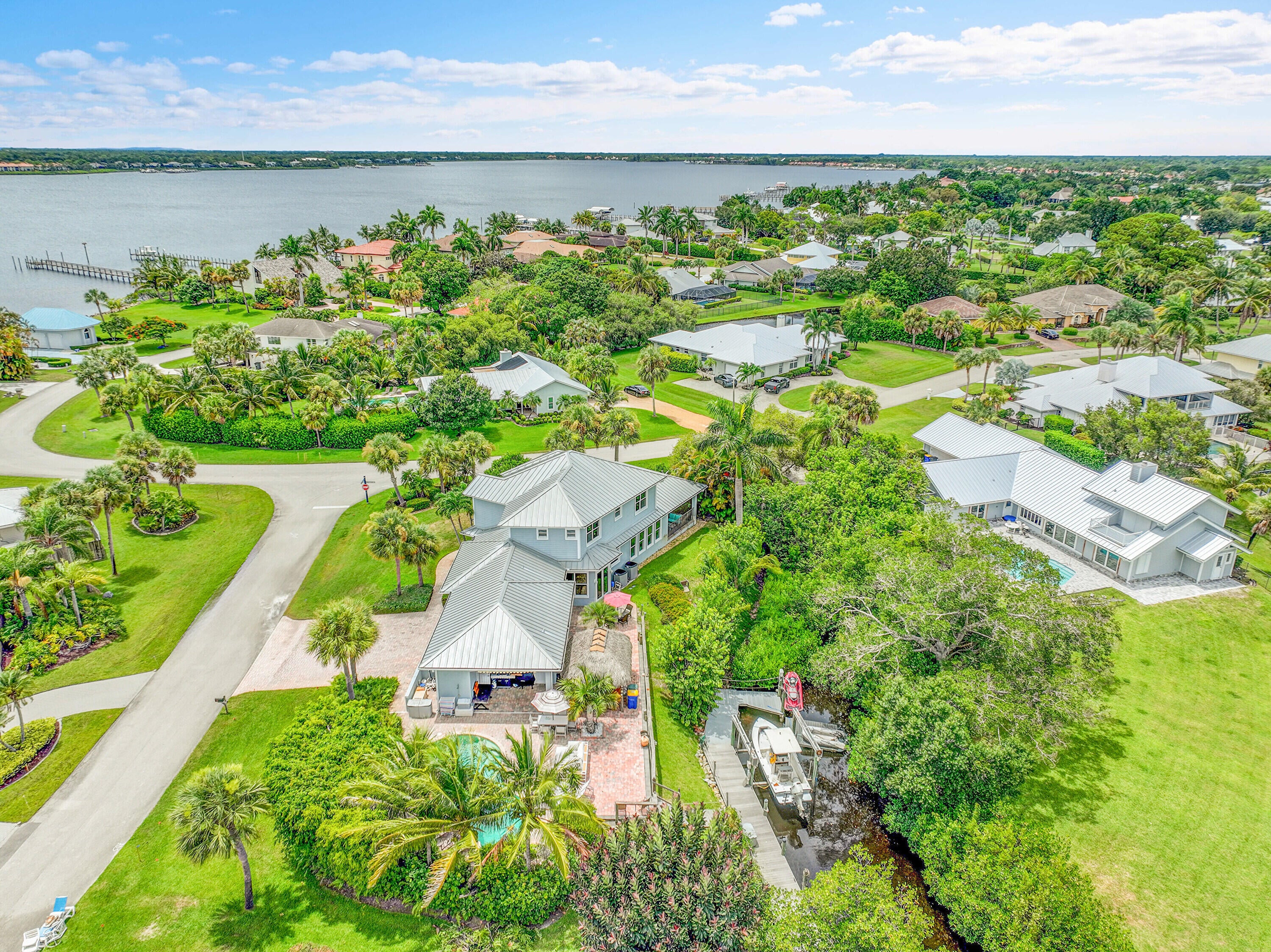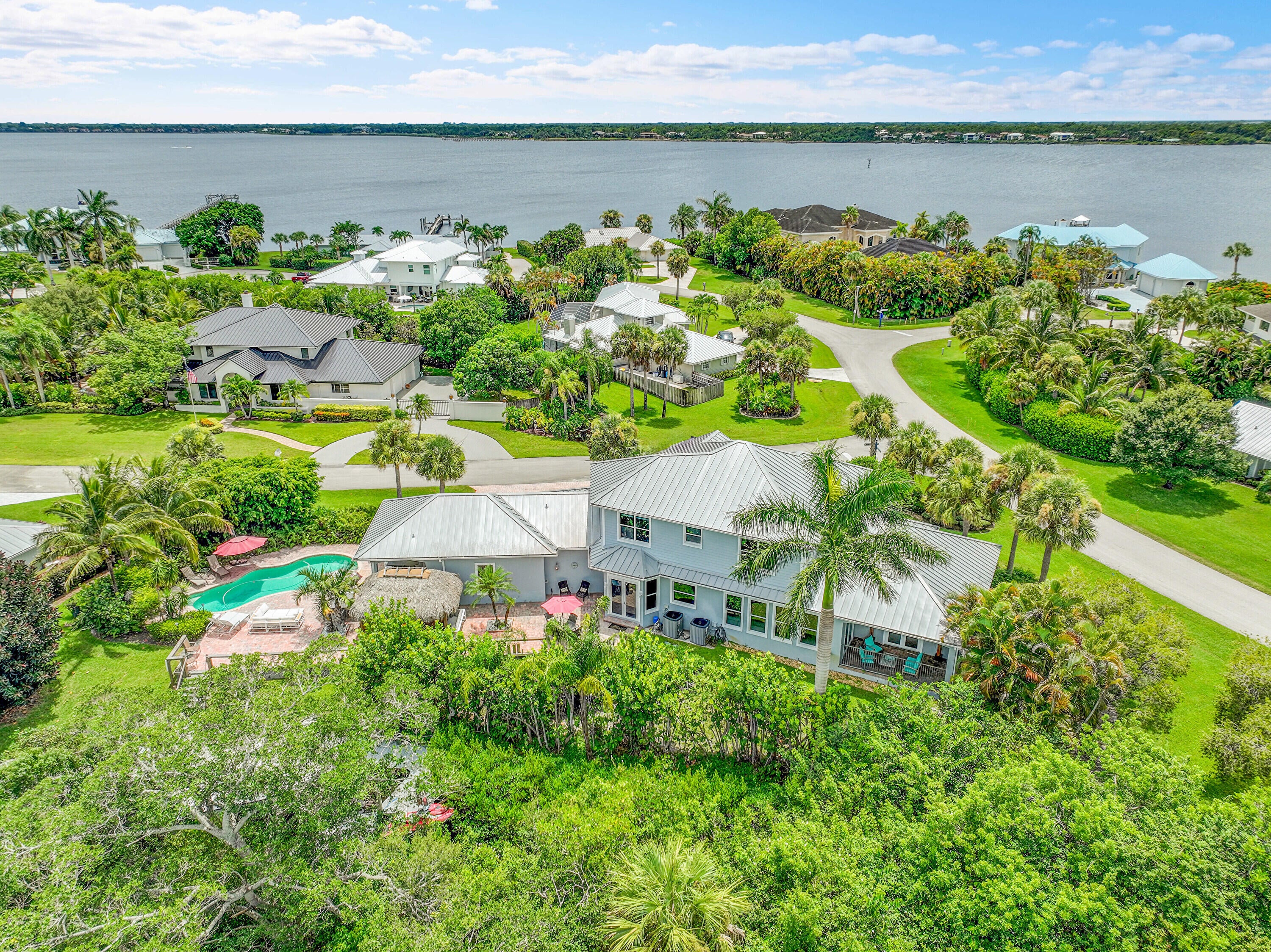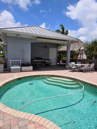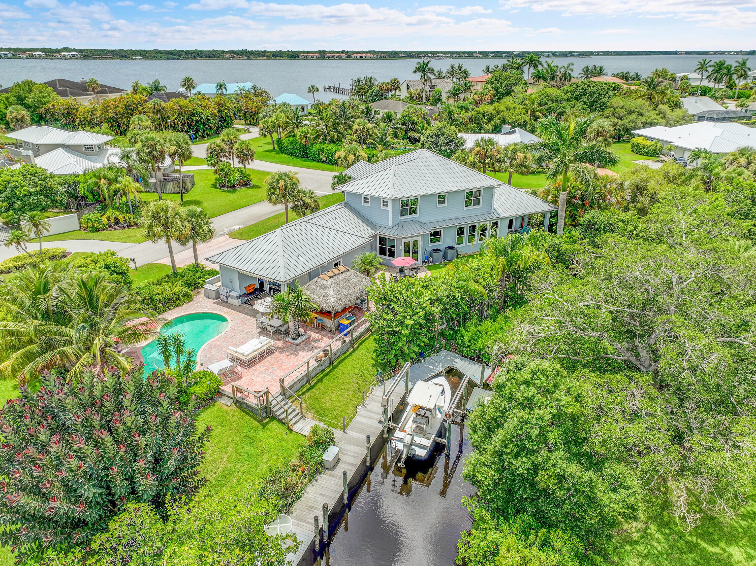 Boat enthusiasts that enjoy entertaining this custom built luxurious waterfront home has everything you need. interior of this home has custom woodwork that accents high ceilings and distinctive stairway. Bright and airy open plan is surrounded with multiple oversized windows. For the chef in the family an oversized 24x17 kitchen w/ island & breakfast nook. French doors that open to patio water view, Tiki Hut & Pool area. Only steps to Dock w/ Boat Lift. Three car Garage equipped with Charging Station. Large Master bedroom 1st floor & ensuite has it's own covered private patio. Upstairs Three bedrooms with a sitting area have gorgeous Mahogany wood floors. Keep the lights on with a Whole house generator. A must see to appreciate. Never so much for this price. Small Privet Community ...