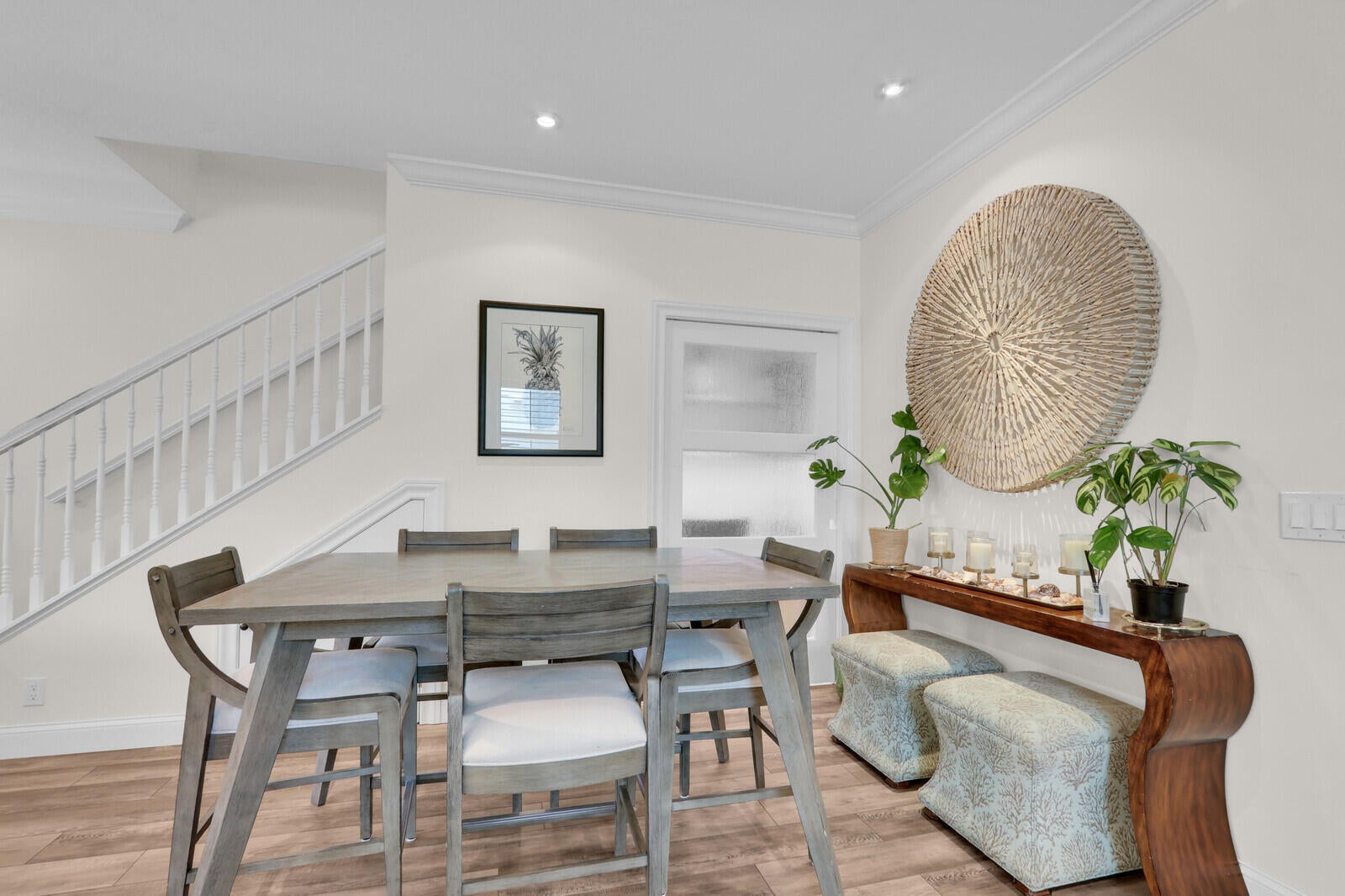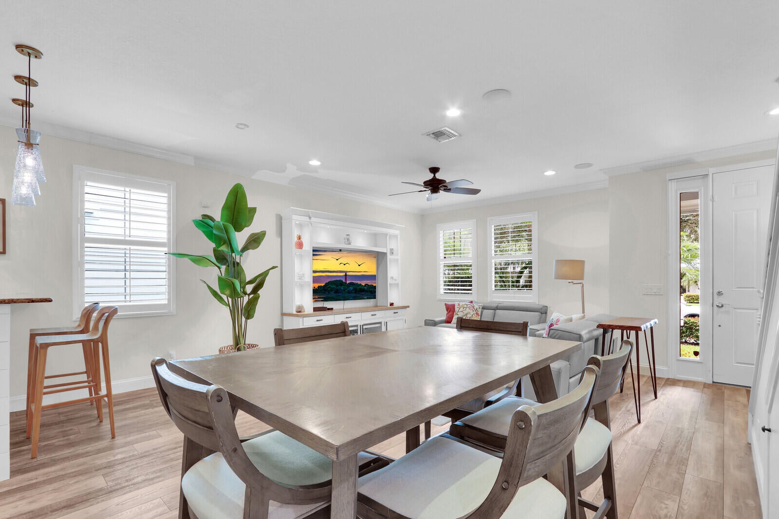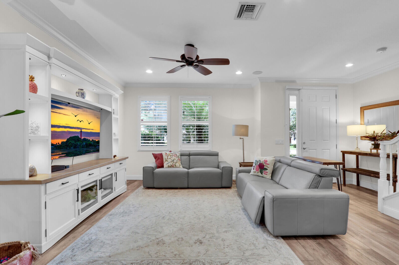 Beautifully upgraded, corner townhome is offered as an unfurnished or furnished ($4,000/month), annual rental in highly desirable Abacoa Windsor Park community boasting a coastal-vibe, remodeled guest bathroom with deep soaker tub, remodeled under stairwell converted to office with counter space and filing system drawers separated by beautiful sliding glass door, additional storage space with door passage under stairwell, crown molding and high baseboard, plantation shutters, light wood vinyl flooring, kitchen undermount lighting, surround sound speakers and wiring, insta-hot tankless water heater in garage for space and energy conservation, plus additional recess and accent lighting in living room. Ceiling fans in every room and ADT security system monitoring included