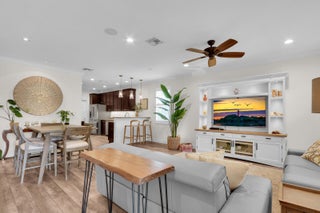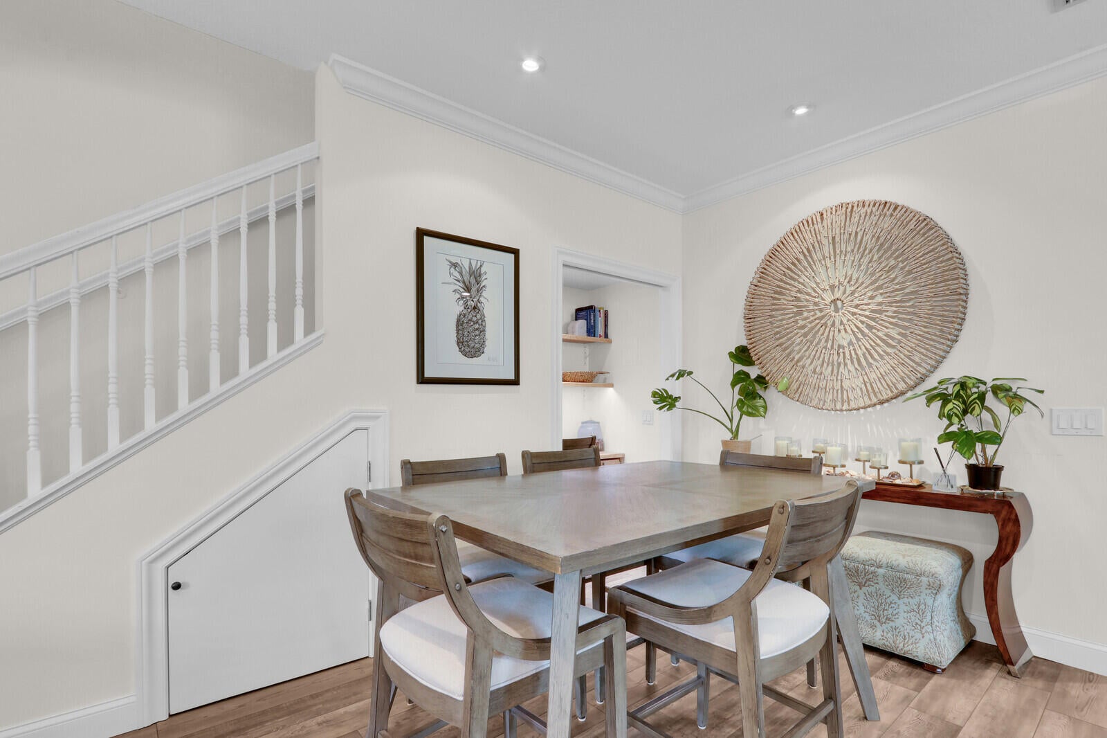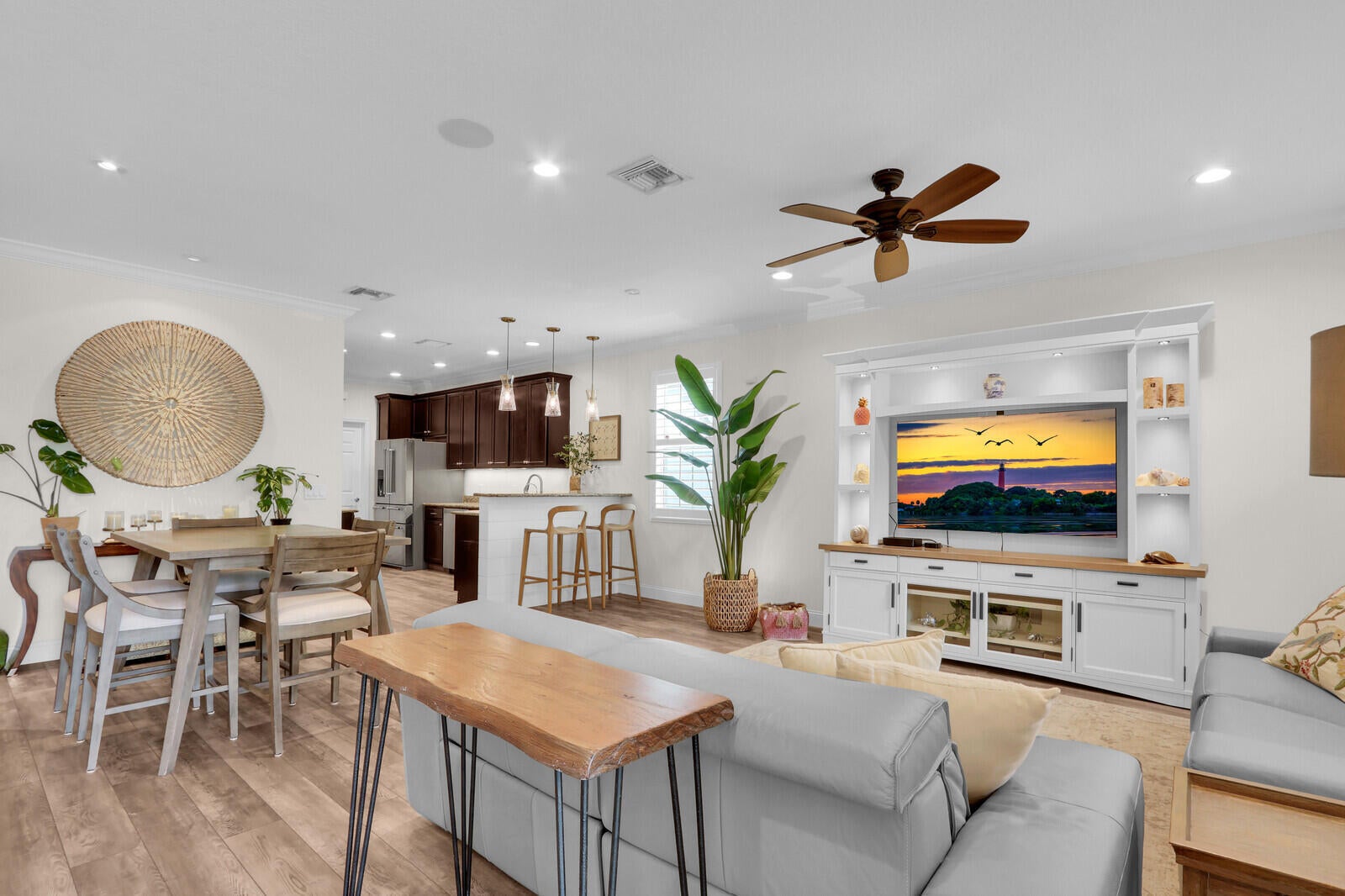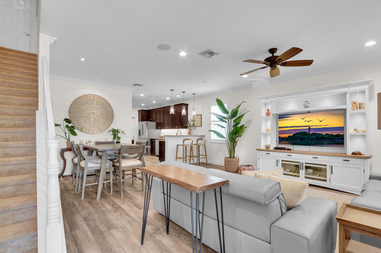Beautifully upgraded, corner townhome is offered as an unfurnished or furnished ($4,000/month), annual rental in highly desirable Abacoa Windsor Park community boasting a coastal-vibe, remodeled guest bathroom with deep soaker tub, remodeled under stairwell converted to office with counter space and filing system drawers separated by beautiful sliding glass door, additional storage space with door passage under stairwell, crown molding and high baseboard, plantation shutters, light wood vinyl flooring, kitchen undermount lighting, surround sound speakers and wiring, insta-hot tankless water heater in garage for space and energy conservation, plus additional recess and accent lighting in living room. Ceiling fans in every room and ADT security system monitoring included