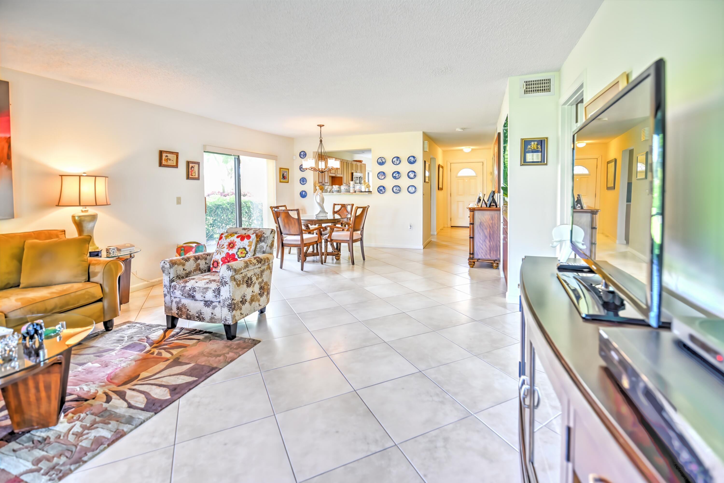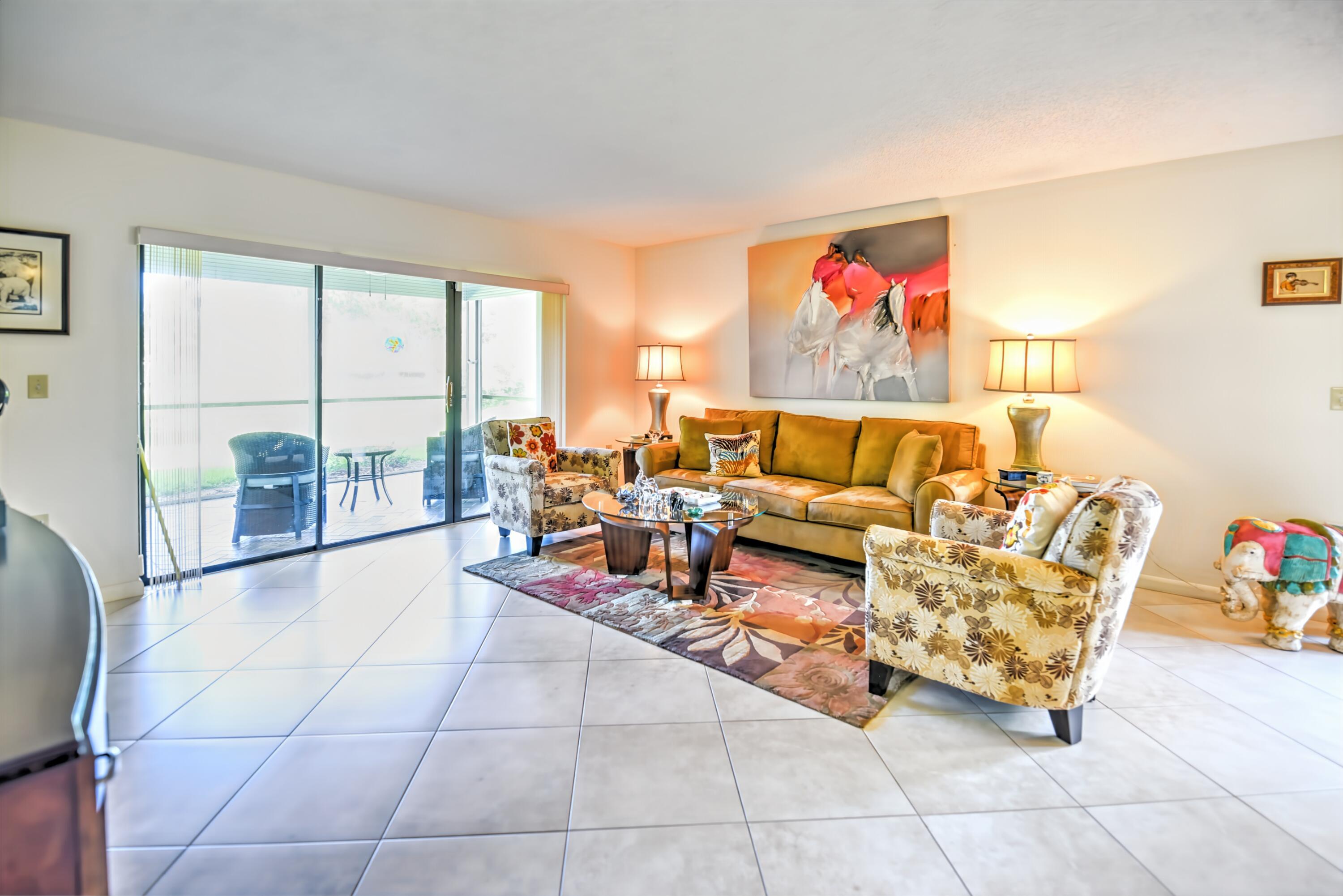 Welcome to Hunters Run . The club has every amenity for perfect resort living. Play our 3 18 hole golf courses, pickleball, tennis, fitness center, 7 dining venues and the friendliest members in south Florida. Something all day to put a smile on your face!!!! Lovely main level corner unit on the golf course with a side patio for golf cart and barbeque dining. Includes 2 bedrooms and 2 baths, dining area , eat in kitchen and screened lanai. Furnished and ready for you.