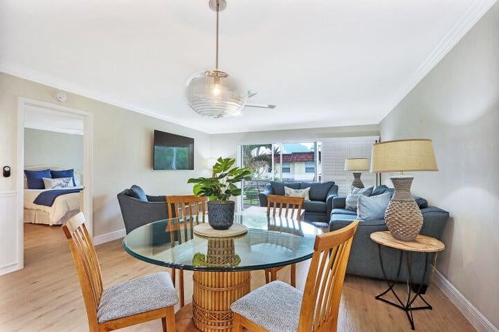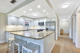 Annual Furnished Rental - $3,500! Perfectly Furnished 3 bedroom, 2 bath, 2nd fl condo available for annual lease. Renovated kitchen for open floor plan, stainless steel appliances, granite counters, vinyl flooring throughout with both bathrooms upgraded as well. Access to screened lanai from Main Bedroom and Living room to enjoy the garden view. Main bedroom has a king bed, 2nd bedroom has a queen and 3rd bedroom has 2 twins. Villas on the Green has a heated pool, tennis courts and private entrance to Carlin Park and the heart trail. You just need to bring your suit and flip flops so you can walk to the beach.