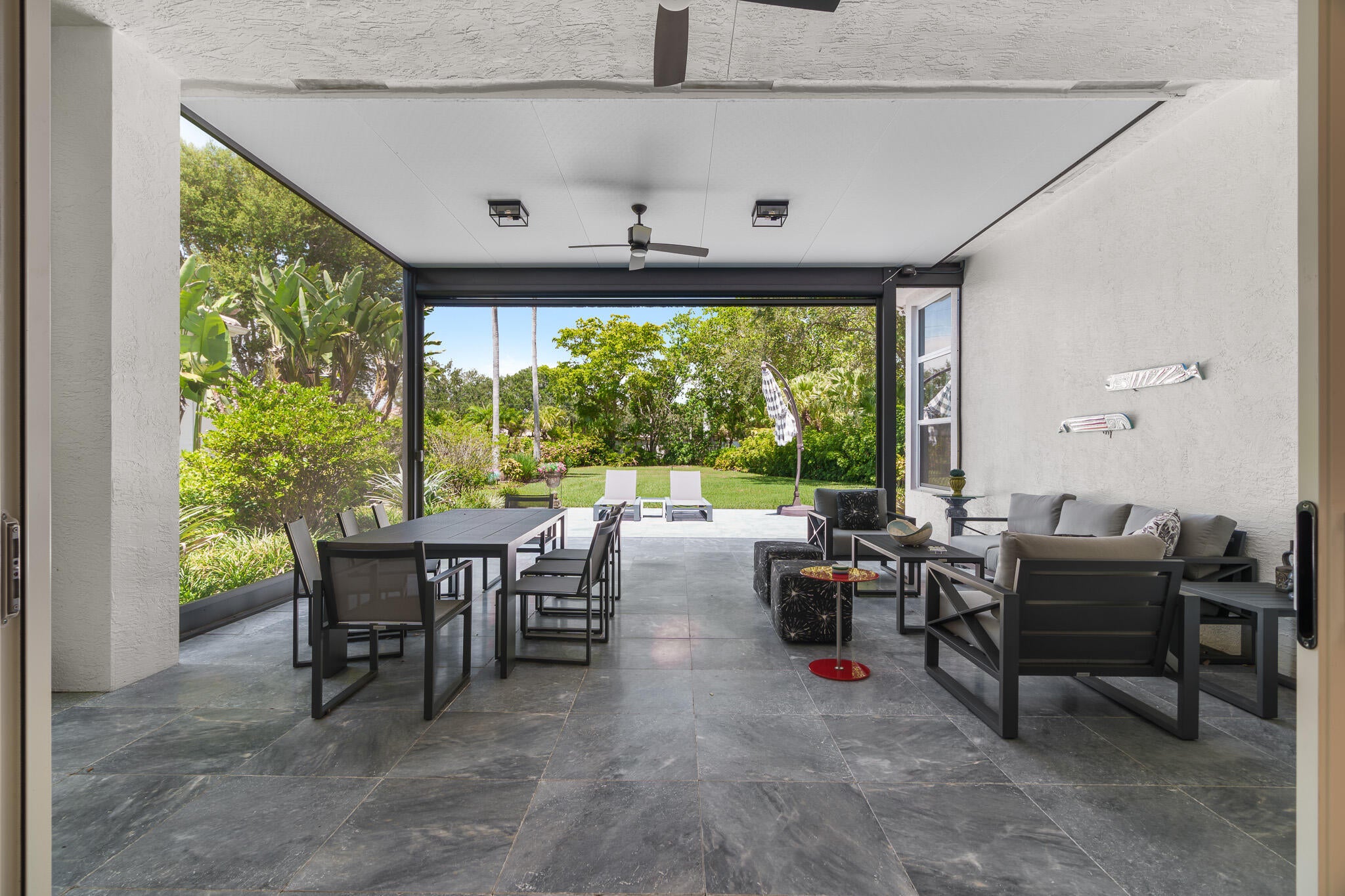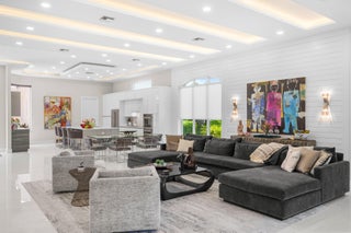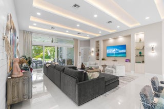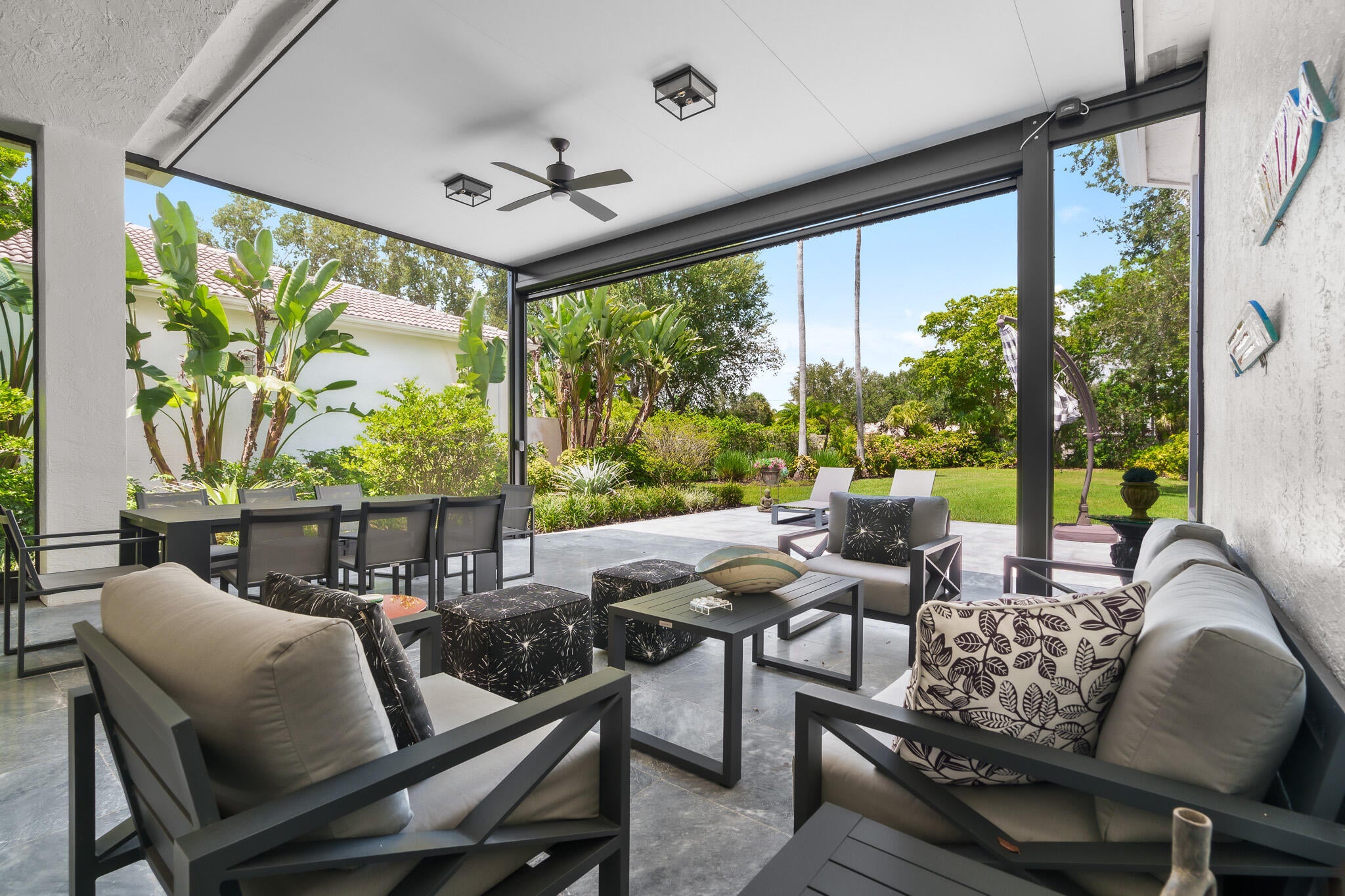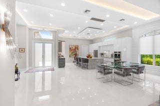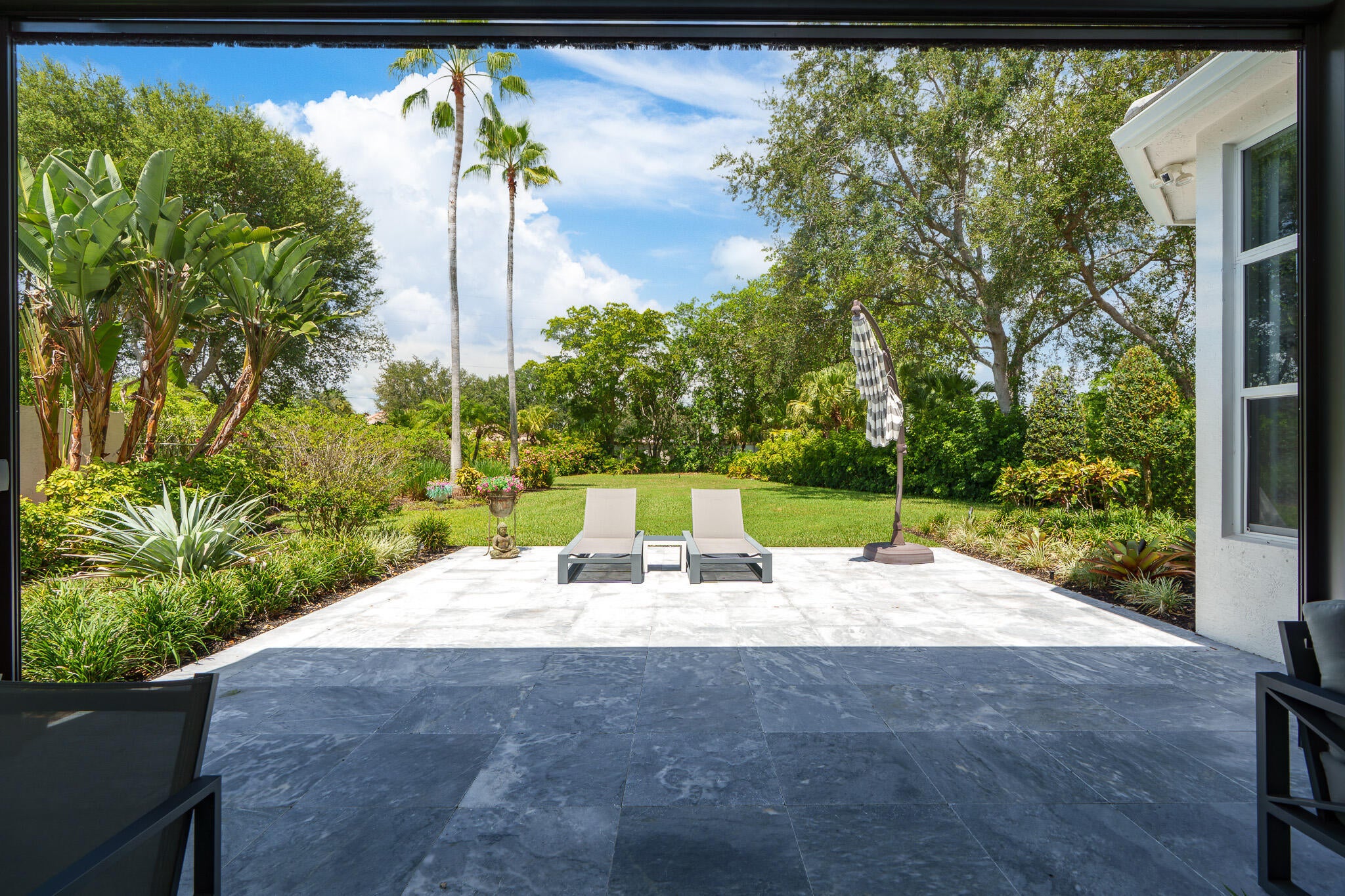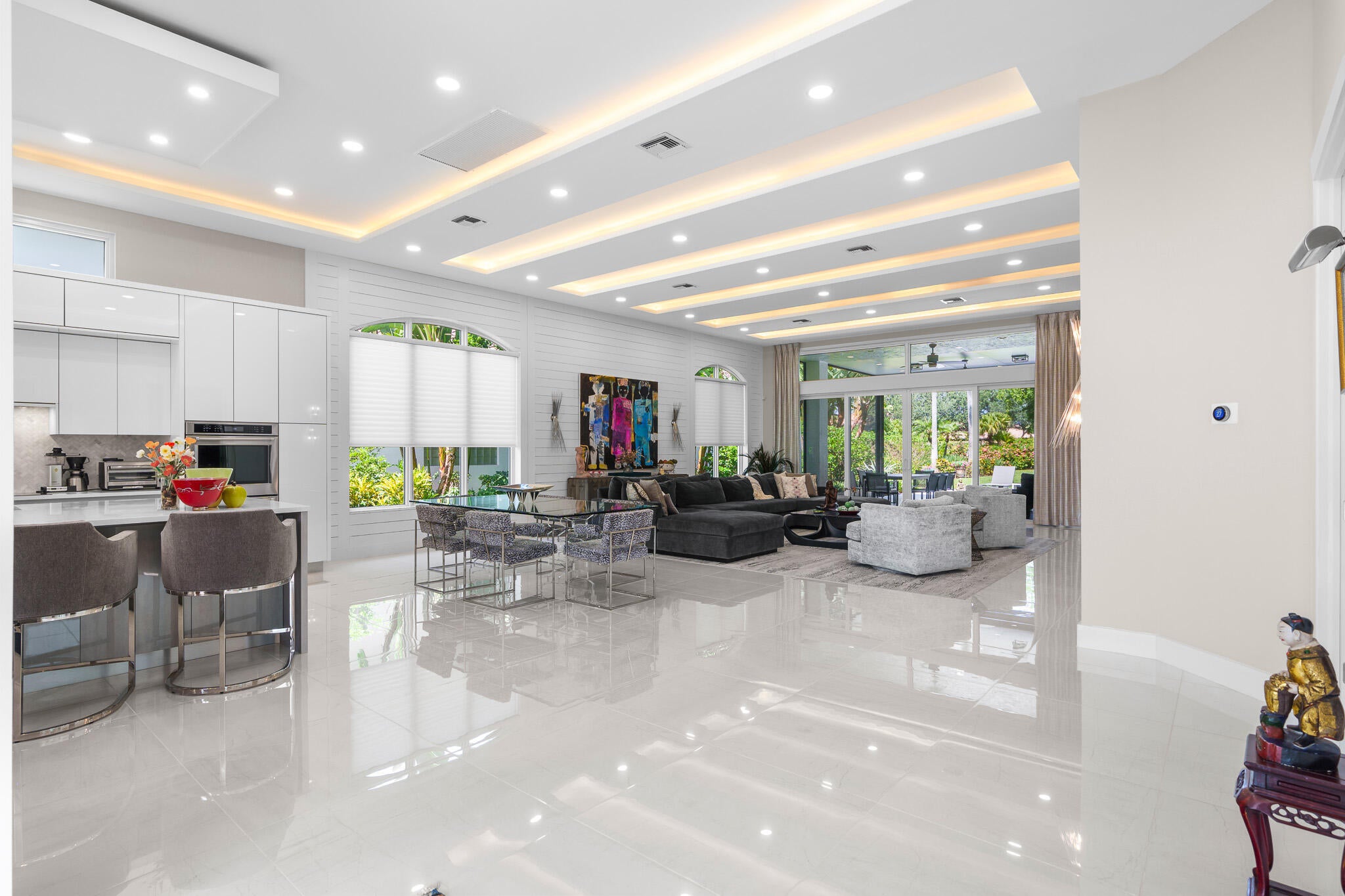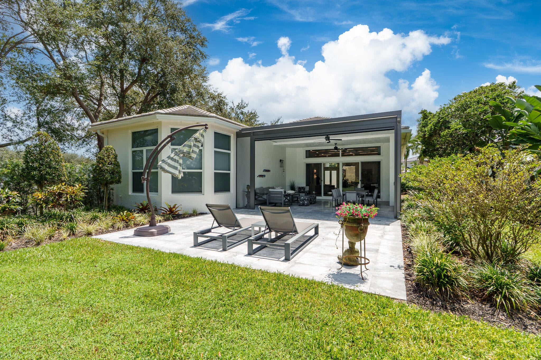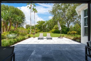 Immaculate and move in ready one level dream home. Completely renovated and professionally designed, this exceptional residence showcases an open floor plan filled with natural light, porcelain tile flooring throughout--including closets and the laundry room--and a design that balances elegance with comfort. The chef's kitchen features high-end KitchenAid and Wolf appliances, a convection stove, a large island, & floor-to-ceiling storage, creating a perfect combination of beauty & function. Situated on a sprawling & private lot on nearly one-third of an acre, the home offers both rare space and seclusion.The outdoor living areas are a true highlight, featuring an extended patio with marble flooring, a 22' x 22' pergola with remote-controlled retract. Newer flat tile roof and much more!