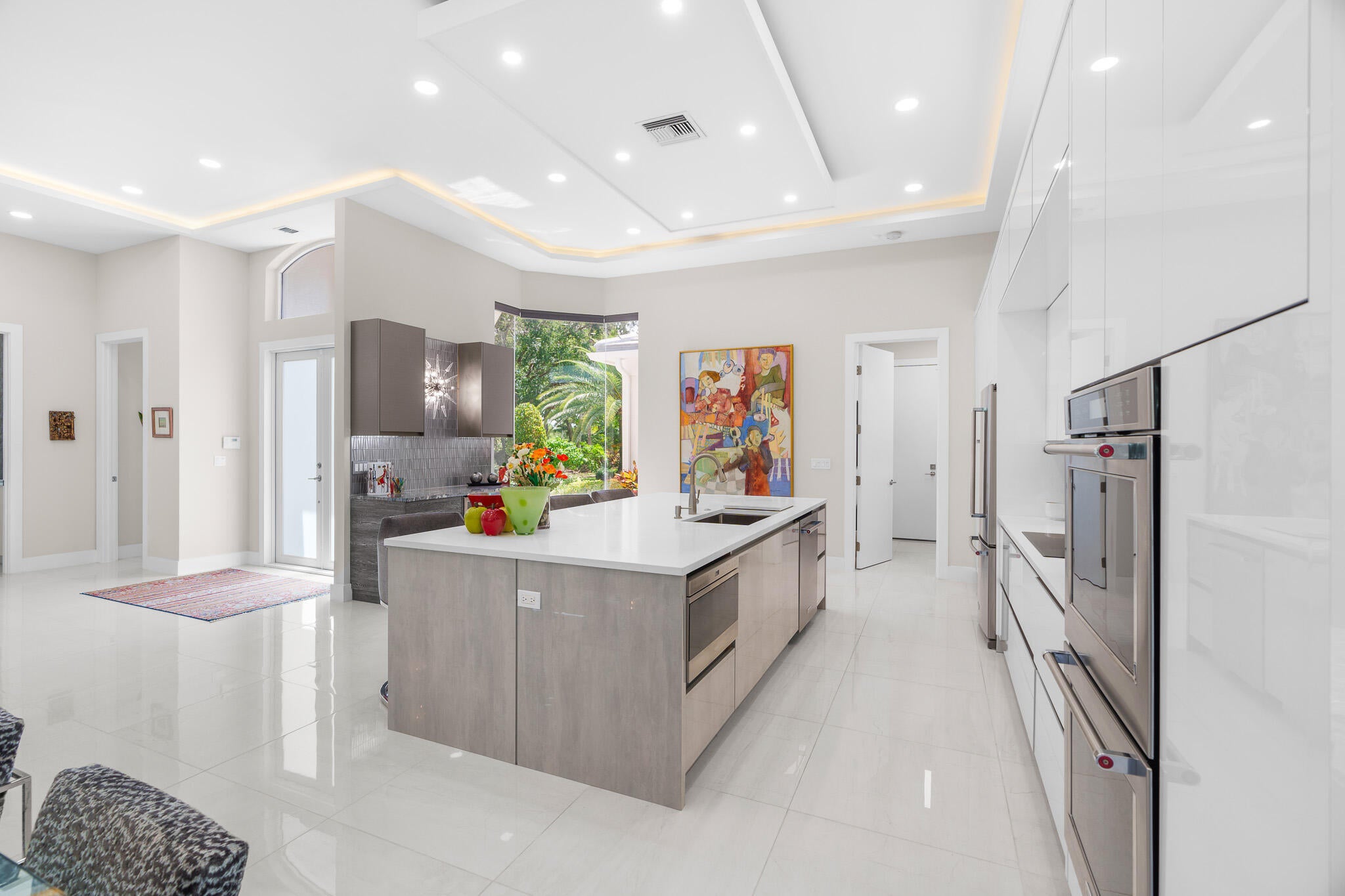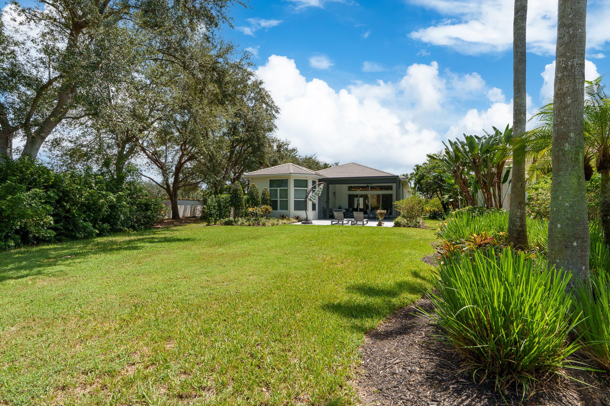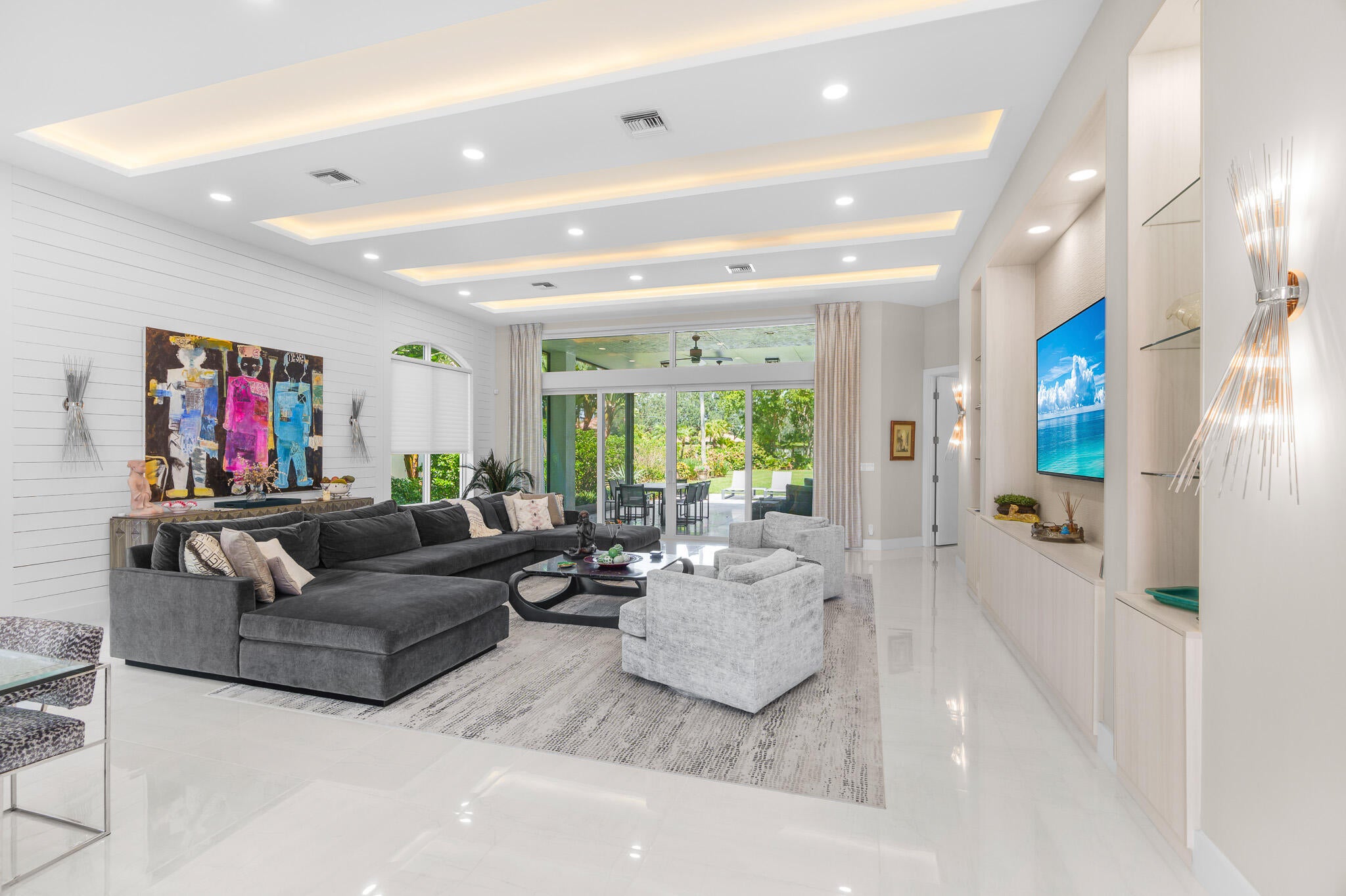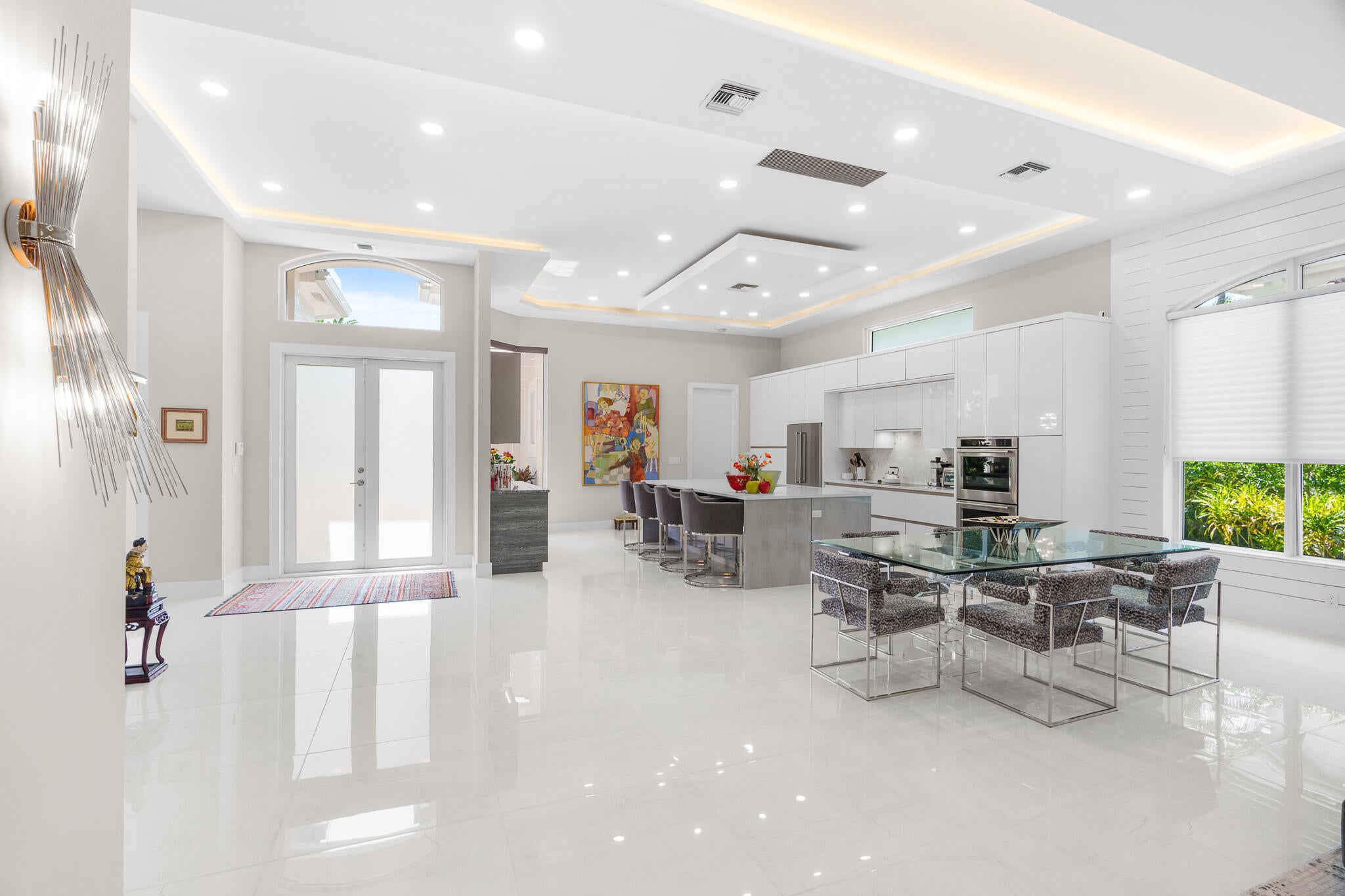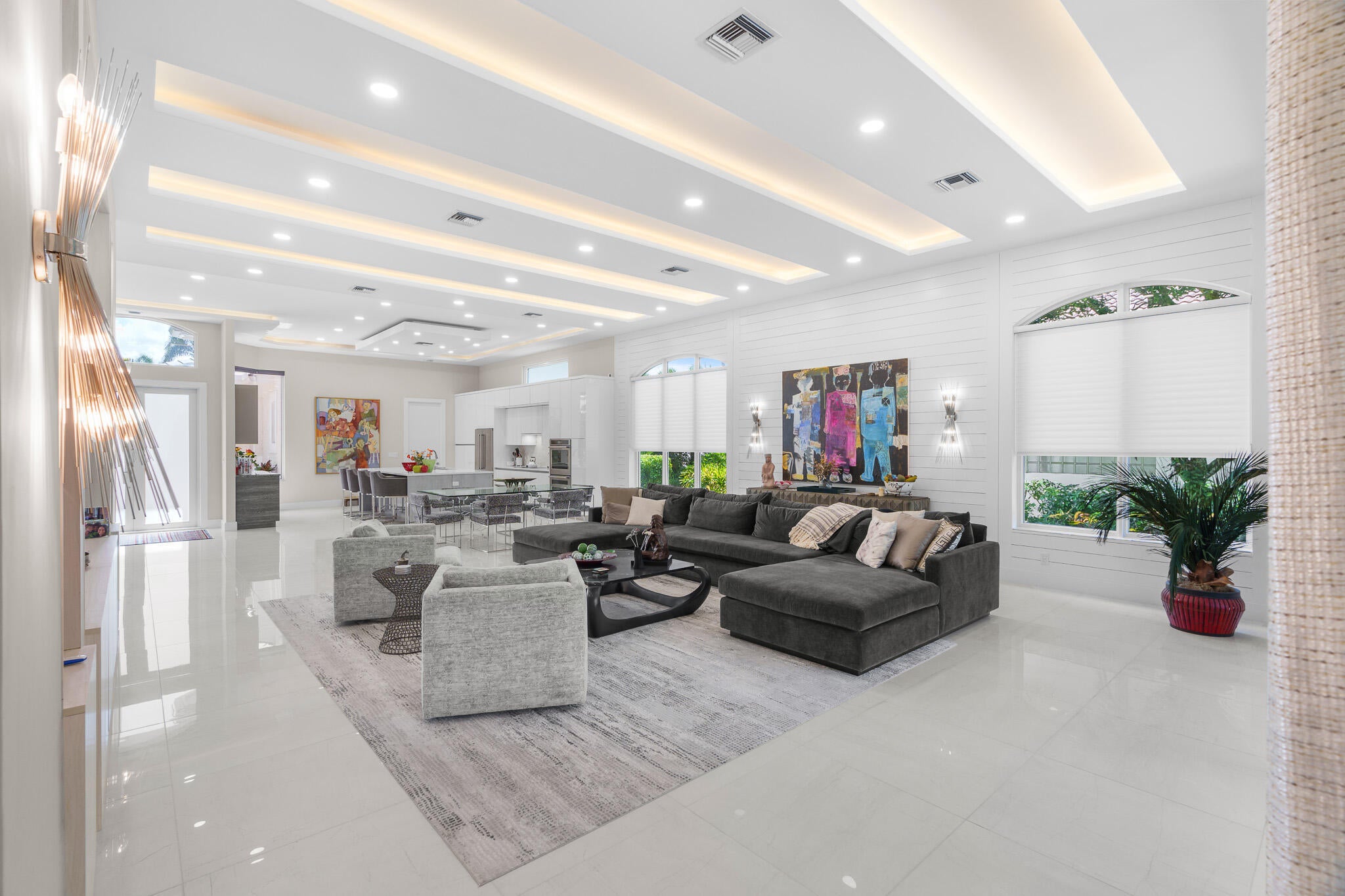 Immaculate and move in ready one level dream home. Completely renovated and professionally designed, this exceptional residence showcases an open floor plan filled with natural light, porcelain tile flooring throughout--including closets and the laundry room--and a design that balances elegance with comfort. The chef's kitchen features high-end KitchenAid and Wolf appliances, a convection stove, a large island, & floor-to-ceiling storage, creating a perfect combination of beauty & function. Situated on a sprawling & private lot on nearly one-third of an acre, the home offers both rare space and seclusion.The outdoor living areas are a true highlight, featuring an extended patio with marble flooring, a 22' x 22' pergola with remote-controlled retract. Newer flat tile roof and much more!