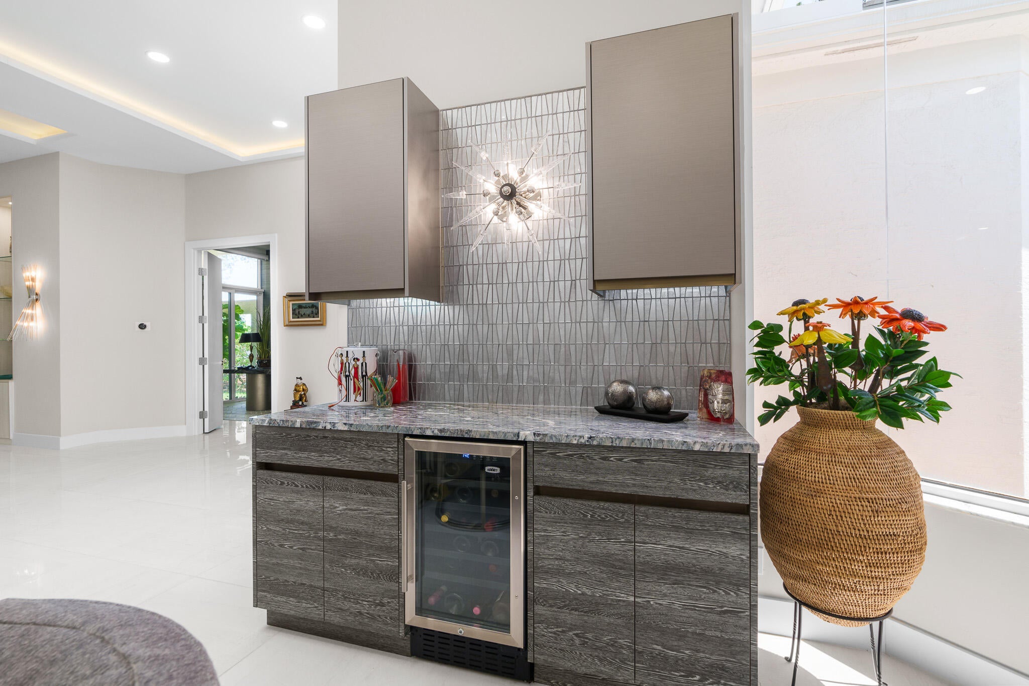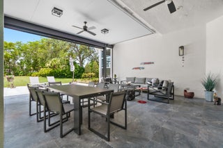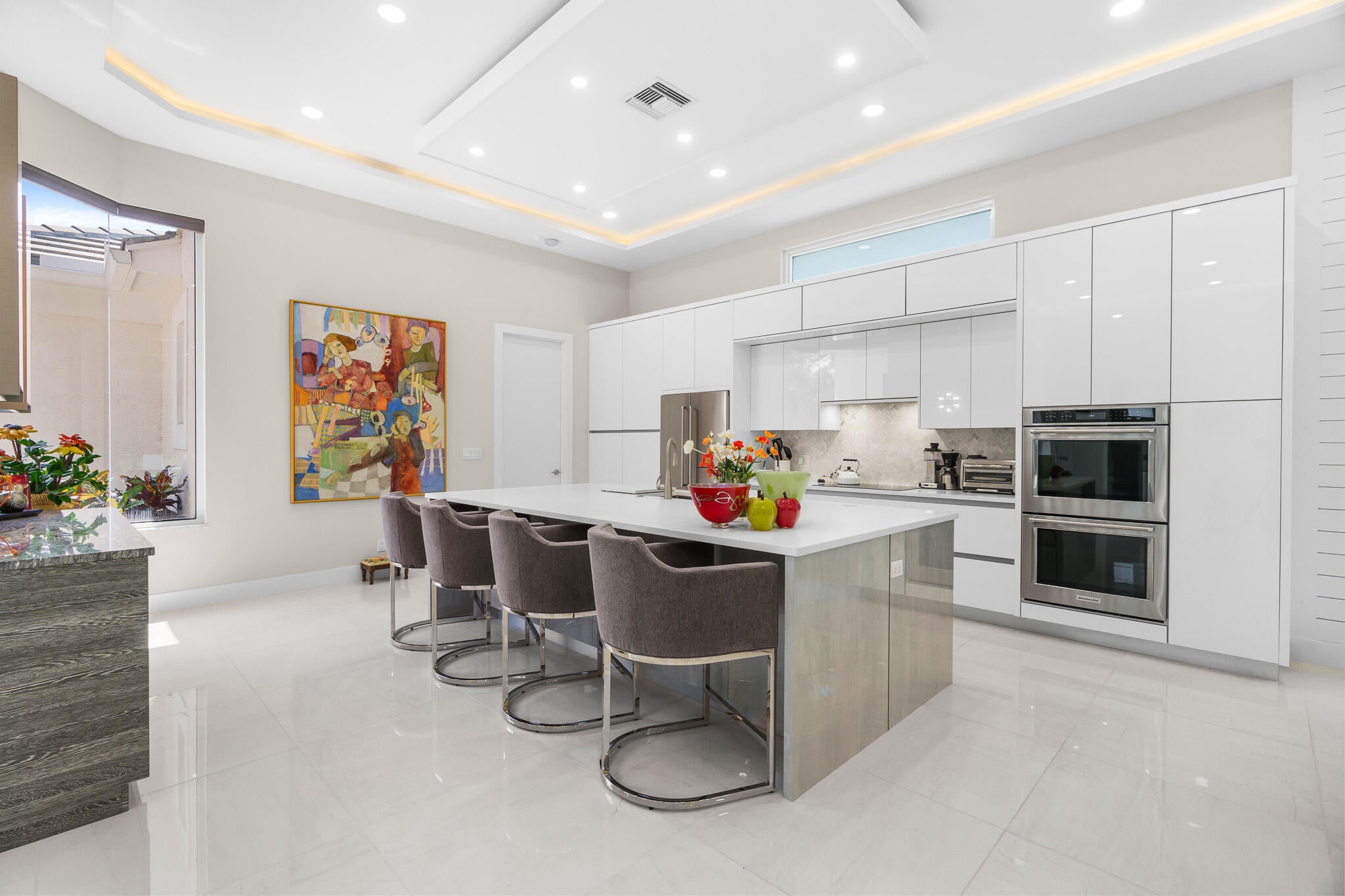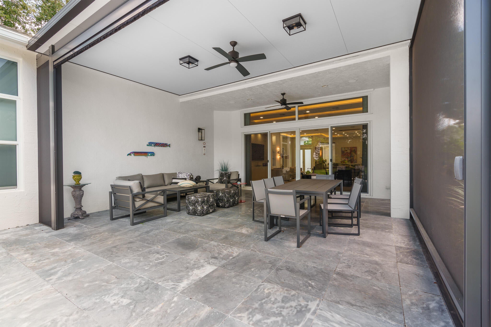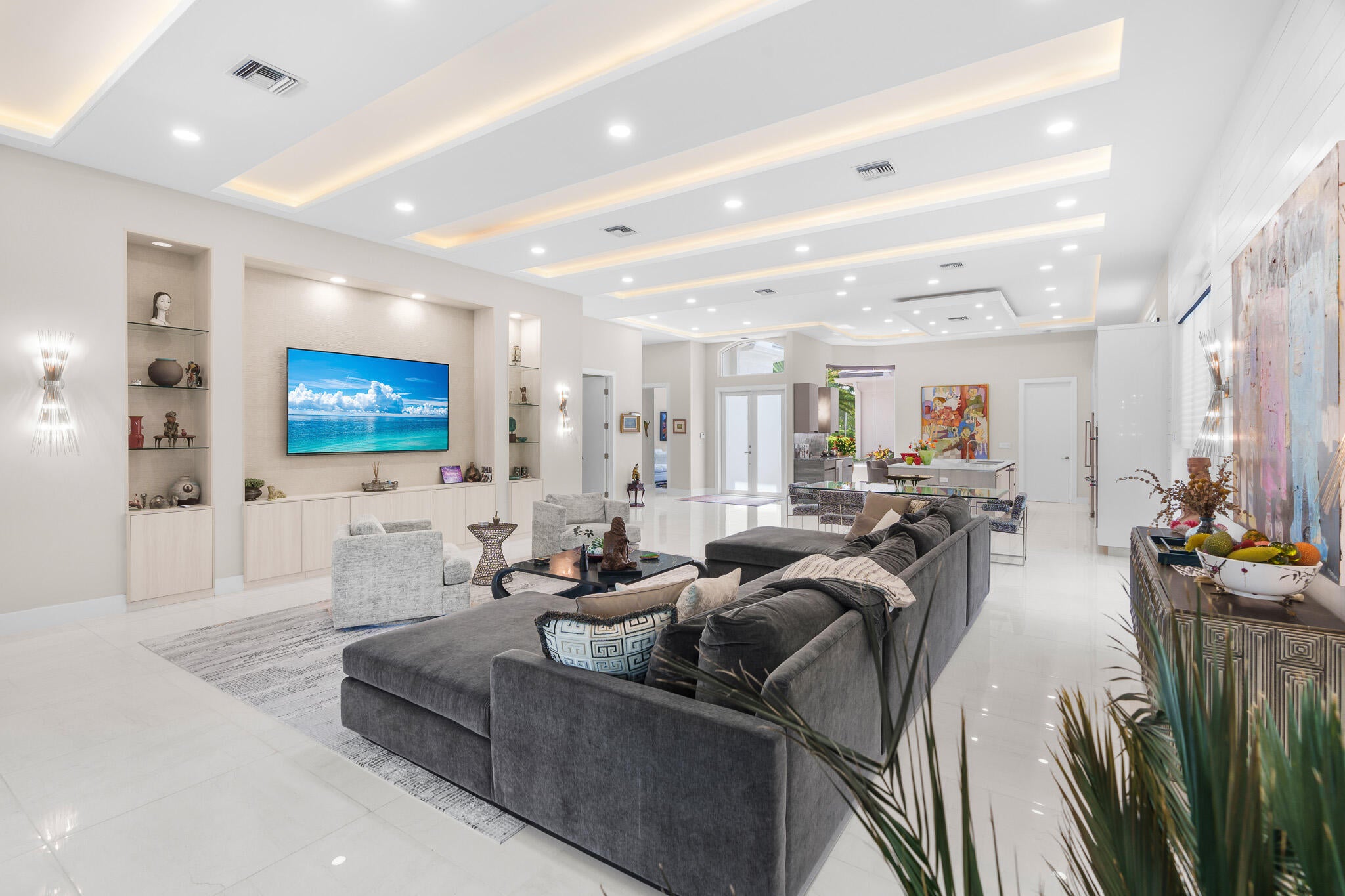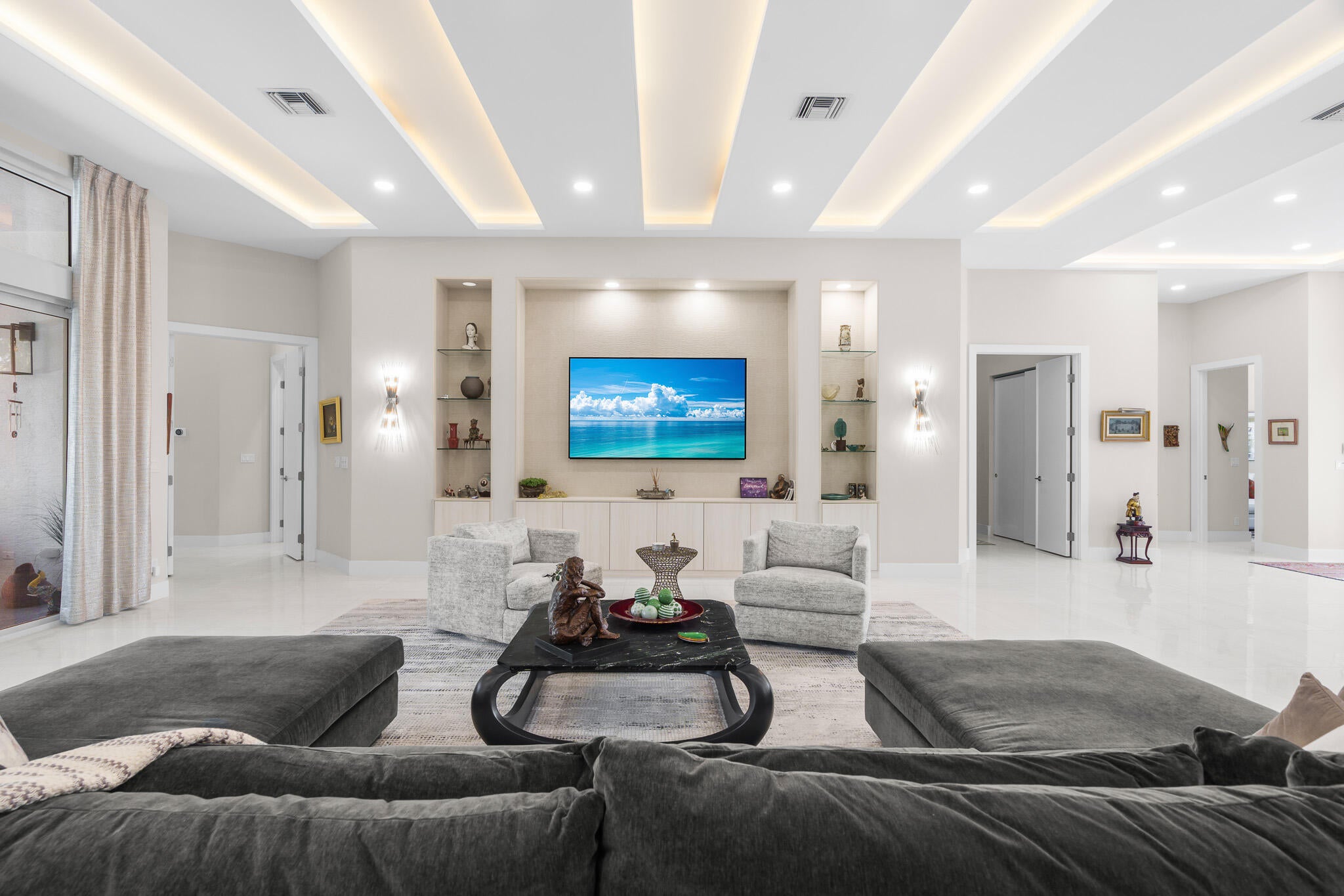 Immaculate and move in ready one level dream home. Completely renovated and professionally designed, this exceptional residence showcases an open floor plan filled with natural light, porcelain tile flooring throughout--including closets and the laundry room--and a design that balances elegance with comfort. The chef's kitchen features high-end KitchenAid and Wolf appliances, a convection stove, a large island, & floor-to-ceiling storage, creating a perfect combination of beauty & function. Situated on a sprawling & private lot on nearly one-third of an acre, the home offers both rare space and seclusion.The outdoor living areas are a true highlight, featuring an extended patio with marble flooring, a 22' x 22' pergola with remote-controlled retract. Newer flat tile roof and much more!