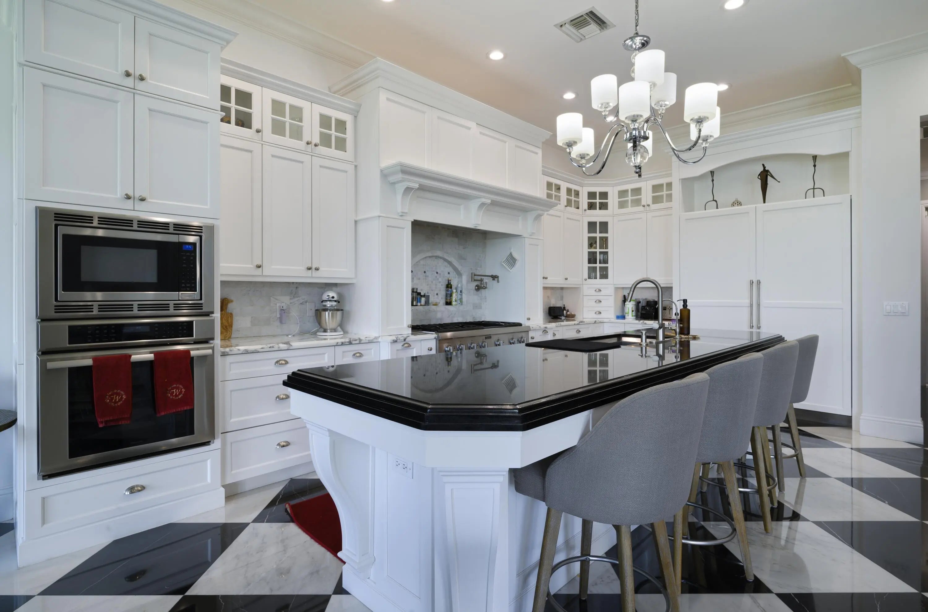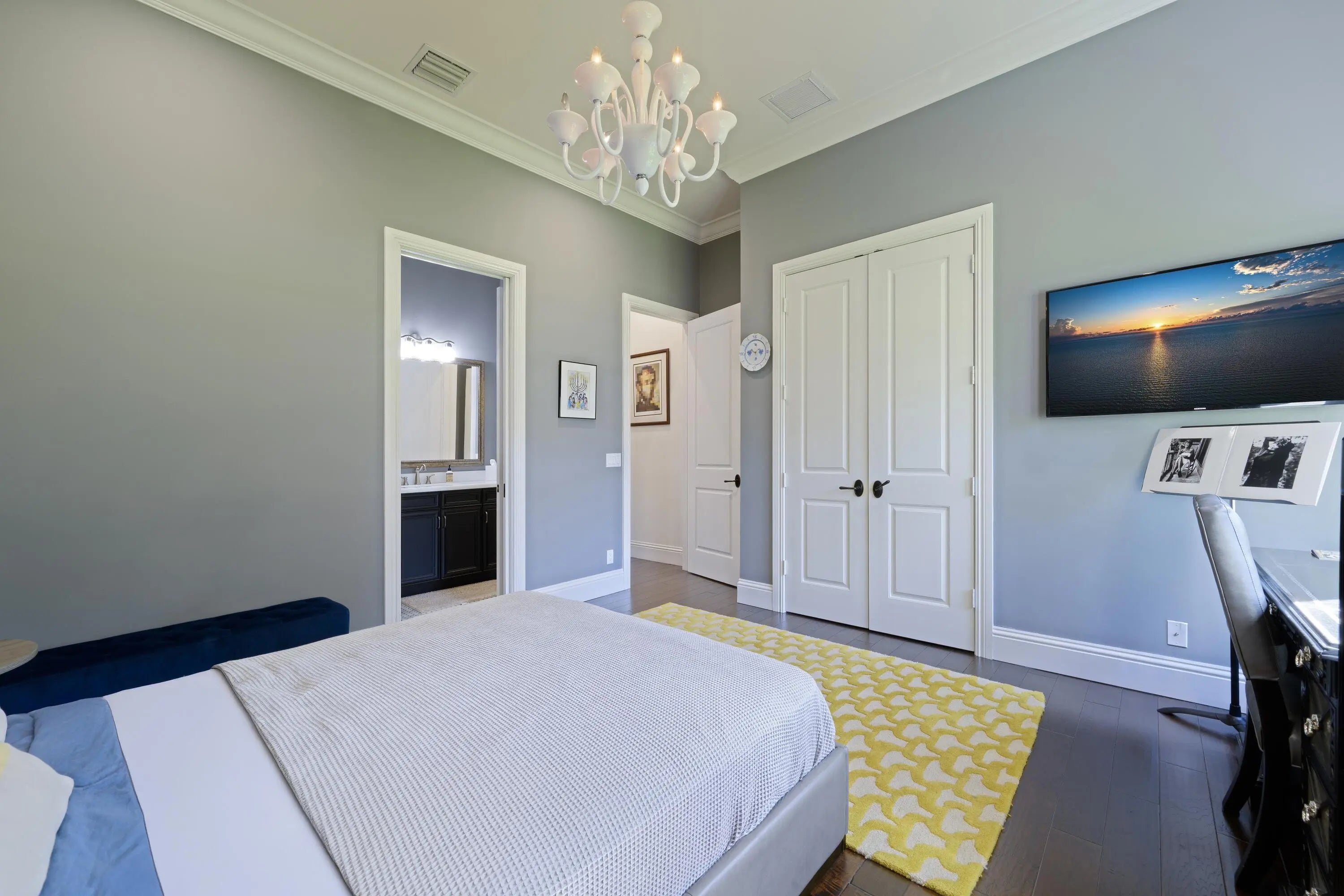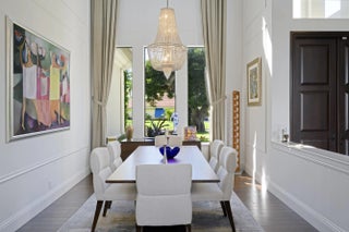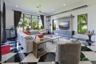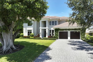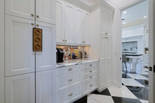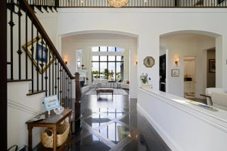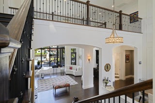 Discover timeless elegance in this stunning two-story waterfront estate located in the gated community of Portage Landing. Designed for both comfort and sophistication, this home offers 6 bedrooms (office and gym options) 4.5 baths, and exquisite craftsmanship throughout.Enter to soaring 22' ceilings, cast stone fireplace, and custom millwork. The chef's kitchen features marble floors, Thermador professional appliances, dual ovens, gas range with griddle and pot filler, butler's pantry, and granite wet bar with wine cooler. Expansive formal and casual living spaces are enhanced with marble inlays, engineered walnut wood flooring, custom drapery, and designer chandeliers--all of which convey. Retreat to the luxurious primary suite with private balcony, custom closets, and spa-like