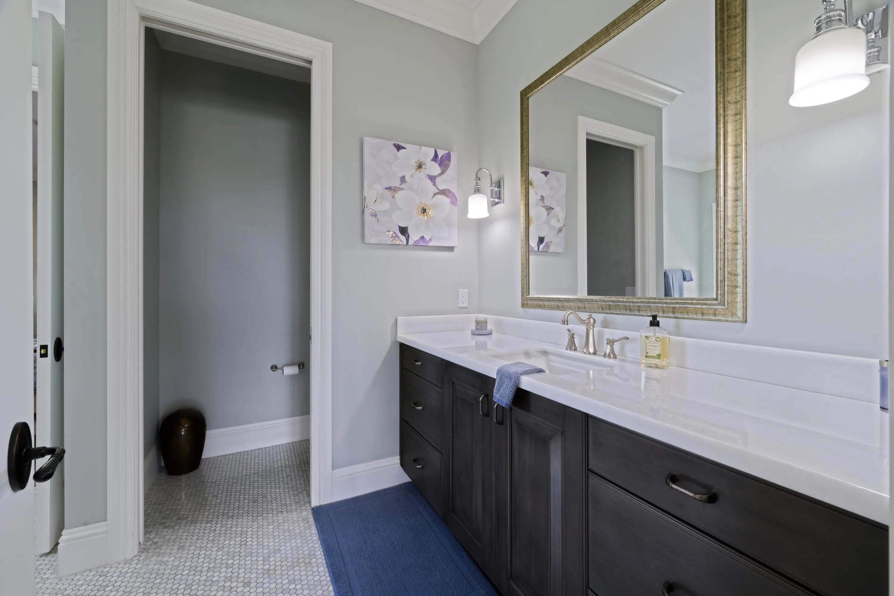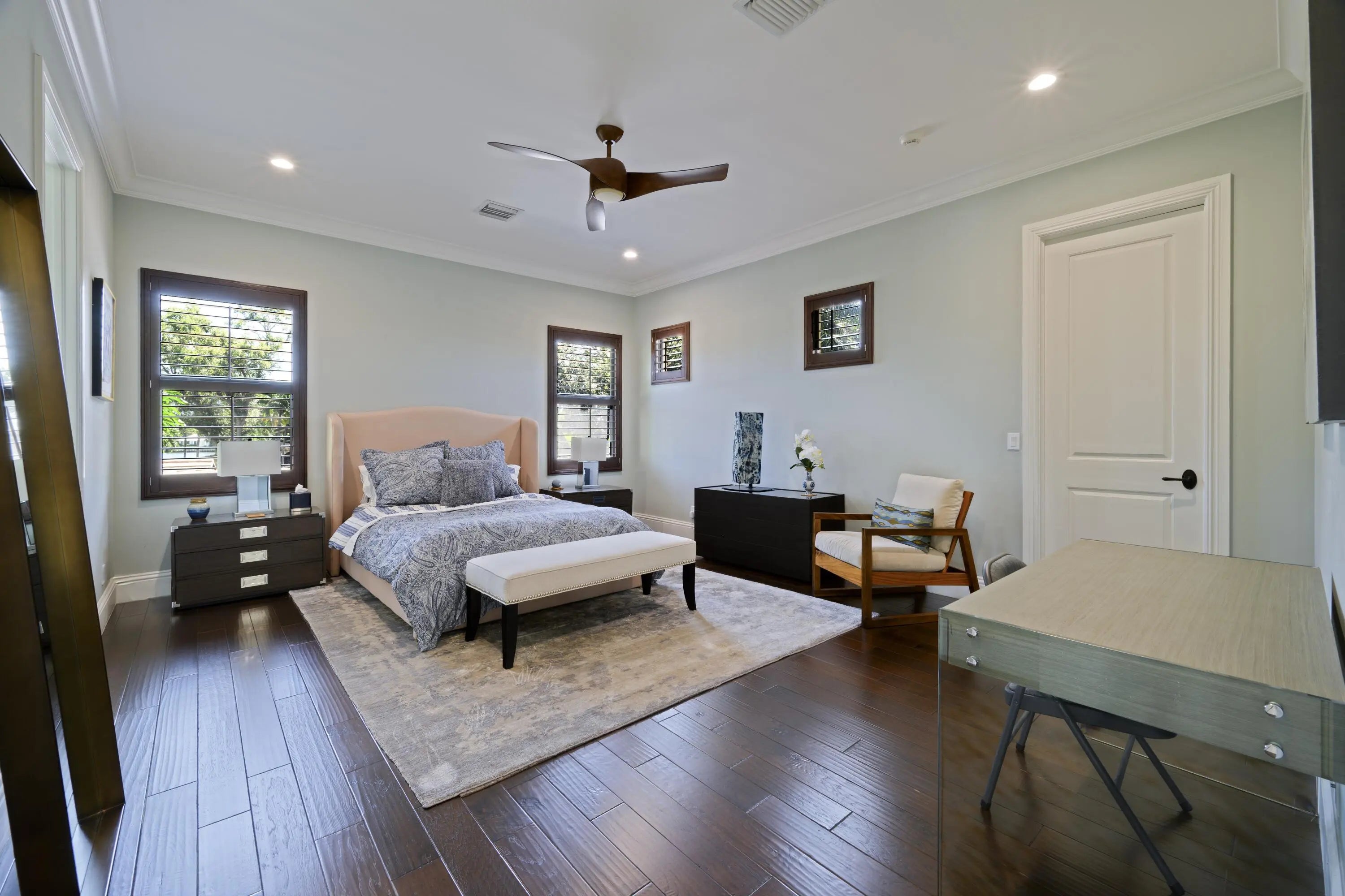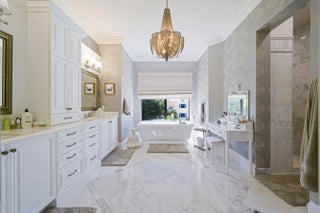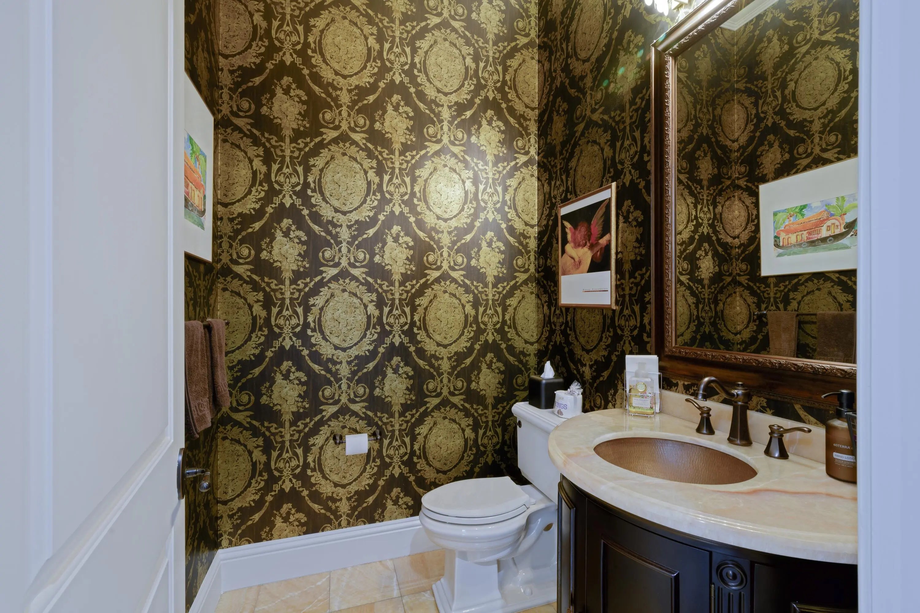 Discover timeless elegance in this stunning two-story waterfront estate located in the gated community of Portage Landing. Designed for both comfort and sophistication, this home offers 6 bedrooms (office and gym options) 4.5 baths, and exquisite craftsmanship throughout.Enter to soaring 22' ceilings, cast stone fireplace, and custom millwork. The chef's kitchen features marble floors, Thermador professional appliances, dual ovens, gas range with griddle and pot filler, butler's pantry, and granite wet bar with wine cooler. Expansive formal and casual living spaces are enhanced with marble inlays, engineered walnut wood flooring, custom drapery, and designer chandeliers--all of which convey. Retreat to the luxurious primary suite with private balcony, custom closets, and spa-like
