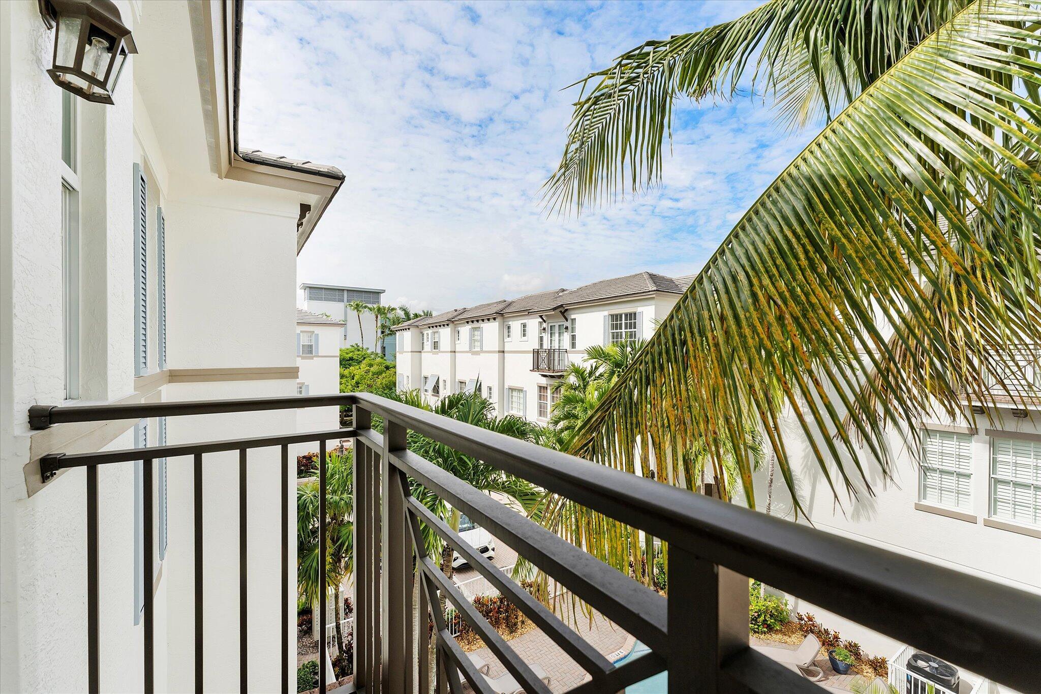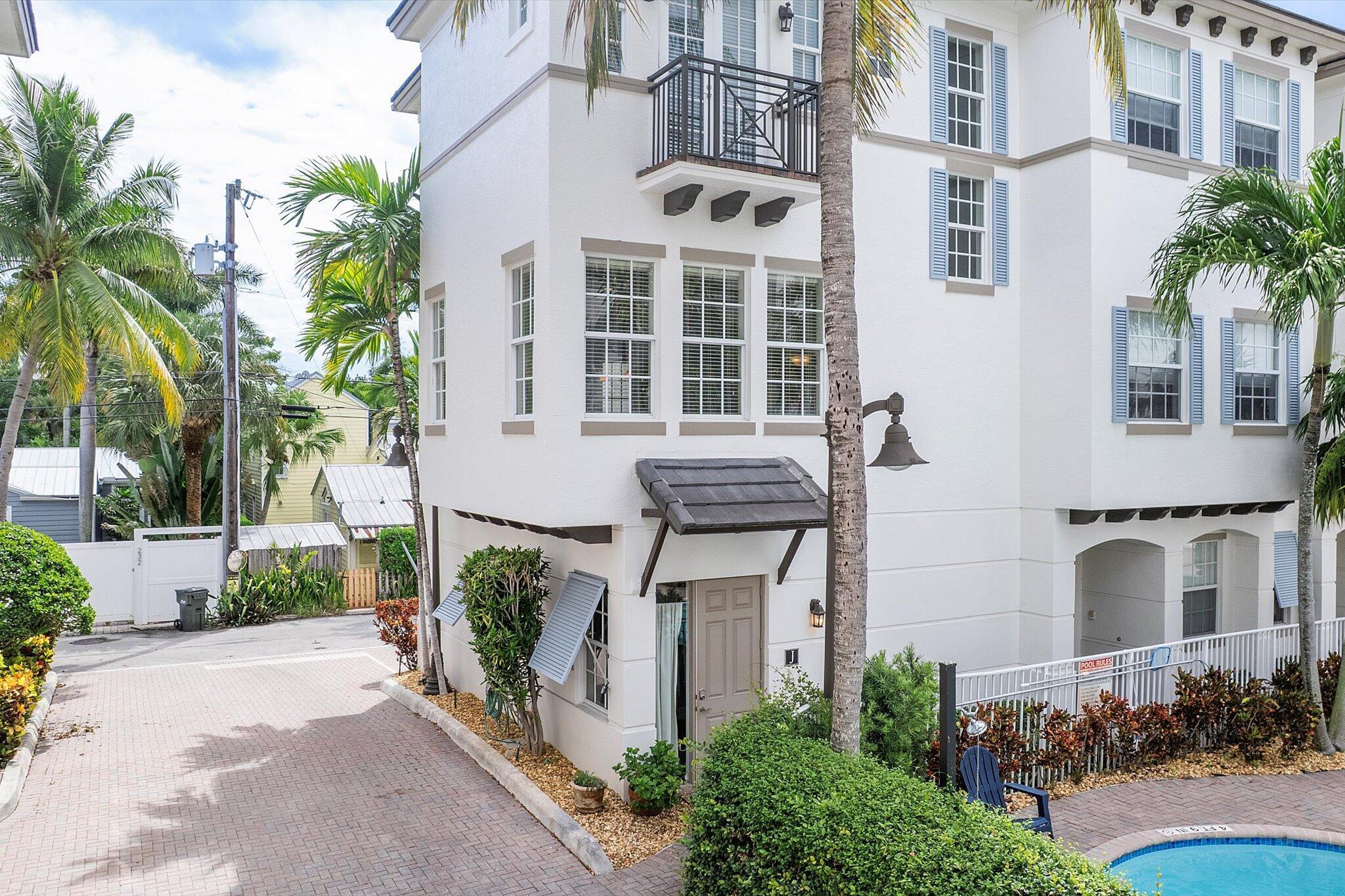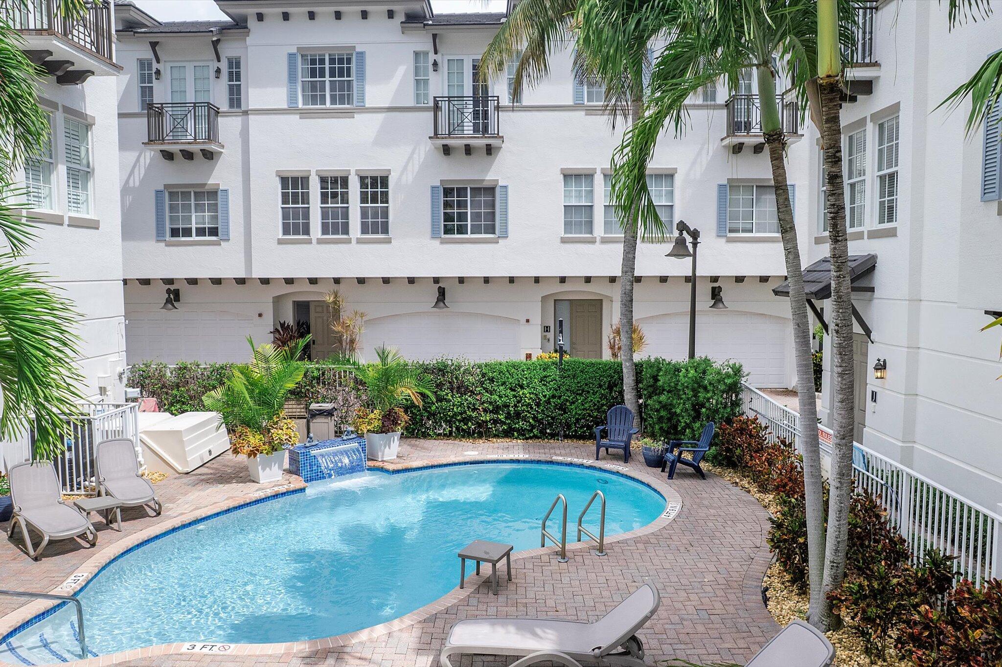 Enjoy the ultimate Delray Beach lifestyle in this beautifully maintained end-unit townhouse, ideally located minutes from Atlantic Avenue's vibrant dining, boutiques, and the beach. As a coveted corner residence, the home is filled with natural light from an abundance of windows and offers rare features not found in other units--including three private balconies, one conveniently located off the kitchen for grilling, and the only second-floor balcony in the community. Overlooking the resort-style pool with its tranquil waterfall, this home blends elegance with ease. The first floor features rich cherry wood flooring, a spacious laundry room, and an oversized garage.The open-concept main living area continues the cherry wood, highlighted by a kitchen with upgraded granite countertops, stainless steel appliances, a wine fridge, and breakfast bar. Upstairs, both bedrooms are en-suite with private balconies, while the primary suite includes a generous walk-in closet. No waiting period on leasing adds to the appeal of this rare find.