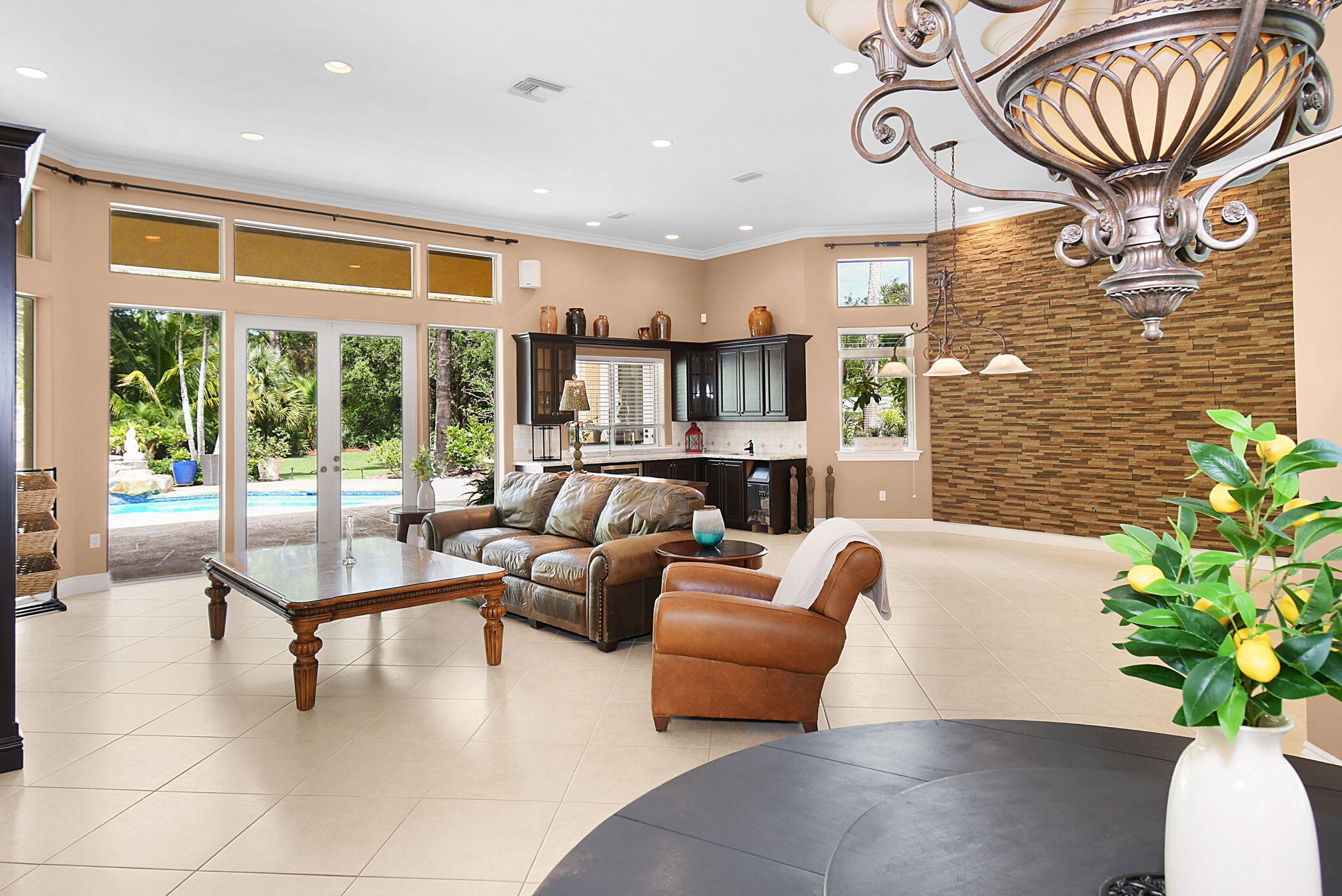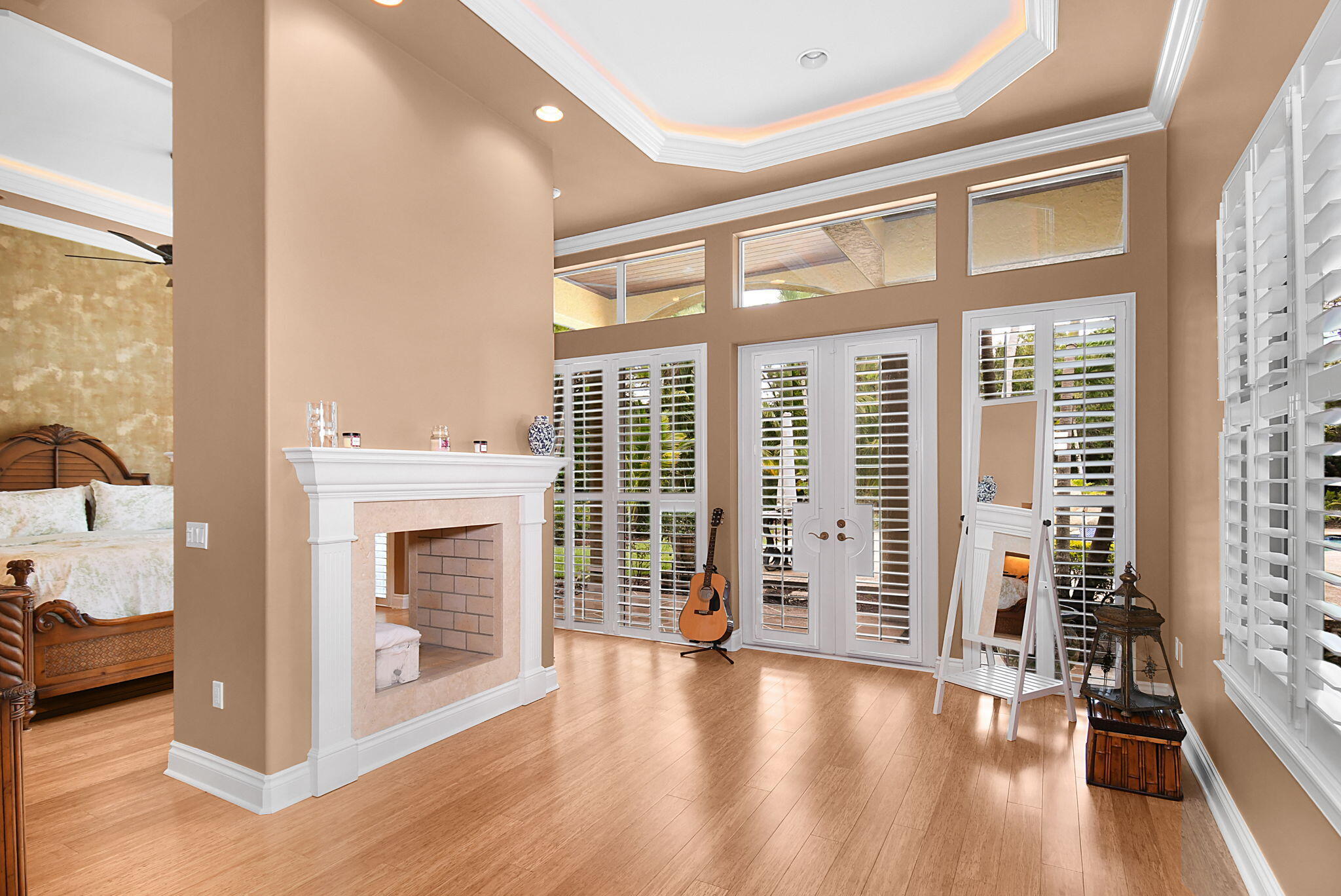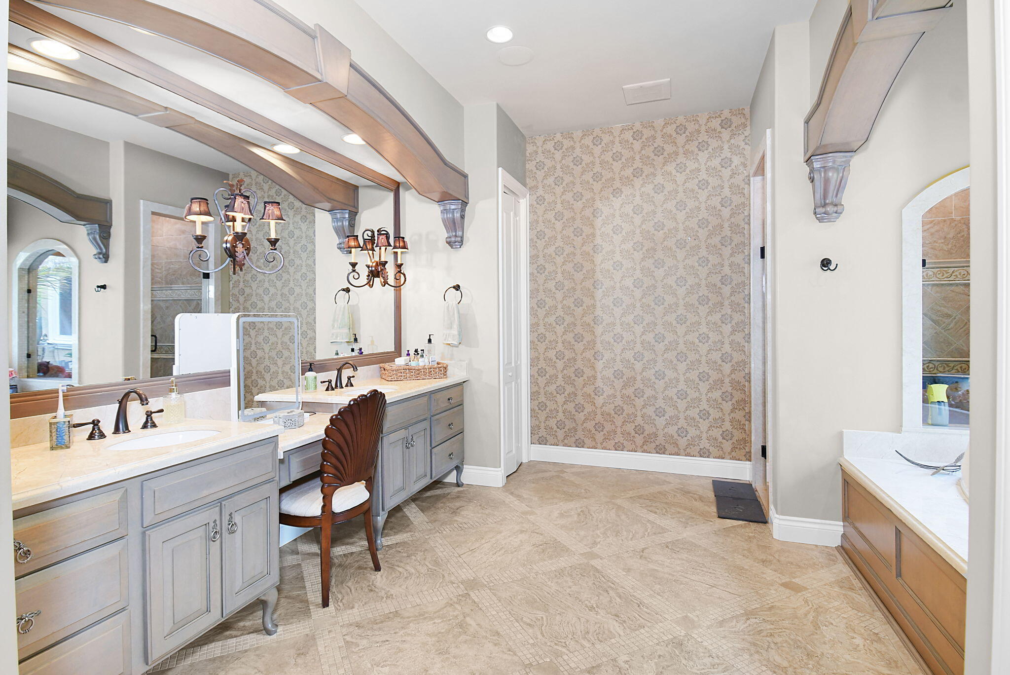 Roman Tub, Split Bedroom, Volume Ceiling, Walk-in Closet, Built-in Shelves, Cook Island, Fireplace(s), Foyer, French Door, Laundry Tub, Wet Bar