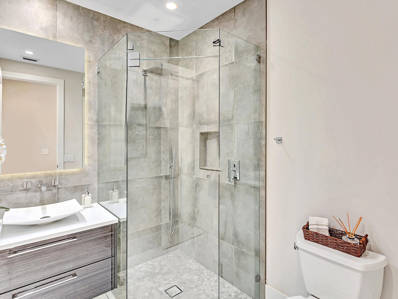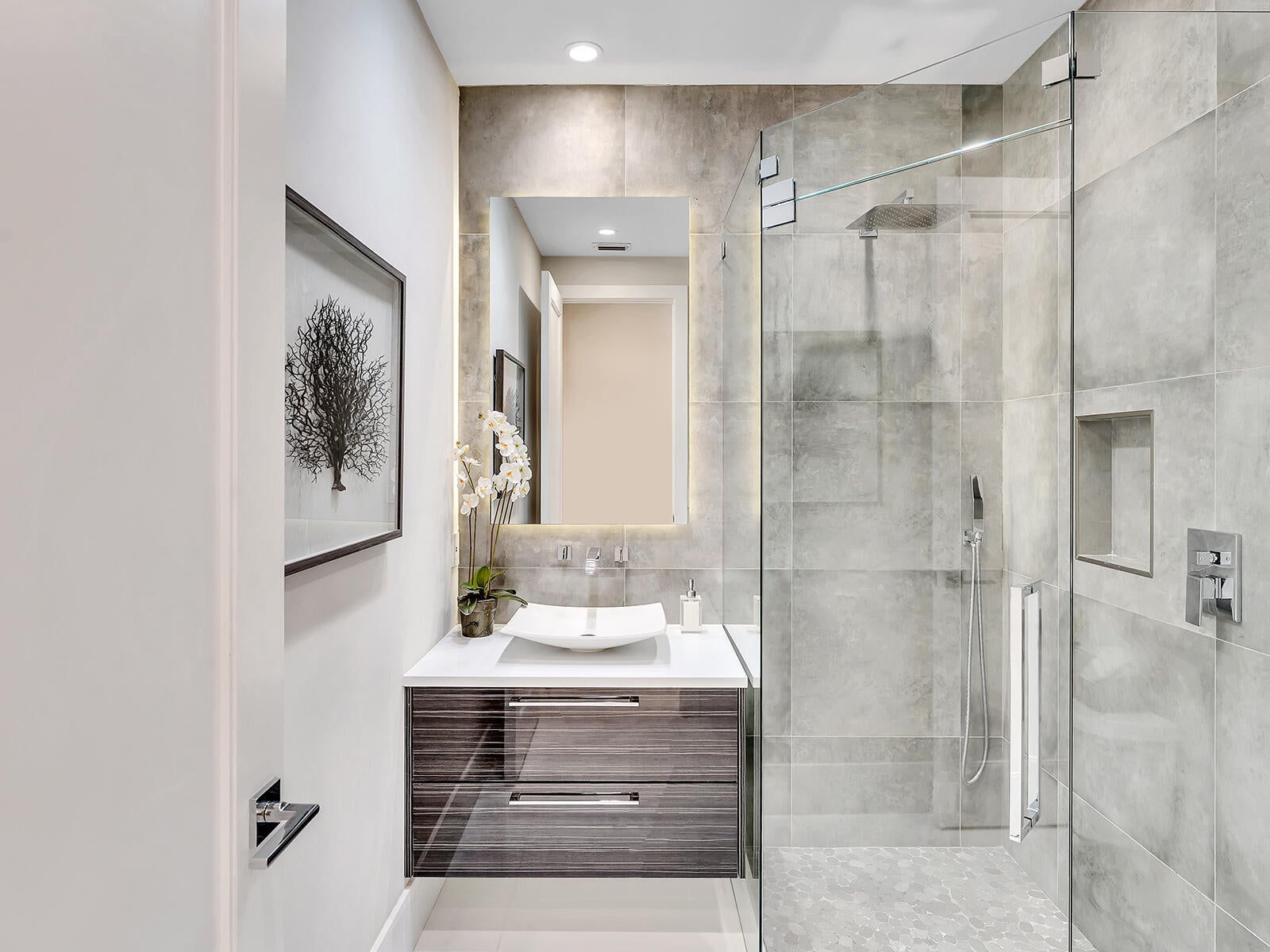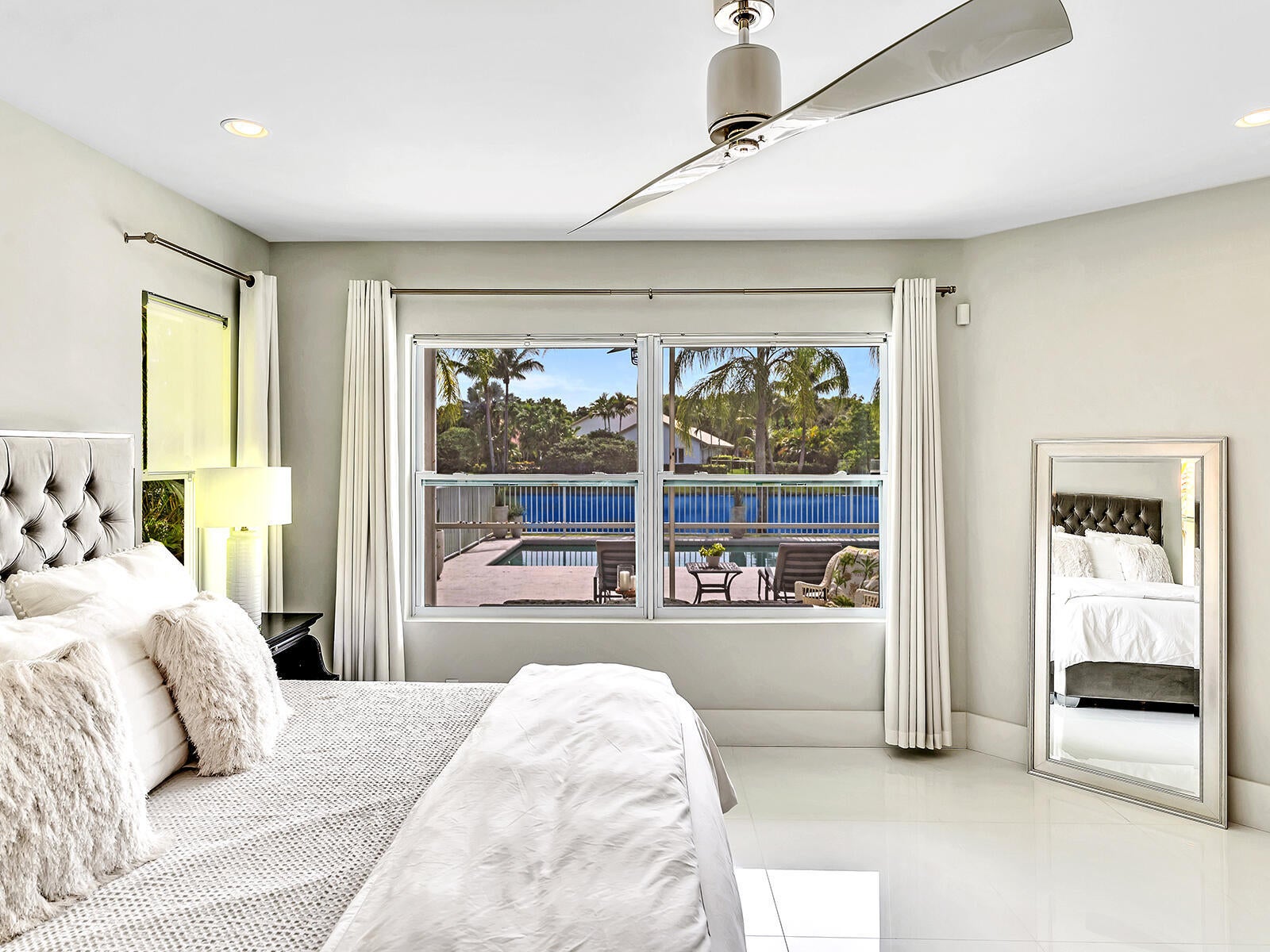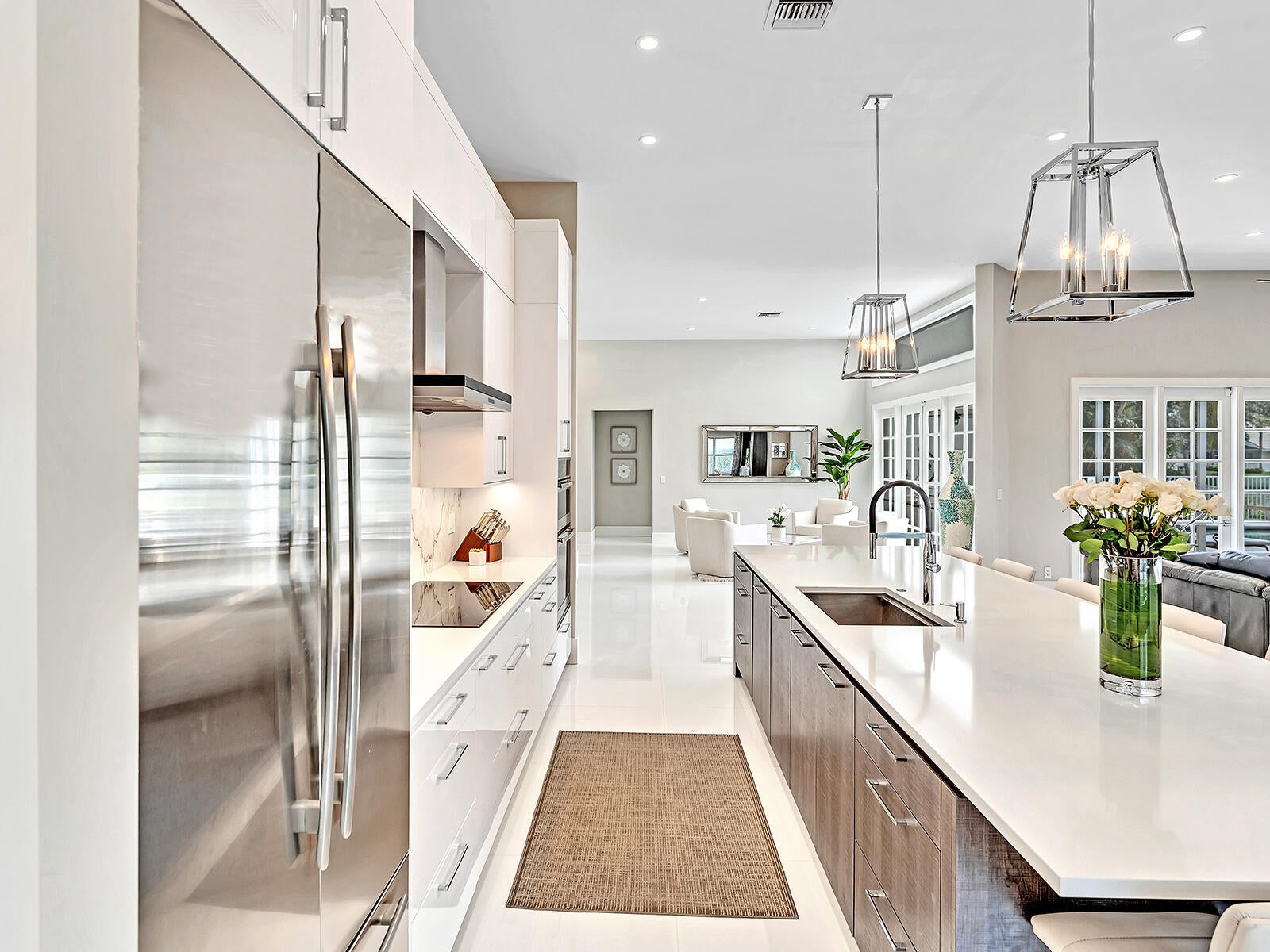This stunning contemporary 4-bedroom home is located in the highly desirable Andover community. Set among palm trees and live oaks, the 2,754 sq ft residence offers serene lake views, a spacious screened lanai, and an open sports pool. The open-concept design, with soaring ceilings and oversized white glass tile floors, is ideal for entertaining. The custom gourmet kitchen features a 14-foot white quartz island and top-of-the-line stainless steel Jenn-Air appliances, including an induction cooktop and a wine fridge. The master suite boasts a luxurious spa-like ensuite, complete with a large soaking tub and a walk-in shower for ultimate relaxation. Andover is a charming, family-friendly gated community, located just minutes from downtown Delray Beach, residents enjoy convenient accessto restaurants, nightlife, and pristine beaches.