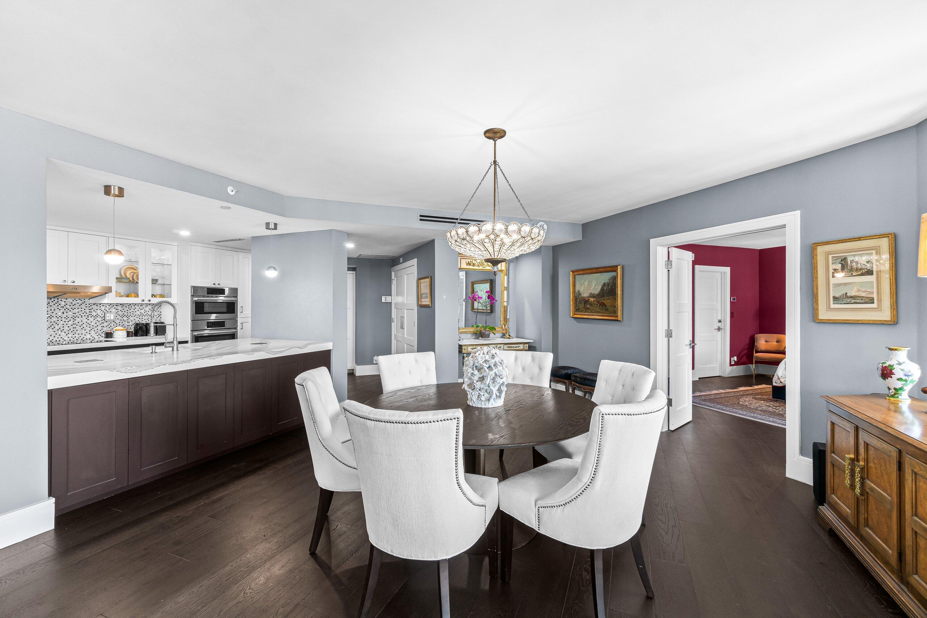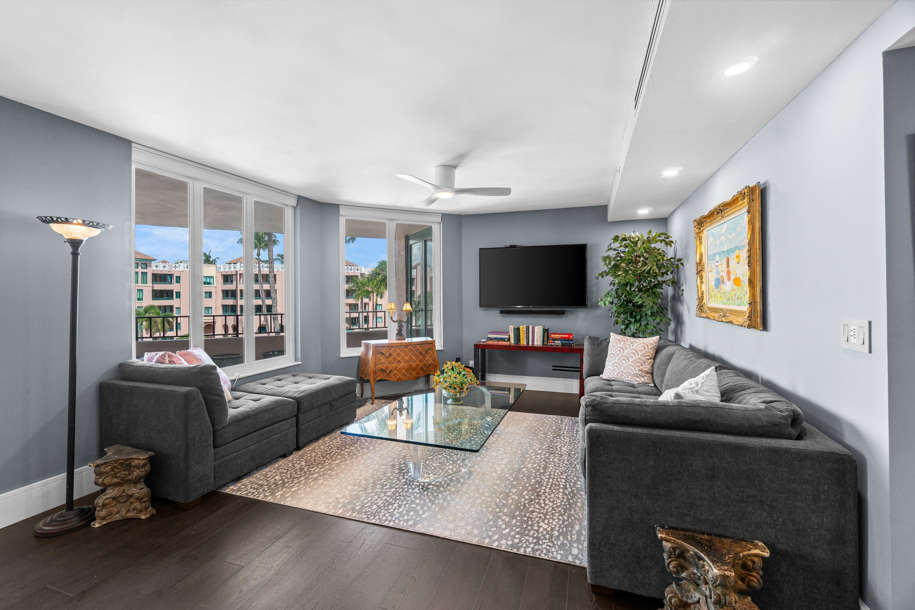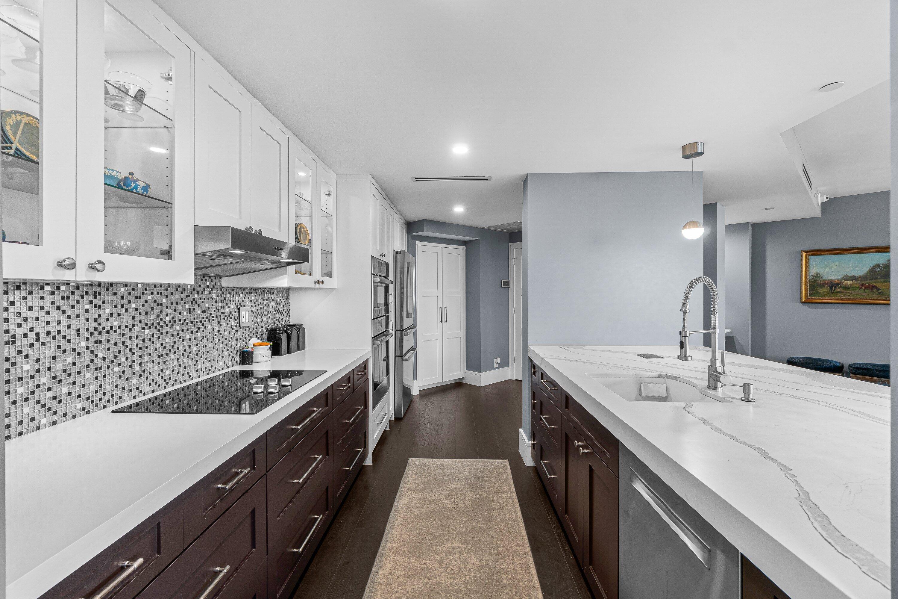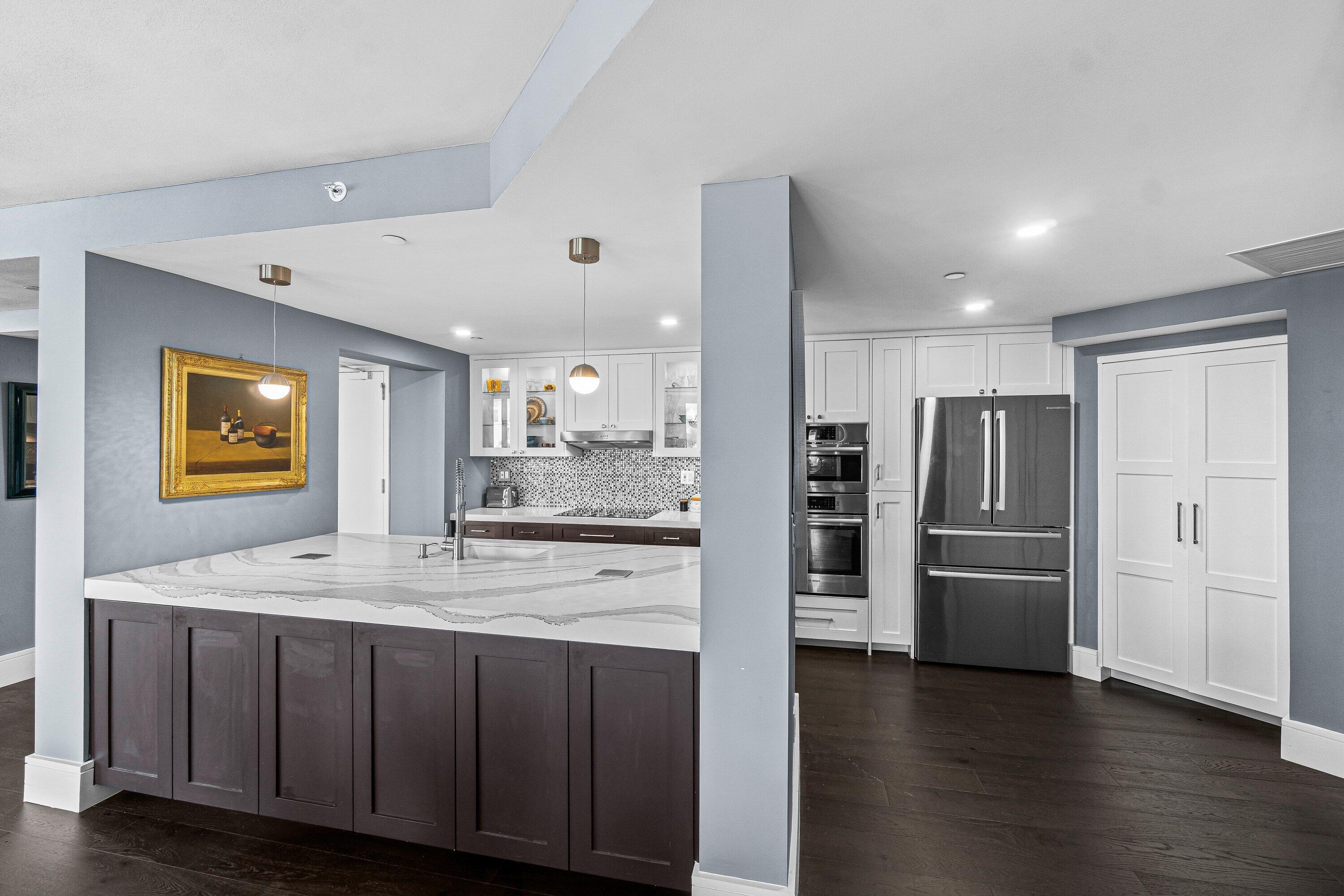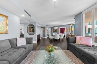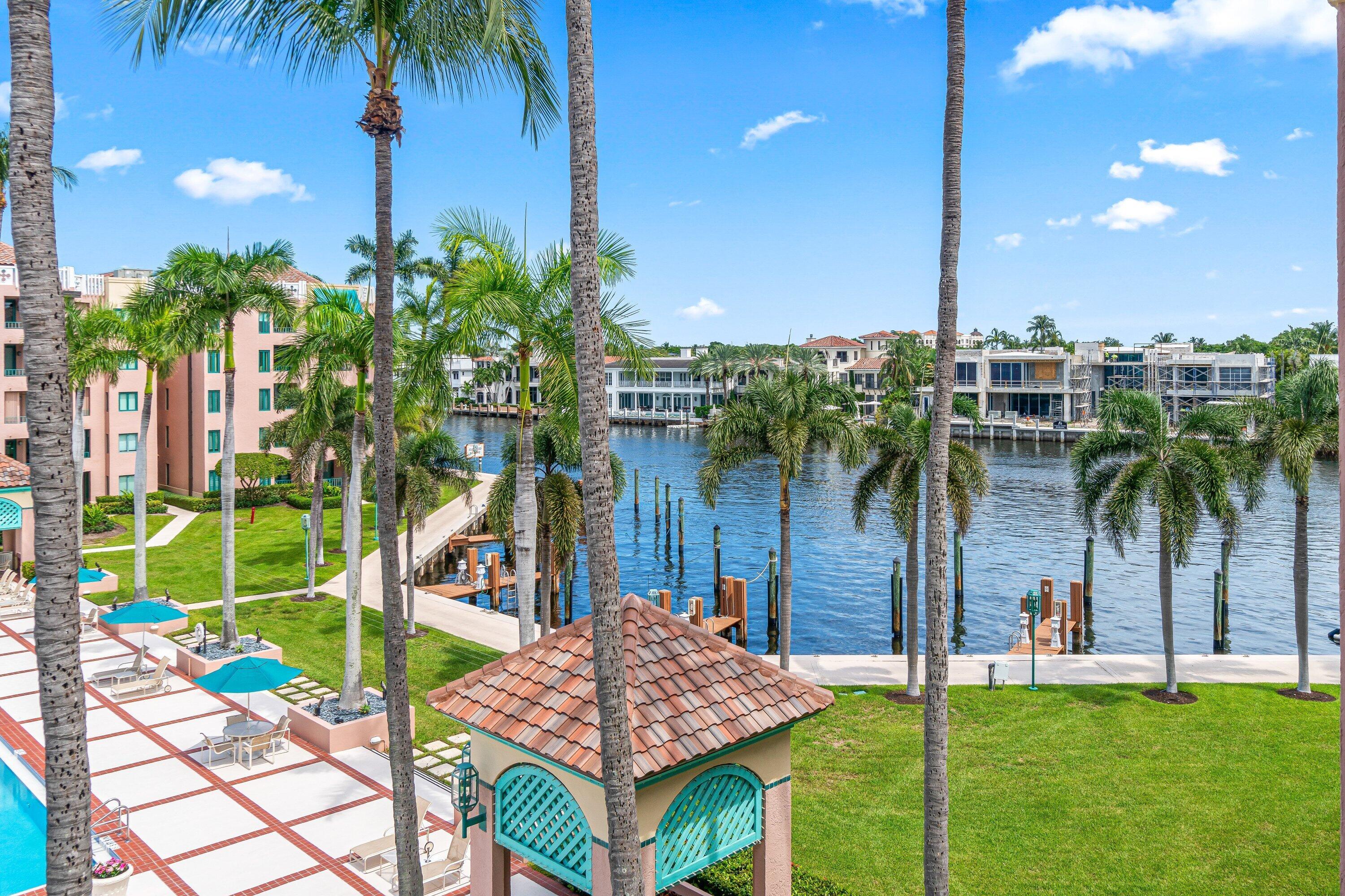 Elegantly renovated down to the studs, this spacious Bougainvillea model offers 2 bedrooms, 2 baths, and stunning views of the Intracoastal and pool. Featuring deep espresso hardwood floors, an open-concept living and dining area, and a sleek modern kitchen with quartz countertops, oversized island, and custom cabinetry. The primary suite boasts breathtaking water views, a large walk-in closet, and a spa-like bathroom with a custom vanity and oversized porcelain-tiled shower. Popular split bedroom plan. The guest suite enjoys water views and easy access to a beautifully finished bathroom. Additional highlights include HURRICANE impact windows and doors throughout, electric blinds, abundance of closet space, oversized balcony with beautiful water views, full-capacity washer and dryer, anda large pantry for ample storage. This unit comes with 1 very convenient covered parking space, and an additional air conditioned storage locker. Furniture available separately. Mizner Court provides the ultimate lifestyle in downtown Boca Raton. This pet-friendly, 13-acre community on the grounds of The Boca Raton offers 2 tennis courts, 2 resort-style heated pools, 4 spas, 3 party rooms, 2 fitness centers, steam rooms, saunas, an Intracoastal pavilion for private events, 24/7 manned gate and security, on-site management, covered parking, guest parking, and more.