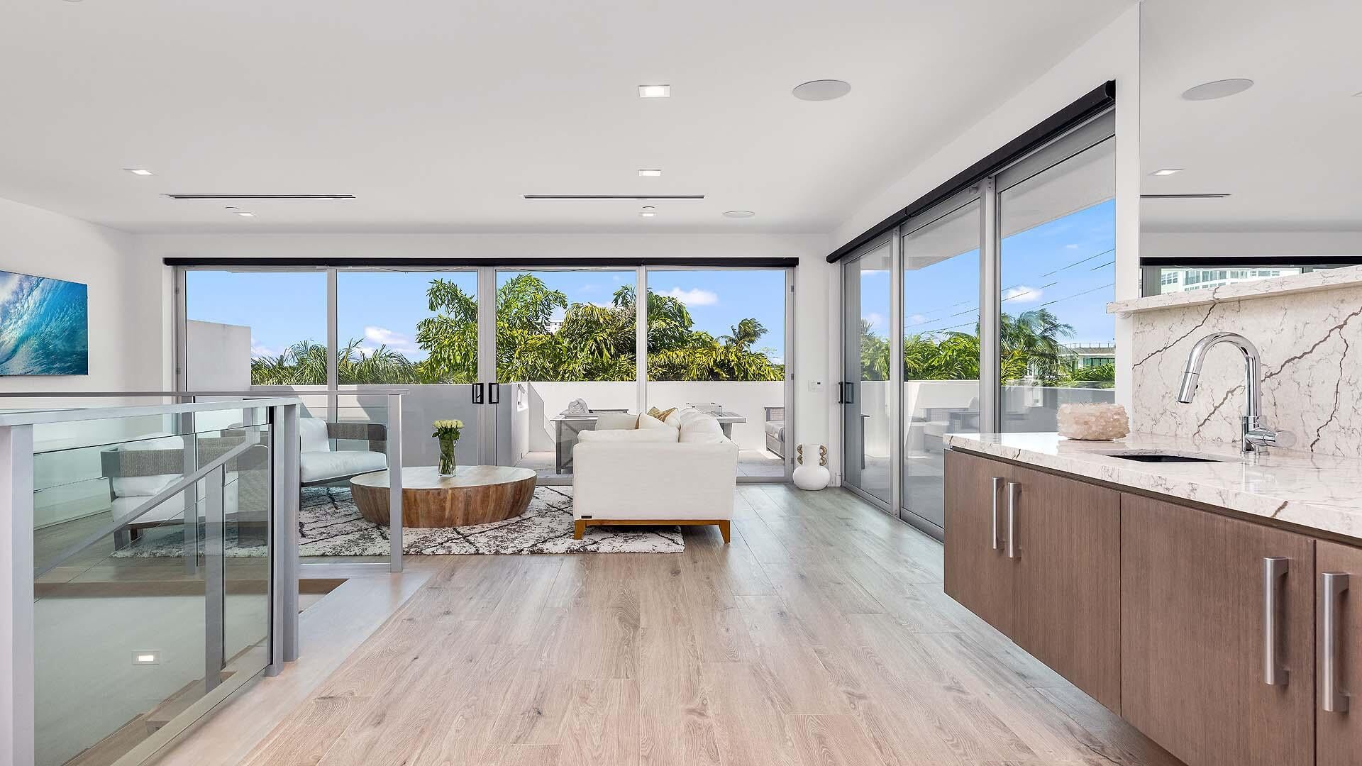 Located in the Seagate neighborhood of Delray Beach just moments from the beach, Seagate Beach Club, and Atlantic Ave awaits a rare opportunity to enjoy the privacy of a single-family home with the ease of a townhome. Built by Seaside Builders, this corner residence features high ceilings, Sonos sound system throughout, private elevator and contemporary floor plan. The main level showcases a chef's kitchen with quartz counters and custom cabinetry, opening to a private backyard with pool and entertaining space. The primary suite includes a wrap-around balcony, spa-like bath, and bespoke closet, while each bedroom offers a private terrace and ensuite bath. An upper-level loft with a bar and expansive terrace. Available for immediate seasonal or year-round living. Located in the Seagate neighborhood of Delray Beach just moments from the beach, The Seagate Beach Club, and Delray Beach's vibrant Atlantic Avenue, 917 Bucida Road A presents a rare opportunity to enjoy the privacy and scale of a single-family home with the ease and convenience of a townhome. Built in 2019 by esteemed Seaside Builders, this corner-unit residence combines exceptional craftsmanship, thoughtful design, and a premier location in one of South Florida's most desirable communities. Flooded with natural light through expansive impact glass, the home features high ceilings and a contemporary open floor plan that blends style and comfort. The main level showcases a chef's kitchen with quartz countertops, and custom cabinetry and backsplash. Designed for seamless entertaining, the living and dining areas open directly to a private backyard retreat, complete with pool, landscaped grounds, gas grill, and ample space for outdoor gatherings. The residence boasts a Sonos sound system throughout, private residential elevator, and custom commissioned artwork in the powder bath and primary bathroom. Upstairs, the primary suite serves as a serene escape with its wrap-around balcony, spa-inspired bathroom, and bespoke walk-in closet. Each additional bedroom offers its own ensuite bath, private terrace, and custom storage, ensuring both comfort and privacy for residents or guests. The upper level of this residence features a spacious loft with a bar and a 650 square foot terrace. With open-air living and views of the Intracoastal, it provides a unique setting for relaxation or sunset entertaining. Designed with convenience in mind, the property includes a two-car garage and smart-home technology that allows for effortless control of lighting, climate, security, and motorized shades. The HOA further enhances the lock-and-leave lifestyle by covering exterior insurance, landscaping, and pool care. The Seagate Community organizes various cocktail party get togethers during the season for a nominal fee. Atlantic Avenue offers abundant choices for great dining, nightlife and boutique shopping. Palm Beach, Boca Raton and Fort Lauderdale are a short drive away. Available for immediate seasonal or year-round enjoyment, 917 Bucida Road A is an exceptional offering in the heart of East Delray Beach, combining modern luxury with coastal living just moments from the sand.