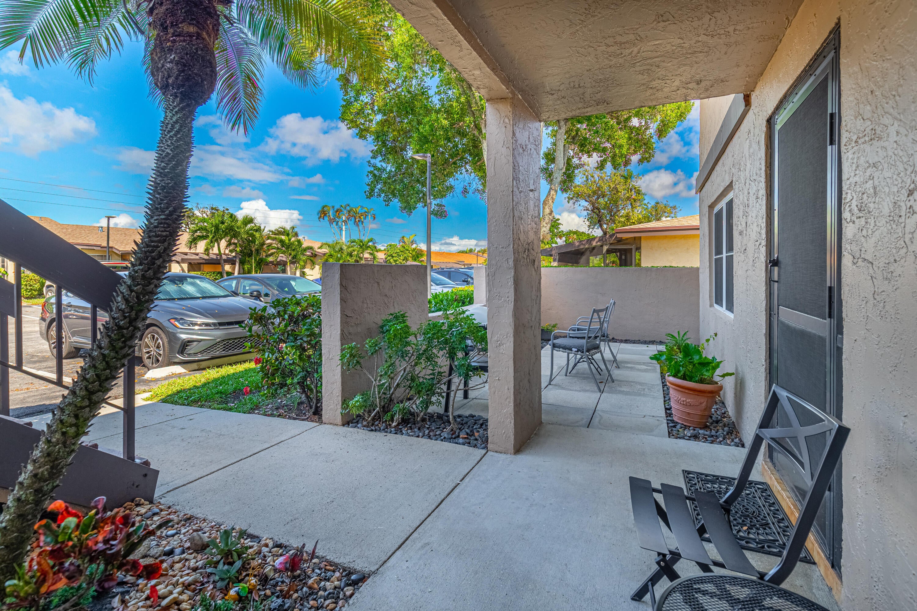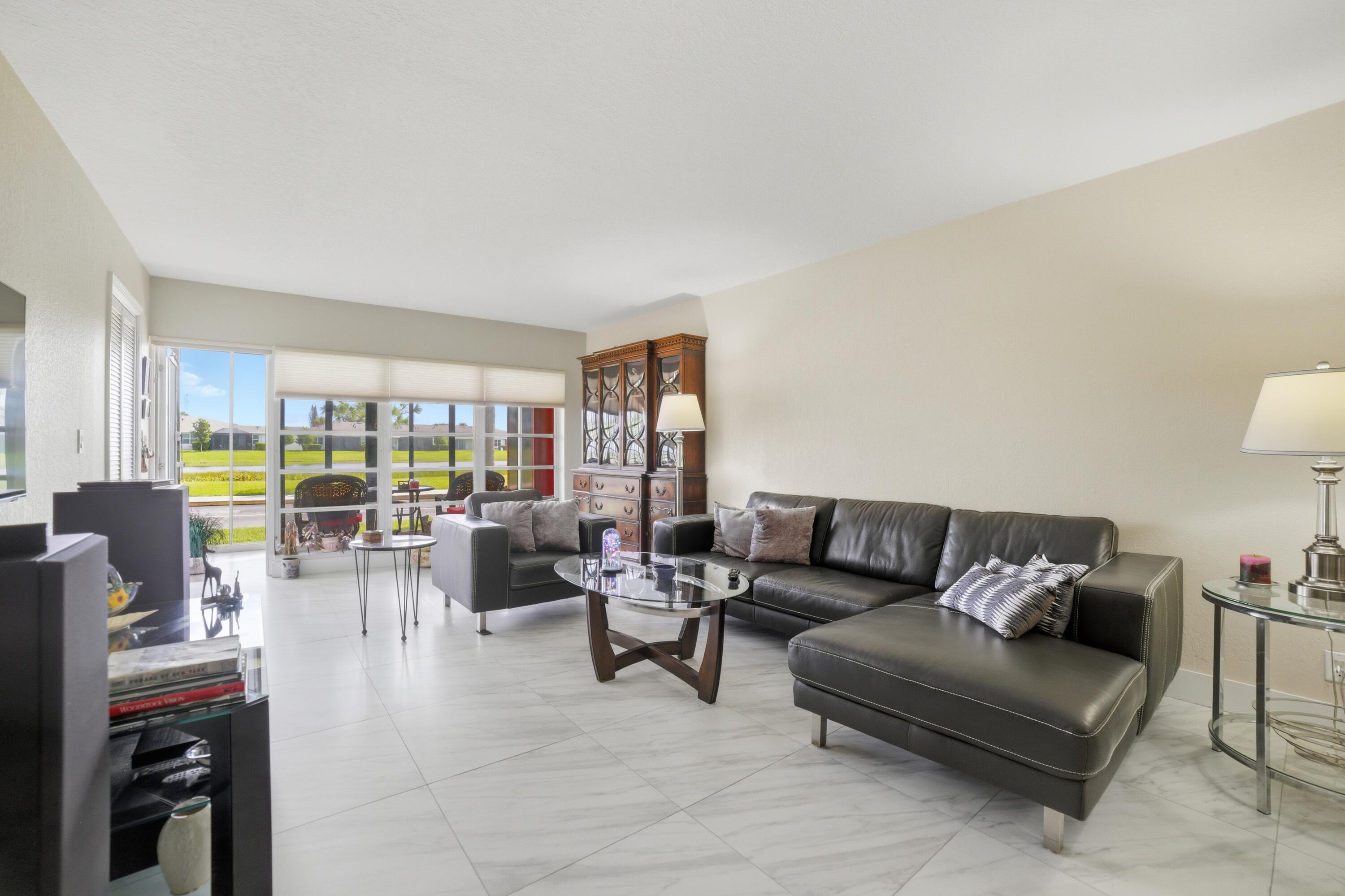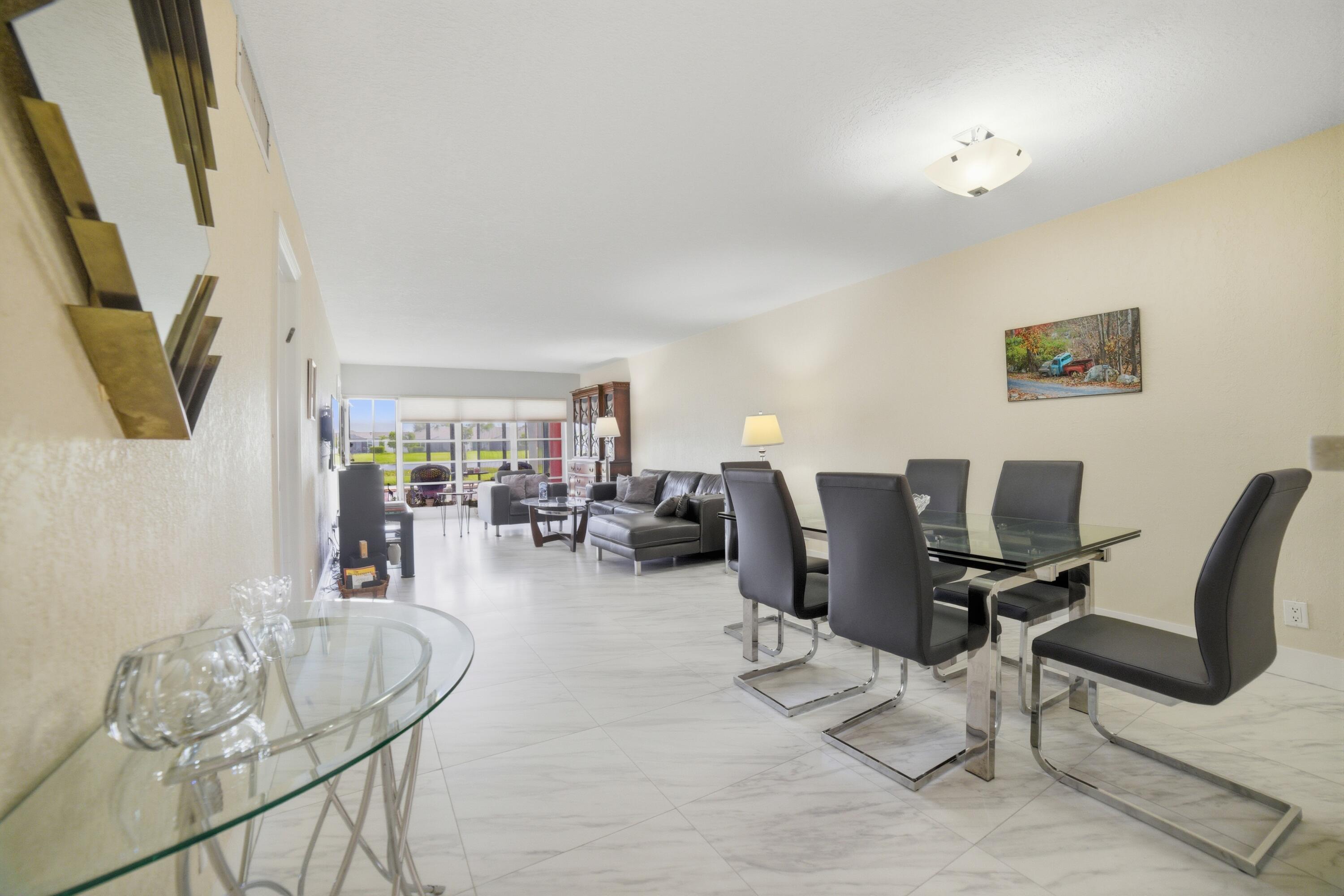 Renovated Corner First Floor condo in the 55+ community of Palm Greens in Delray Beach. Open Eat-in Kitchen has beautiful Countertops, Shaker Style Cabinets & Stainless Steel appliances. Spacious Primary Bedroom has an ensuite bath & walk-in closet. Features include 24'' x 24'' Ceramic Tiles throughout, Impact Windows, Hunter Douglas shades, Kohler Frameless Glass Shower Doors, open Front Patio & an Impact Glass enclosed Florida room overlooking the serene lake. Assigned Parking steps to the front door. The new state-of-the-art clubhouse coming soon has a Resort-Style Pool, Fitness Center, Tennis/Pickleball Courts, Theatre, Library, Billiards, Shuffleboard, Card/Game Rooms & many social activities. Short distance to Downtown Delray, shopping, dining, art galleries, & the beach.