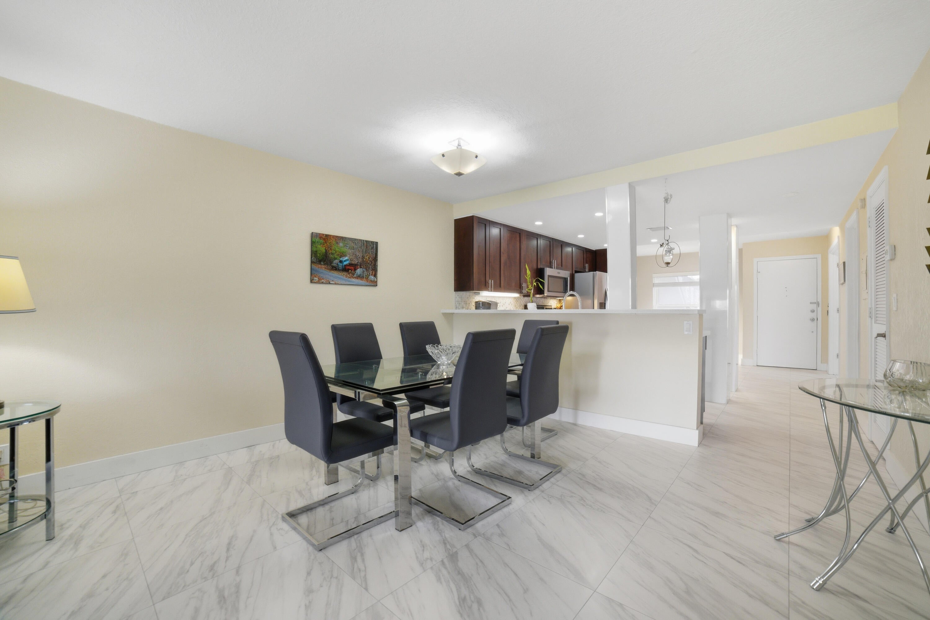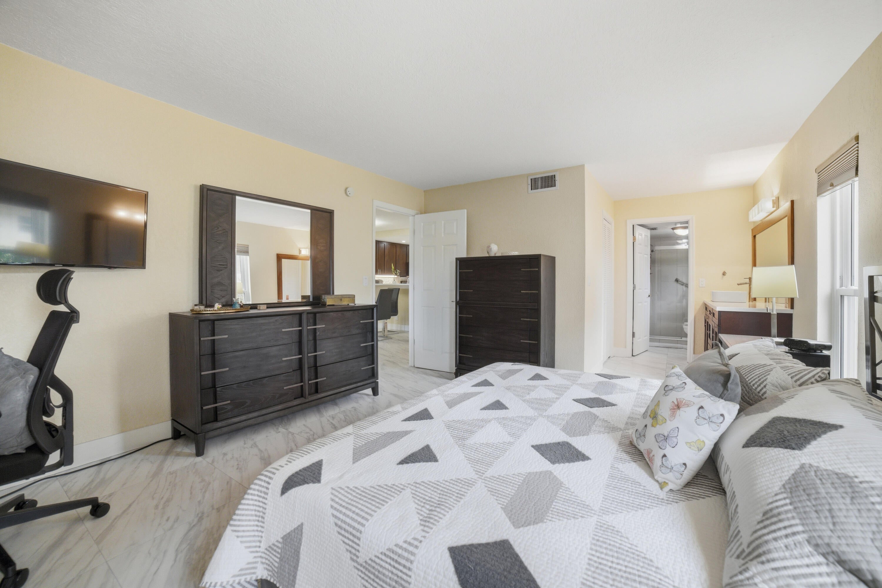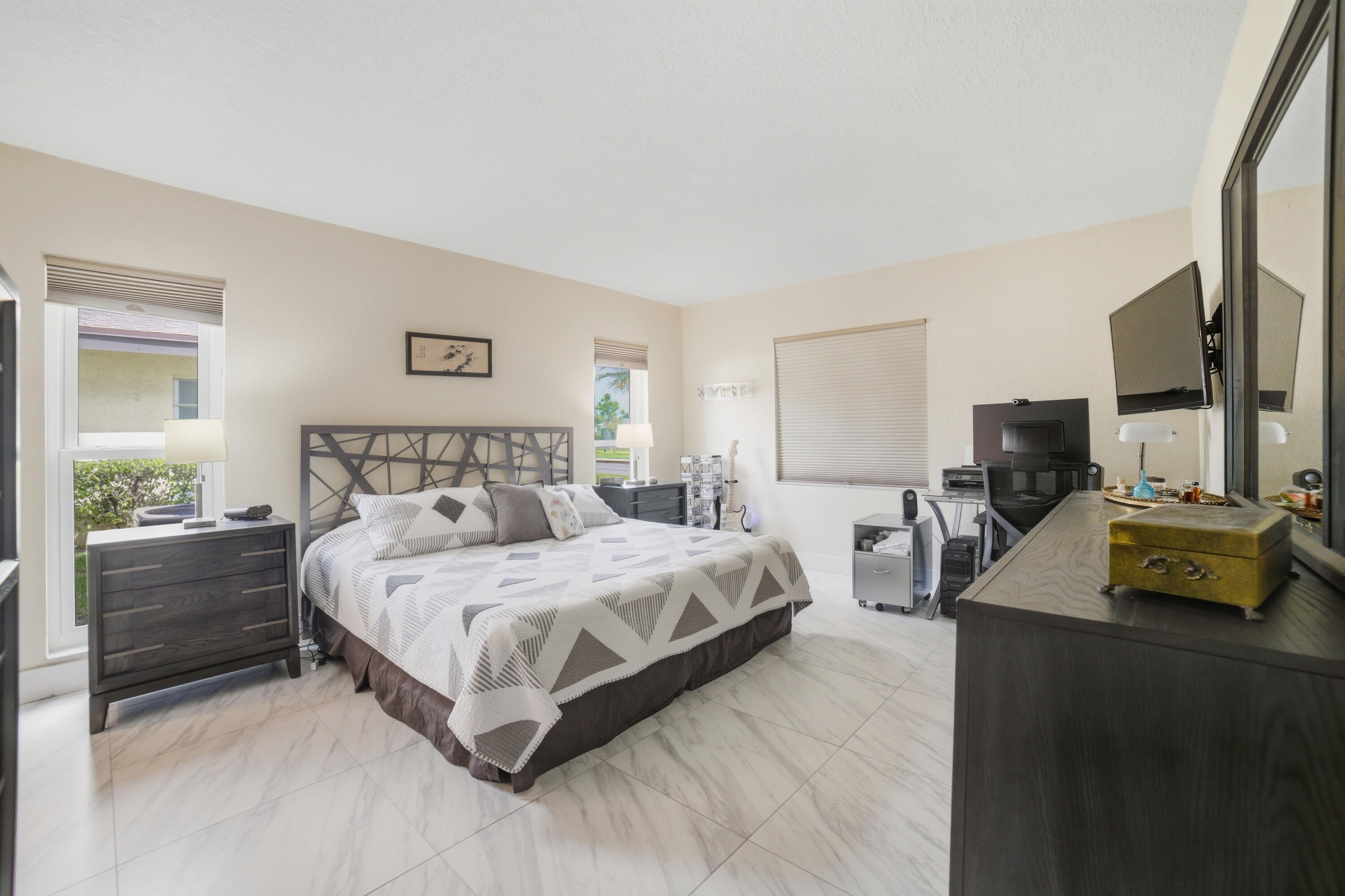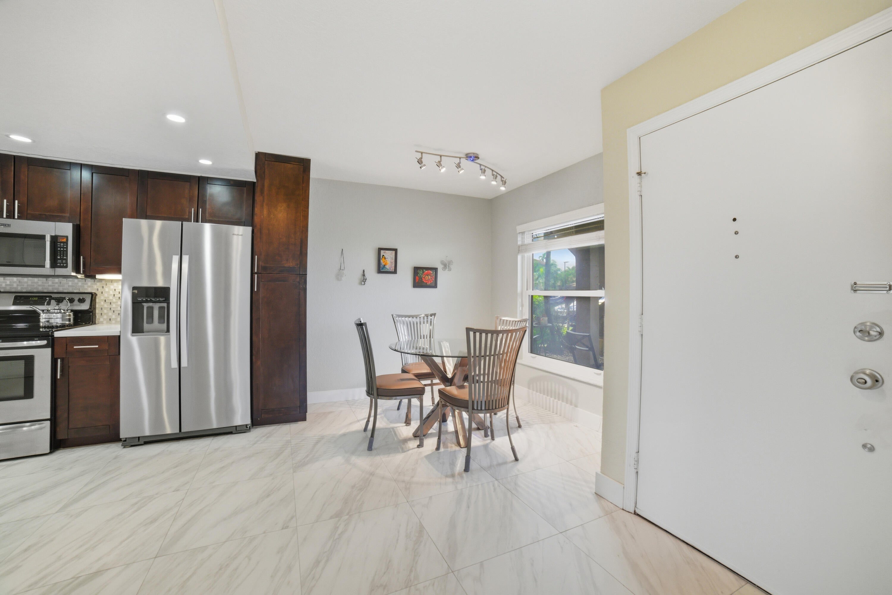 Renovated Corner First Floor condo in the 55+ community of Palm Greens in Delray Beach. Open Eat-in Kitchen has beautiful Countertops, Shaker Style Cabinets & Stainless Steel appliances. Spacious Primary Bedroom has an ensuite bath & walk-in closet. Features include 24'' x 24'' Ceramic Tiles throughout, Impact Windows, Hunter Douglas shades, Kohler Frameless Glass Shower Doors, open Front Patio & an Impact Glass enclosed Florida room overlooking the serene lake. Assigned Parking steps to the front door. The new state-of-the-art clubhouse coming soon has a Resort-Style Pool, Fitness Center, Tennis/Pickleball Courts, Theatre, Library, Billiards, Shuffleboard, Card/Game Rooms & many social activities. Short distance to Downtown Delray, shopping, dining, art galleries, & the beach.