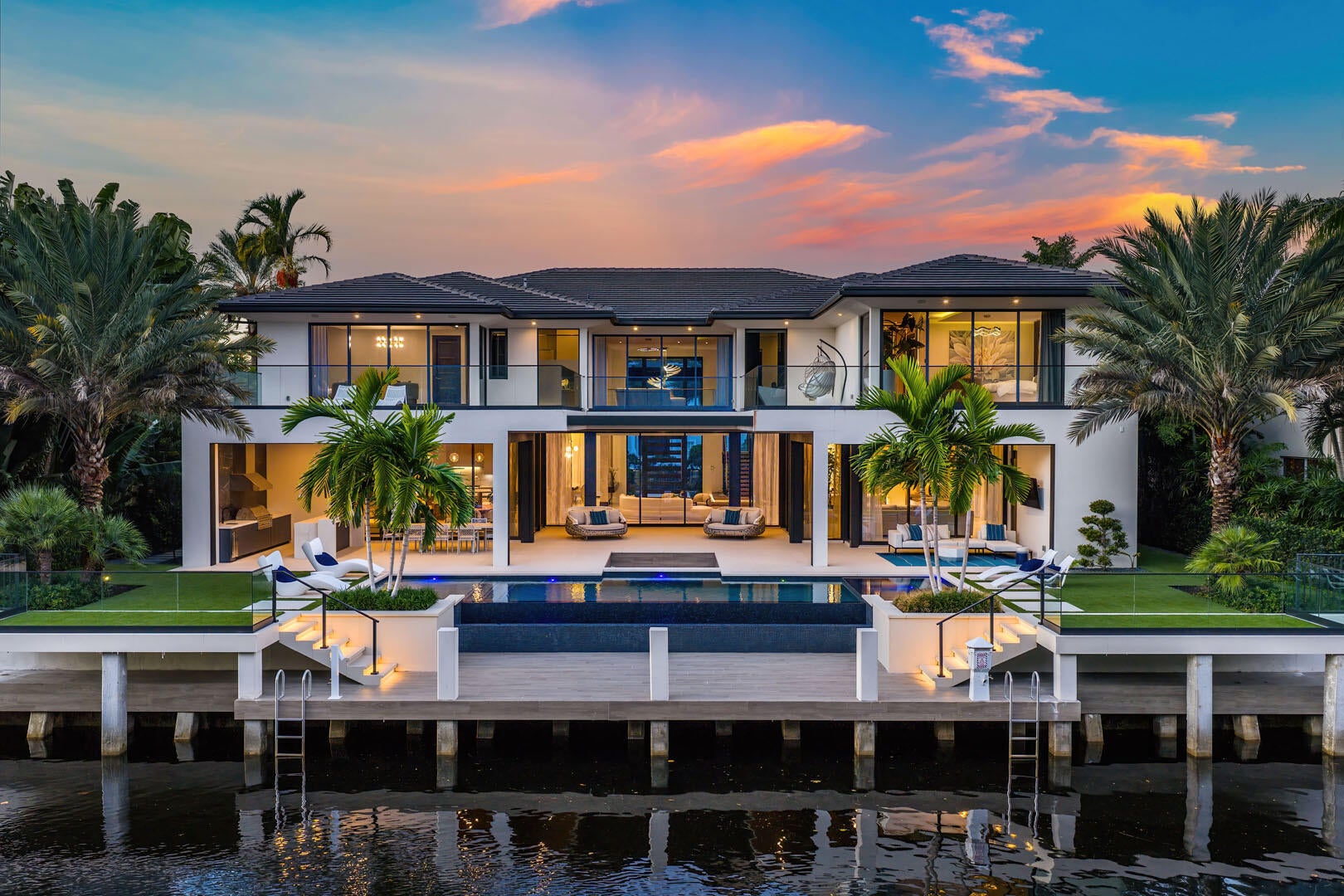 A striking new waterfront estate by Albanese & Sons, architecture by BE Design, and interiors by Zelman Designs, debuts in Royal Palm Yacht & Country Club. This ultra-luxury residence spans just over 9,000 sq ft of refined interiors with 100 feet on the Royal Palm Waterway and captivating Capone Island nature preserve views. Thoughtfully designed for effortless living and grand entertaining, it features a club room with bar, glass wine display, wellness suite with sauna and steam shower, and a state-of-the-art Control4 innovative system. Outdoors, a southern-facing infinity pool, spa, and sunken fire pit create a private resort ambiance. Don't miss this extraordinary turnkey masterpiece.