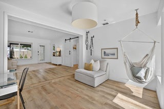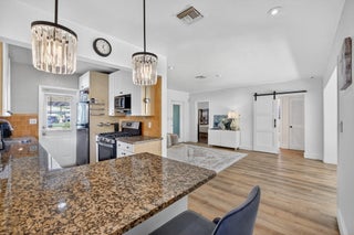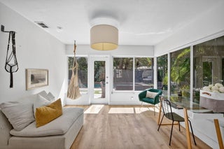 This enchanting 2-bed / 2-bath mid-century modern home is a true oasis, seamlessly blending style with everyday comfort. Step inside to discover a charming, flow-through floor plan with natural-color, manufactured hardwood floors throughout the home. The remodeled primary bath offers a touch of luxury, and an attractive sliding barn door separates the primary bed and bath for added privacy. The galley kitchen features Whirlpool stainless steel appliances, granite countertops, and a propane gas stove for the ultimate cooking experience. The heart of this home is its private backyard, a true Shangri-La featuring a gorgeous pool, perfect for relaxation or entertaining. Thoughtful, lush landscaping enhances both the front and backyard spaces, with a truly tropical feel!The fully fenced yard ensures privacy for relaxation and entertaining. Central AC and impact windows throughout offer both security and energy efficiency. Additional conveniences include an extra storage room, a newer roof, a newer water heater, and a new breaker panel. Glass brick details add to the home's mid-century charm. Conveniently located and NO HOA.