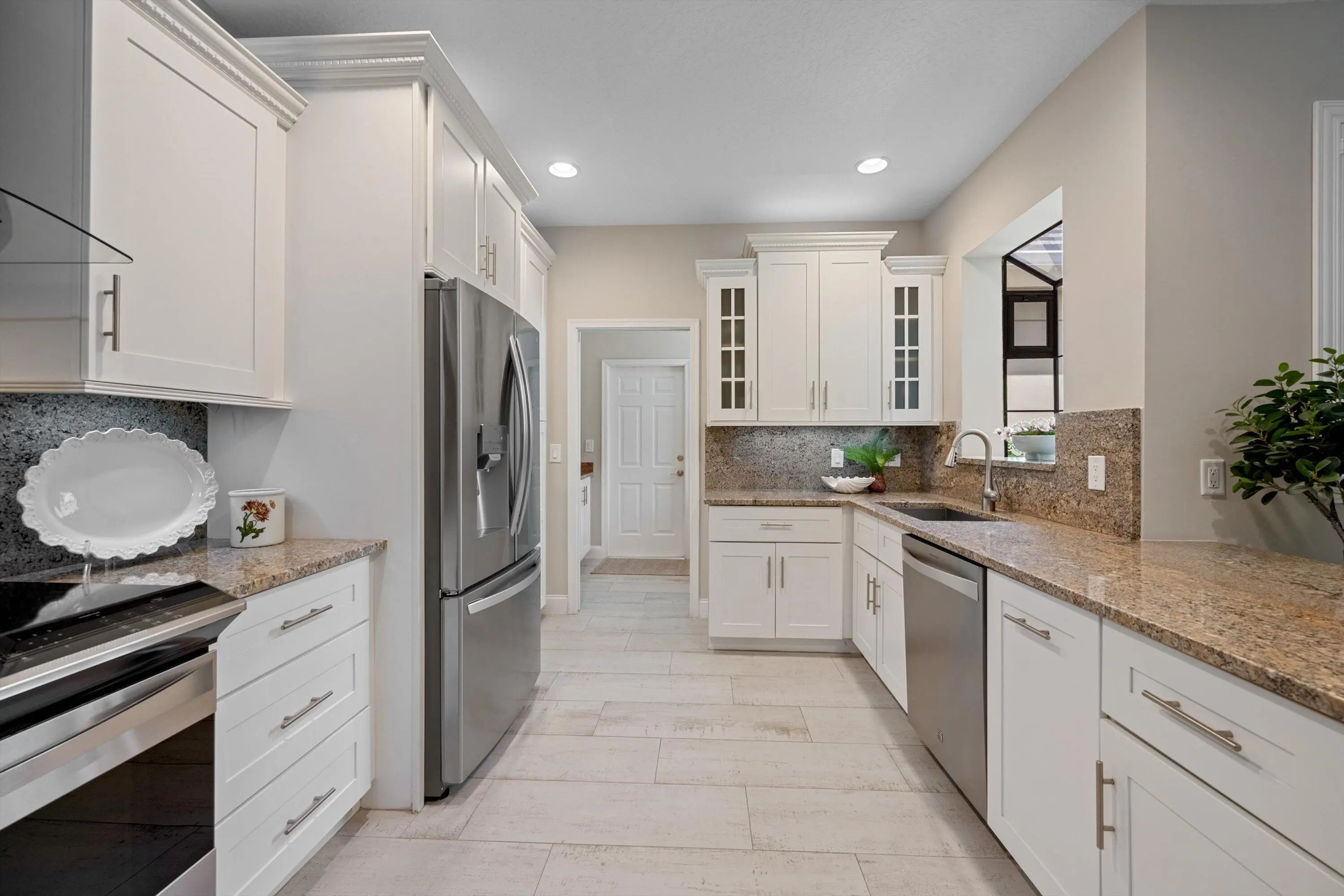 Beautifully updated ''Palm Beach chic'' home in Breakers West overlooking the scenic Mayacoo Lakes Golf Course and ready to move right in! 2 Bedroom + Office/convertible 3rd Bedroom, 2.5 Baths, generous 2 car garage and lovely updated pool/patio area. Lots of fabulous features: neutral porcelain tile floors thru out; impact sliding doors & rear windows; Plantation shutters. The updated kitchen with white shaker cabinets & granite countertops opens to the Great Room with vaulted ceilings. The Primary Suite, with its soothing ambience, features an elegant Primary bath with walk-in marble shower, white Shaker vanity with 2 sinks and marble countertops. Bedroom 2 has wonderful natural light, Plantation shutters, a large closet with its bathroom just a step away.