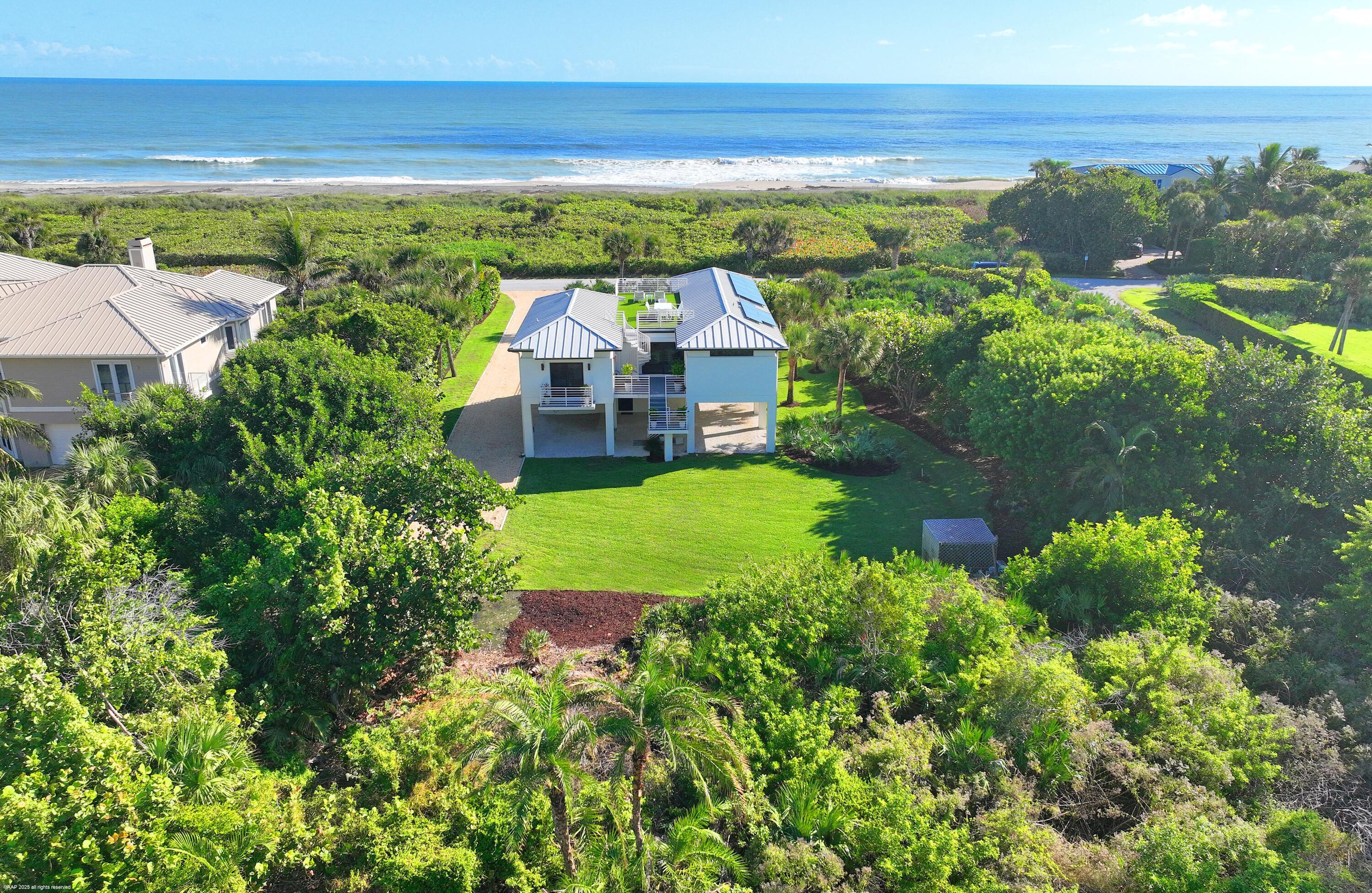 Completely renovated in 2023 this beautiful modern home has commanding ocean views just yards from the surf. The poured cement home has impact glass windows, doors and is set high on concrete pilings. Solar array panels on it's galvalume metal roof keep utility bills to a minimum. Located on a quiet stretch of Jupiter Island yet minutes to restaurants, shopping and Palm Beach International Airport it's the perfect blend of privacy and convenience. Open floor plan with ocean views from living, dining and primary bedroom suiteThere is room for a pool. Landscape plans with pool placement are located under documents tab on MLS.