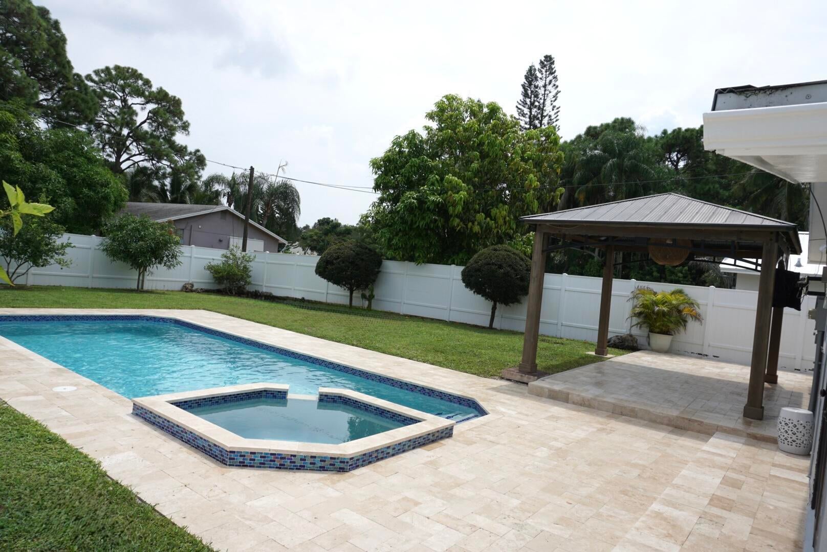 This beautifully 3 Bedrooms with private Pool renovated residence is in pristine condition. The open concept layout highlights a modern kitchen with sleek white cabinetry, quartz countertops, and stainless steel appliances. Tile flooring flows throughout the home.The spacious primary suite offers comfort and privacy, An added extension provides a versatile bonus room off the master suite and living area perfect for a home office, guest room, or den. A private laundry room adds everyday convenience. Step outside to your private retreat featuring a white vinyl fence and a large pool framed by travertine decking ideal for entertaining, family gatherings, or simply relaxing. The covered patio creates an inviting space for year round barbecues and outdoor enjoyment
