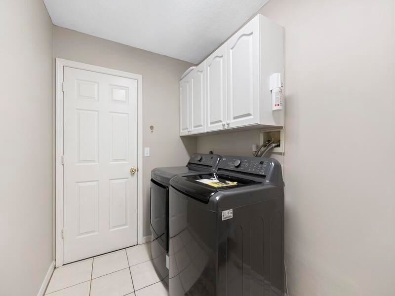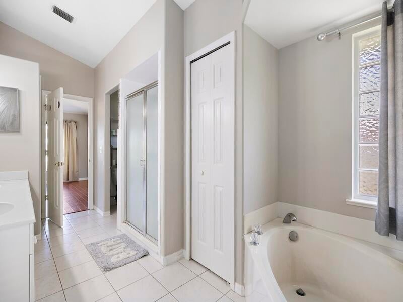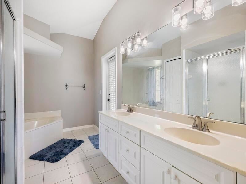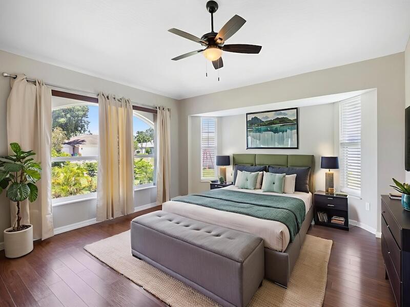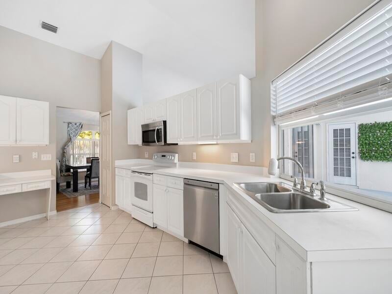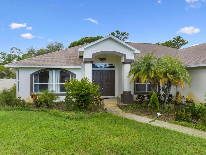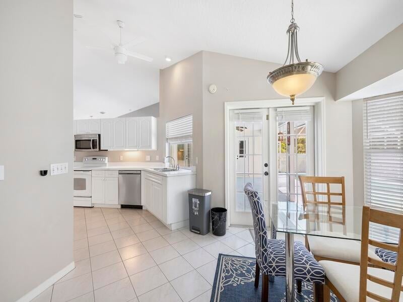 Florida Pool Paradise! Bright, open & move-in ready! NEWER roof, soaring arched ceilings, white tile & wood laminate floors. Re-piped .Triple sliders lead to a sparkling screened pool & private lanai--complete with cabana bath + outdoor shower! Chef's kitchen boasts white cabinetry, modern lighting & pass-through bar. The luxe primary suite features dual sinks, a soaking tub, walk-in closet & private pool access. Washer/dryer included. Fruit and vegetable Trees all around property. This is the one everyone will be talking about--don't miss it!