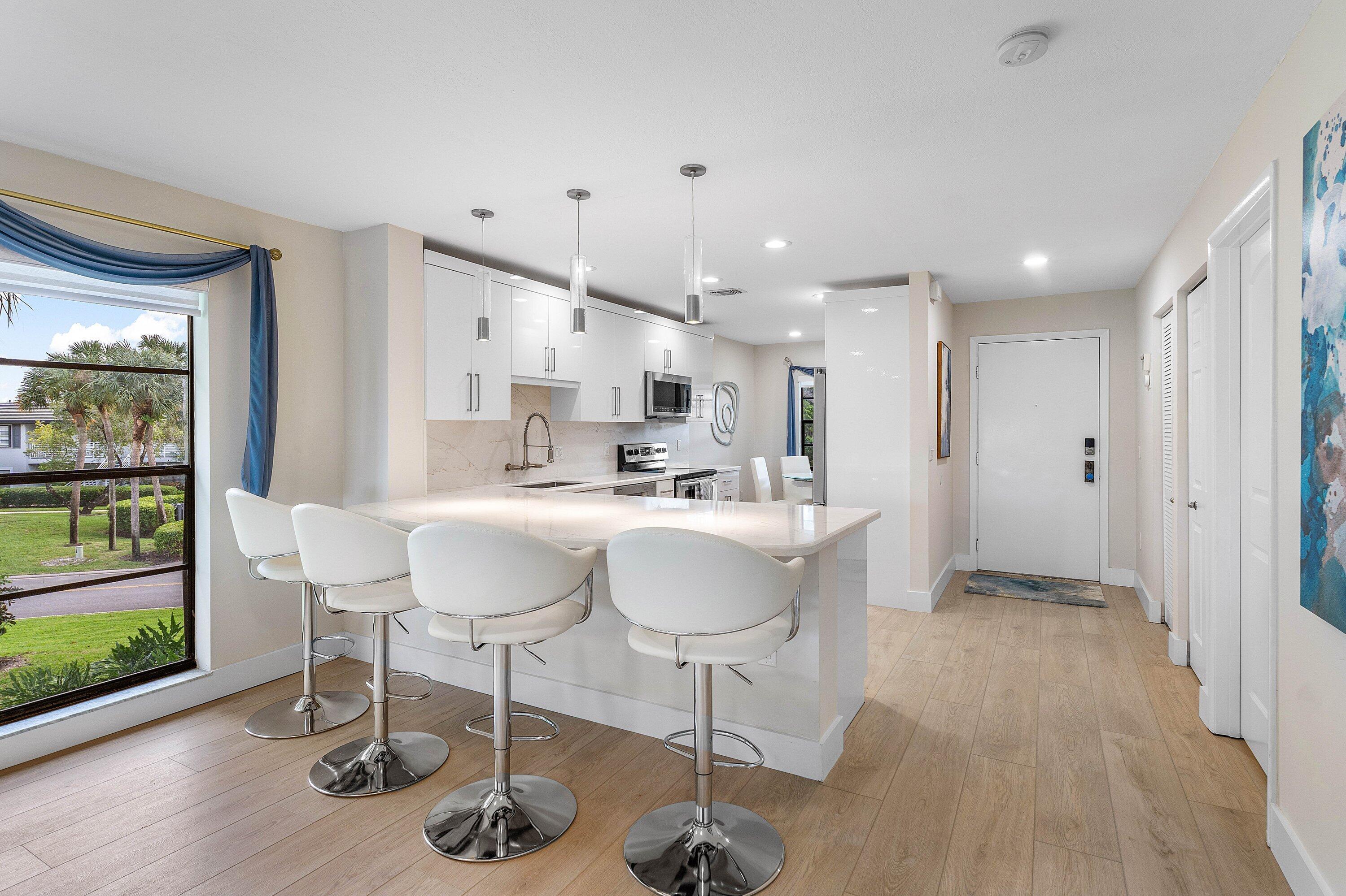 Discover move-in ready luxury with sweeping long-lake views from this recently remodeled, top-floor 2-bedroom corner residence in Southport at Hunters Run Country Club. Step inside to an airy plan featuring an open-concept kitchen with stainless steel appliances, wide-plank wood-look flooring, and recessed lighting. Retreat to a king-size primary suite with spa-inspired bath and generous custom closets; the guest bedroom mirrors the comfort in size and finish. Enjoy tranquil sunrises over water vistas from the private screened balcony. Unit includes semi-private elevator. Membership is mandatory.Experience world-class club living with 54 holes of championship golf, 18 tennis courts, 12 pickleball courts, a resort-style clubhouse and pool, salon & spa, fitness center, and six dining venues.