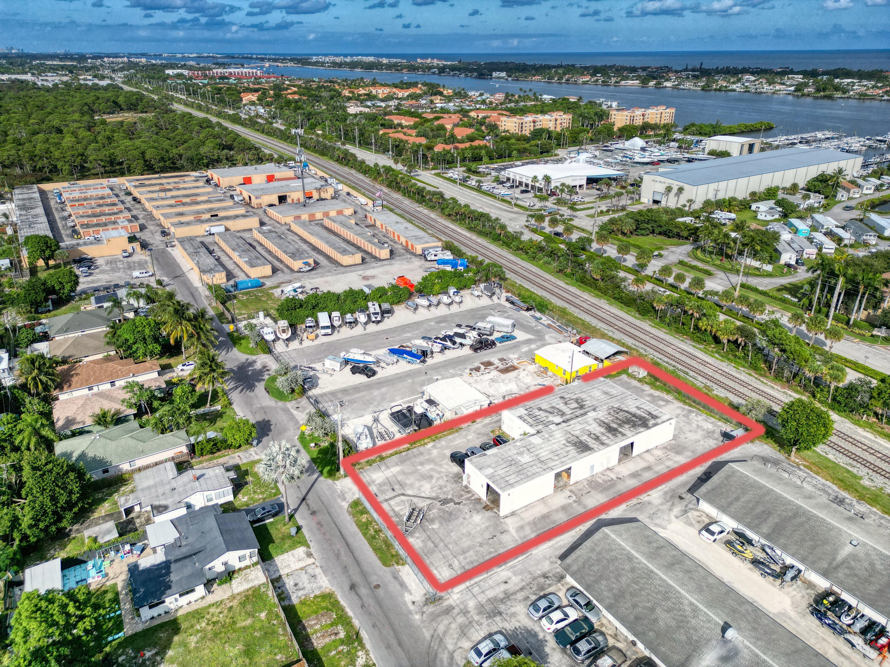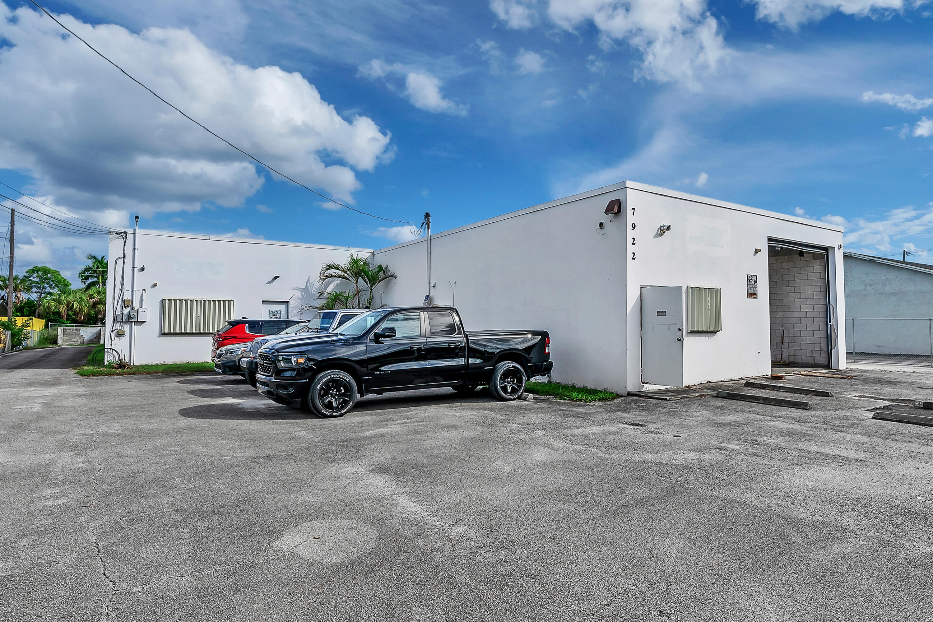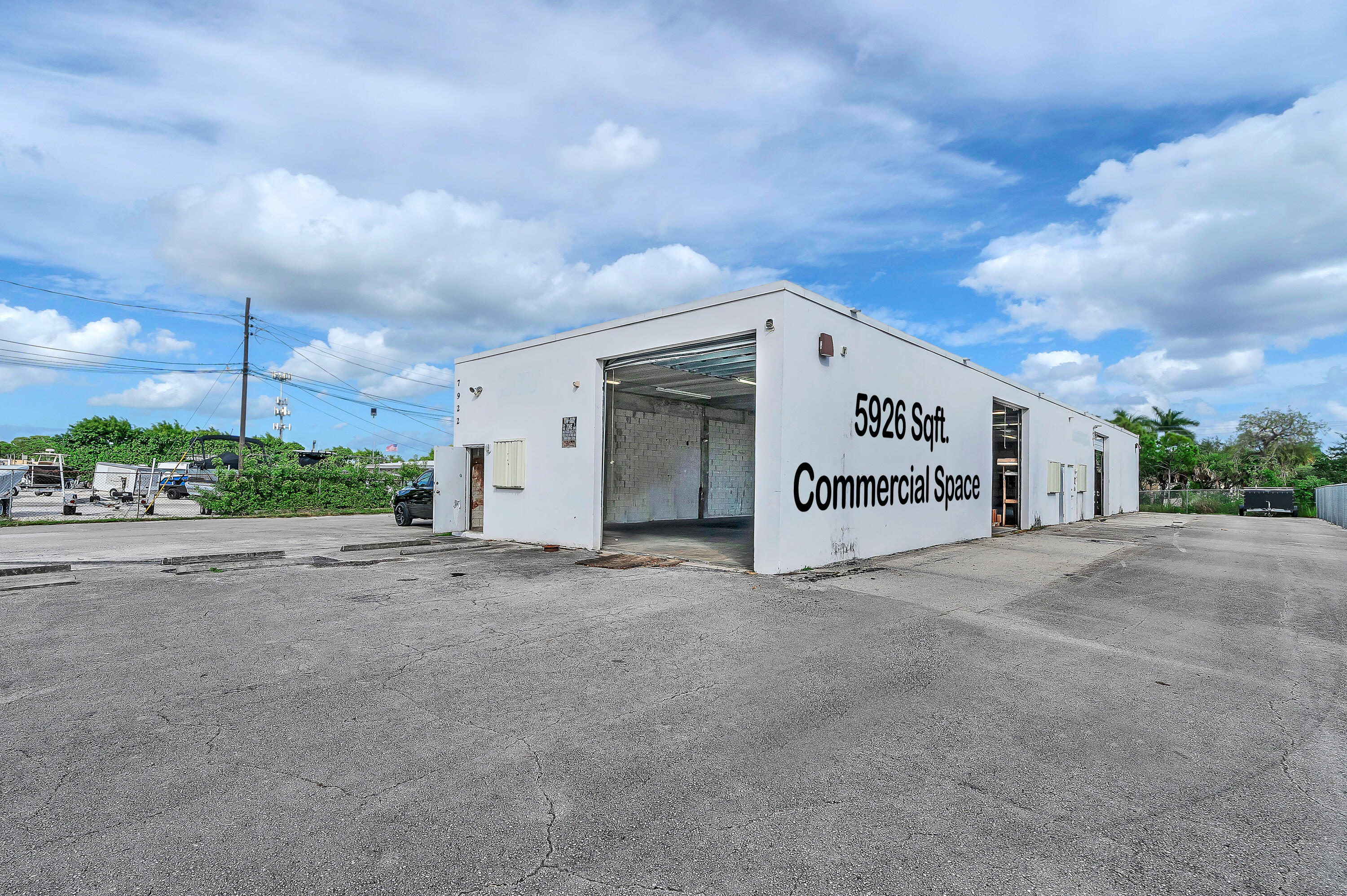 Half-acre secure fenced all paved lot with a free standing 5926' concrete warehouse building. Five 12' tall grade level overhead doors on 3 sides of the building. 13' ceilings . Commercial CS zoning. Institutional and public facilities district. Excellent central South Florida location in east Hypoluxo. Only five minutes to I-95. All sizes are approximate.