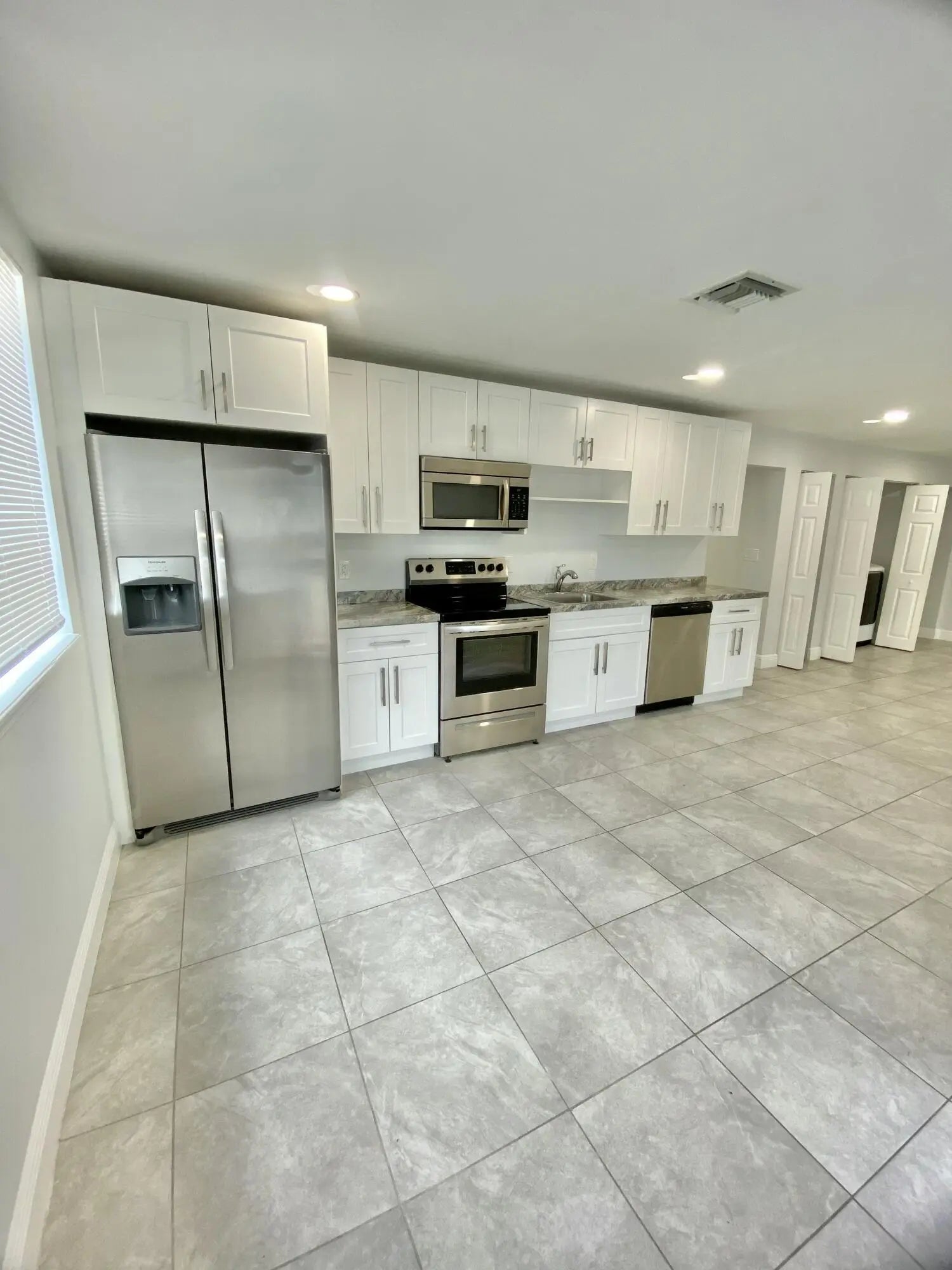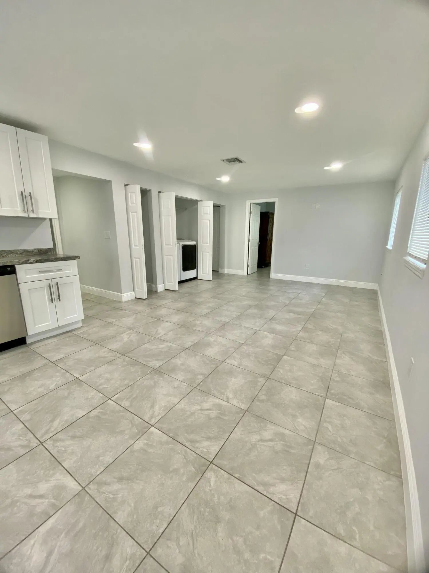 Lovely 4 room, 2 bath with tile floors and central AC. Updated white Shaker cabinetry, stainless appliances, private patio and open floor plan. Off Street parking, Light and Bright interior. Washer/Dryer included. Landlord pays for water.and lawn maintenance. Houses is entered from driveway off Neptune through the white gate. Conveniently located off Military Trail south of Southern Blvd. Call for more information.
