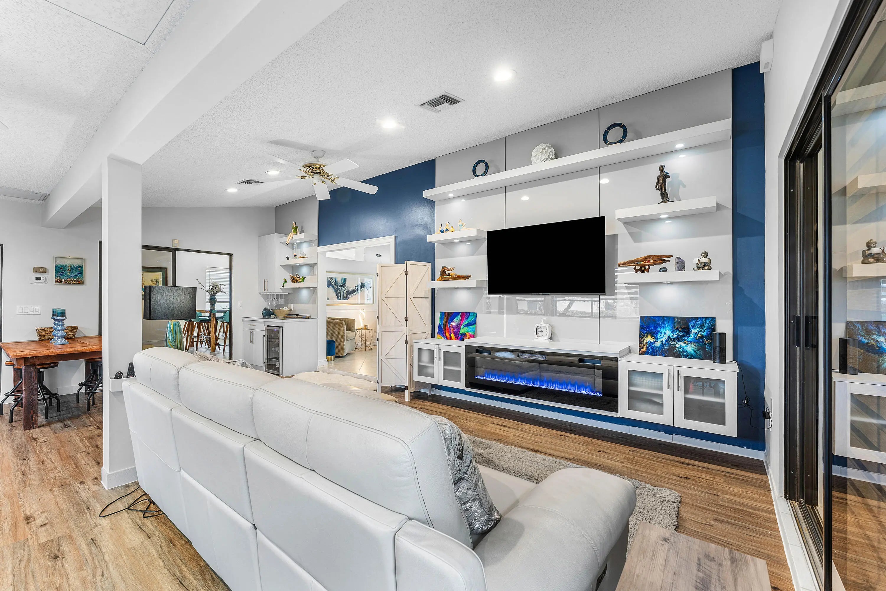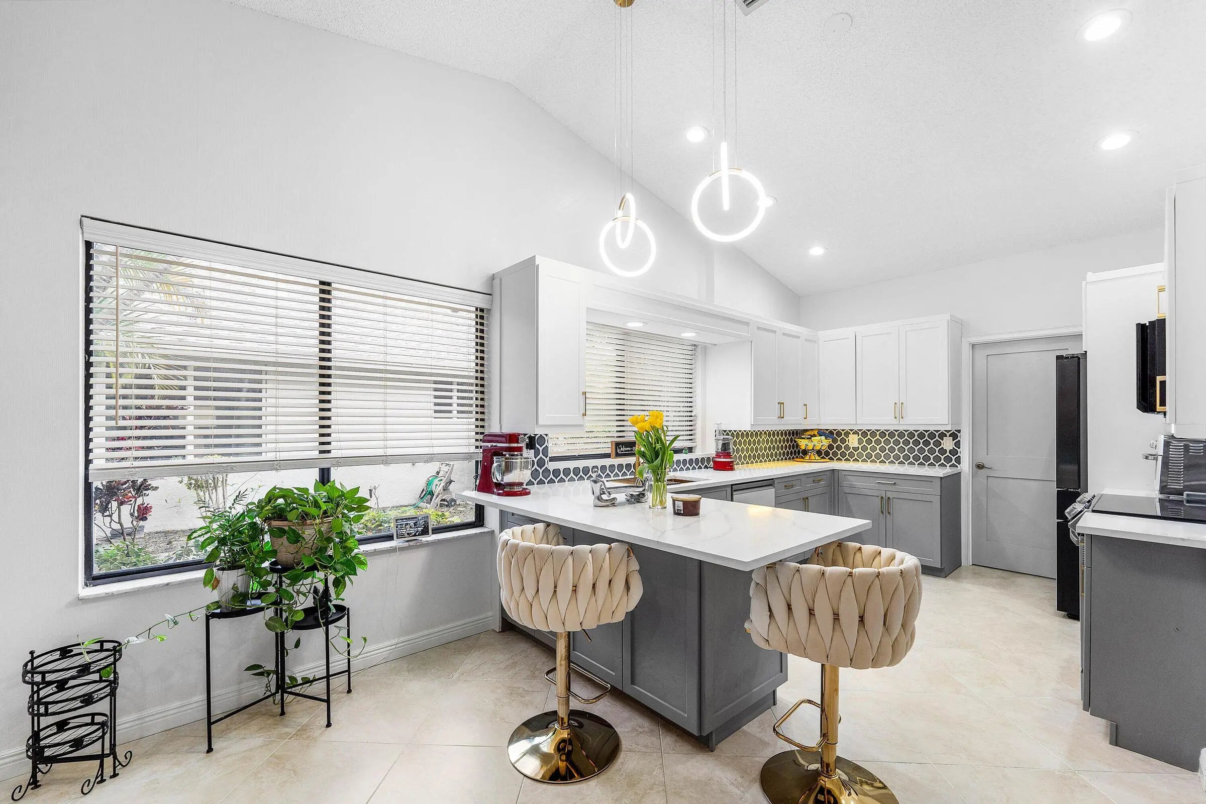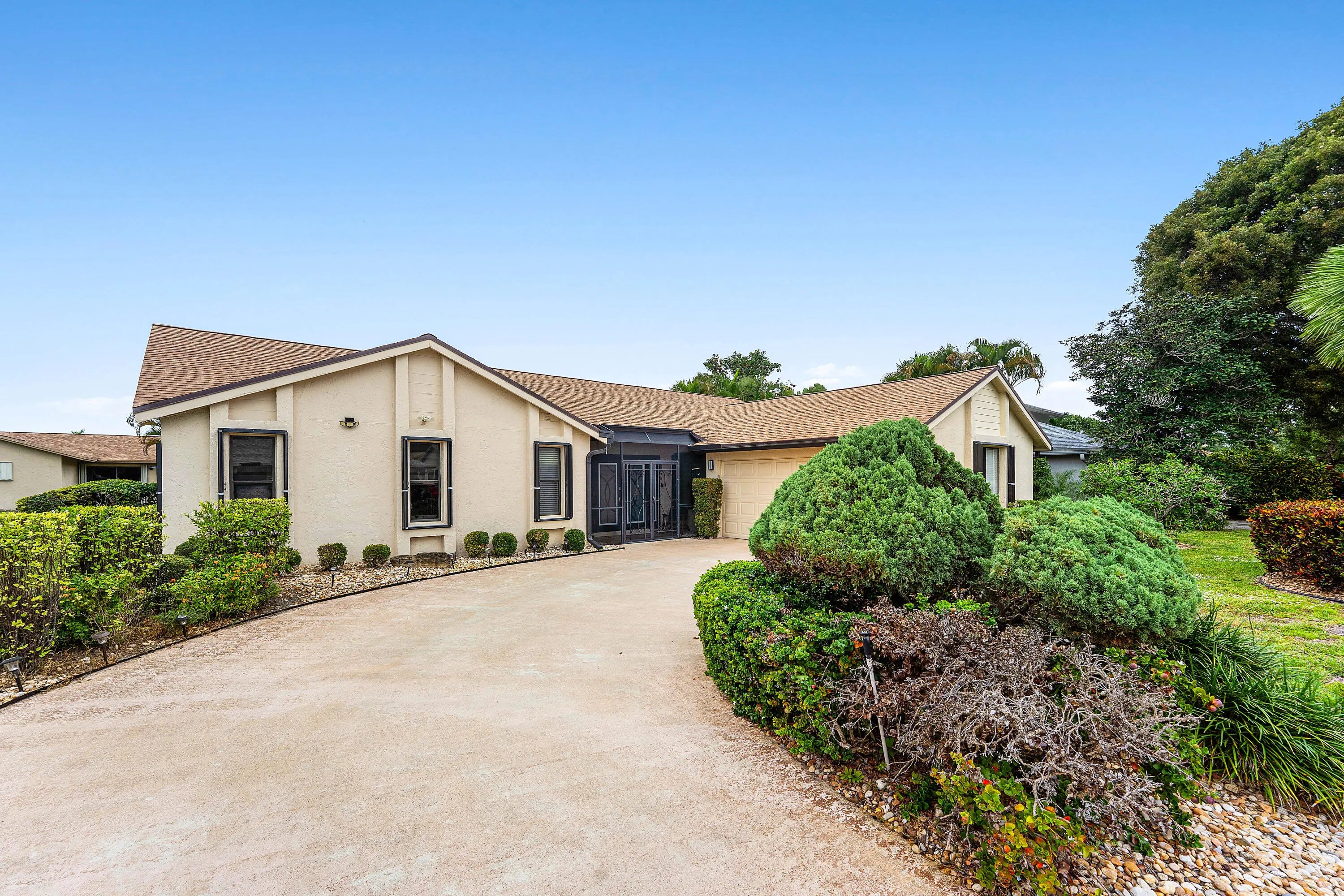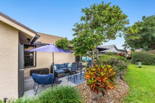 Beautifully renovated single-family home with a two-car garage in the desirable 55+ community of Rainberry Bay. This home boasts a tastefully renovated interior, with tile and luxury vinyl flooring throughout, Florida room with custom built-ins, electric fireplace, bar refrigerator, and office/optional third bedroom. The oversized renovated kitchen includes Bespoke appliances, intricate backsplash, and quartzite countertops. Updated baths feature a bidet toilet, barn-style shower door, spa-like shower system, and porcelain countertops. Living room highlights a floor to ceiling paneled accent wall. The exterior patio offers plenty of room for entertainment. Community amenities include five pools, gym and weight room, eight pickleball courts, and ten hartru tennis courts. Must see!!