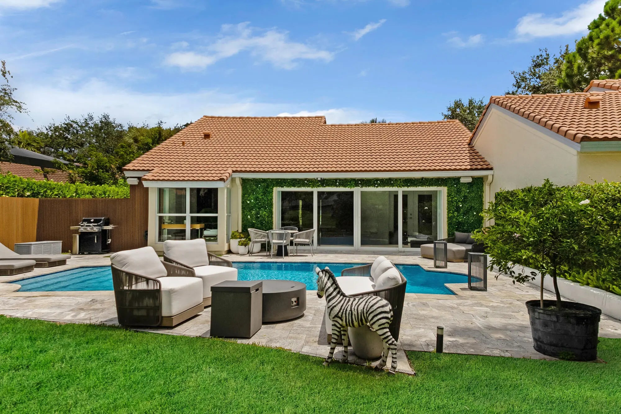 Renovated designer townhome located within the prestigious Palm Beach Polo and Country Club, a world-renowned community in Wellington, known for its upscale living and equestrian focus. The open concept with its modern kitchen, stylish baths, and natural light offers ample living space with unique architectural designs and luxurious finishes. The large patio overlooks the beautiful sparkling private pool with a view of the natural water and fountain for a tranquil setting. Enjoy high end amenities including manned gate access, tennis, pickleball, professional lessons, full gym, and hiking and biking within the nature preserve.