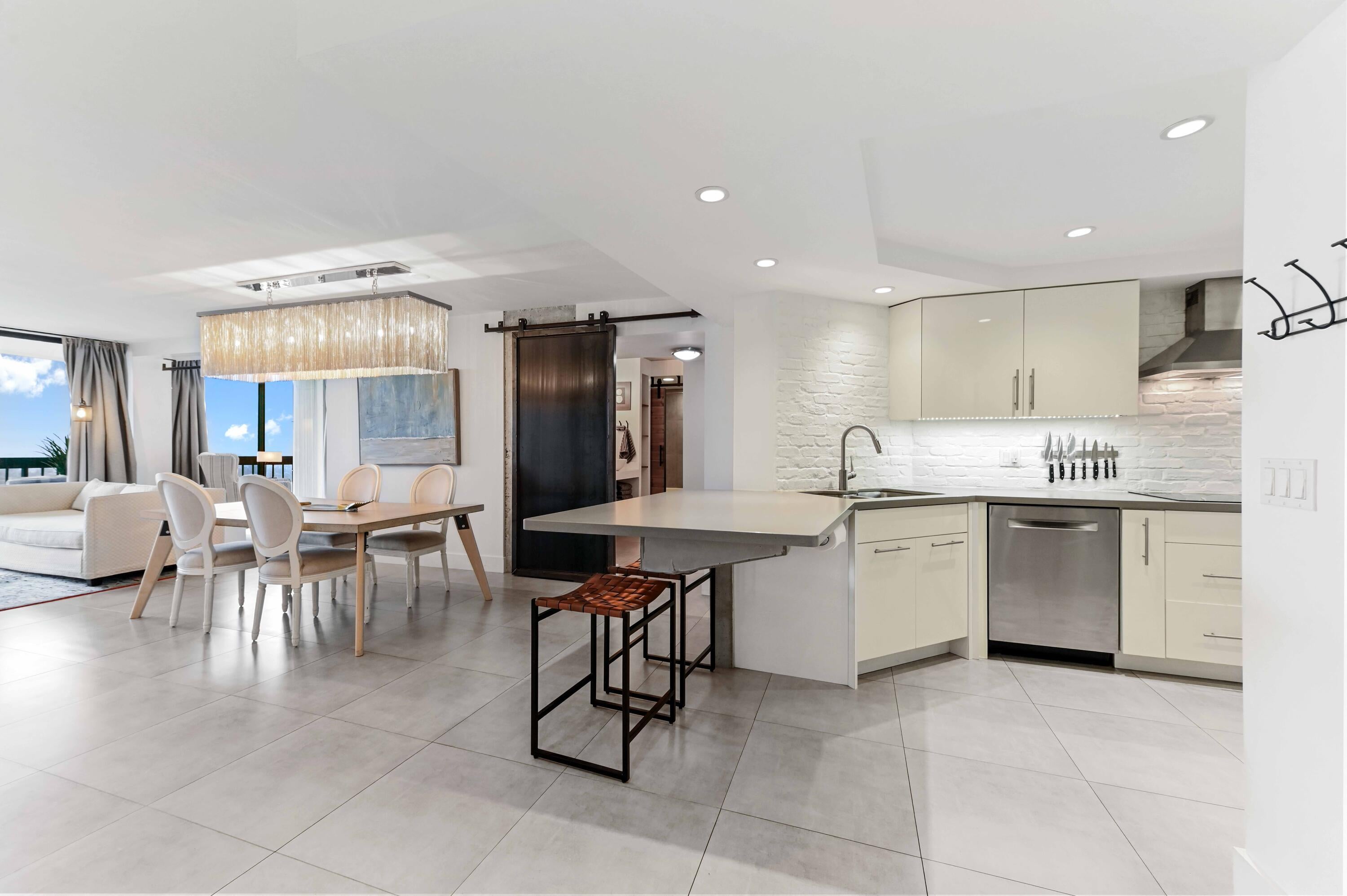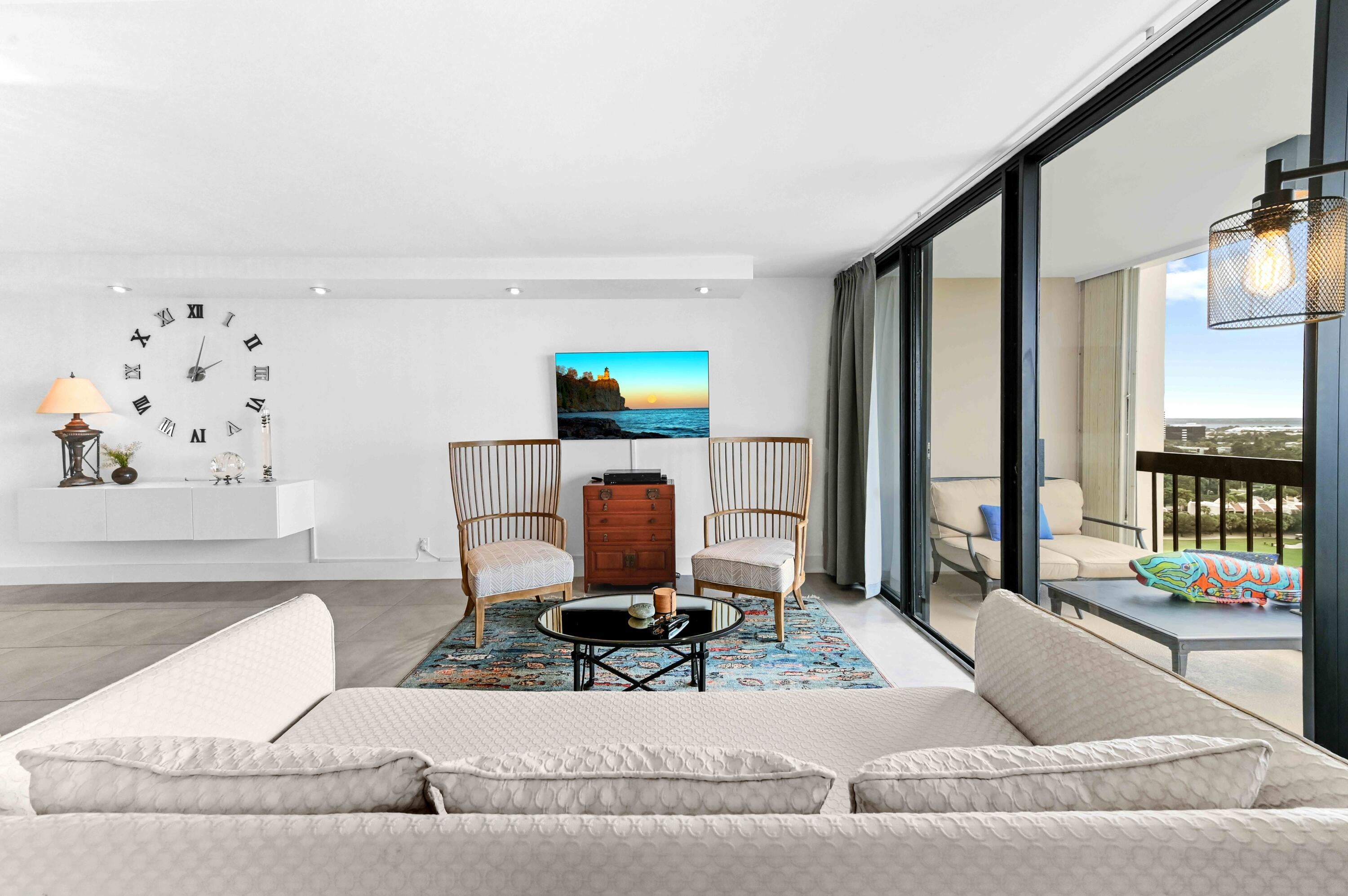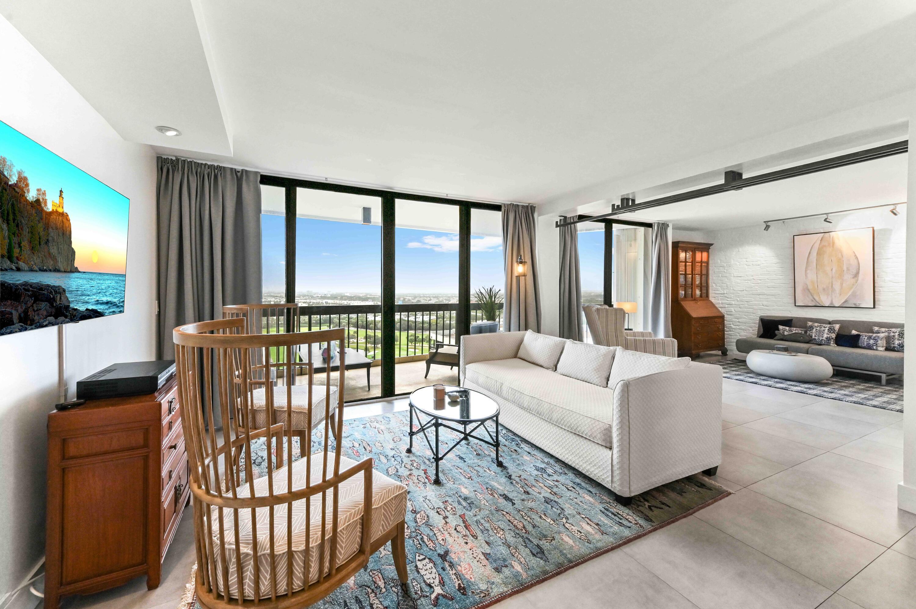 Introducing an exquisite corner residence on the 18th floor of the elegant 21-story Jefferson Tower, located within the secure, 24-hour gated community of the Lands of the President. This condominium offers an array of amenities, including a doorman, pool, gym, library, mailroom, and social area. The southwest corner 2-bedroom, 2-bath deluxe unit is artfully designed with custom concrete, industrial steel, mixed metals, pure white brick, and clean lines that harmonize modern and traditional styles.The open main living space exudes chic simplicity, complemented by built-in storage and a spacious balcony with sweeping views of the Jack Nicklaus Signature Dutchman's Pipe Golf Course. The kitchen is distinguished by top-of-the-line appliances: a Bosch dishwasher,... double ovens, an induction cooktop, and a Samsung 28 cu. ft. French 4-door Flex Zone refrigerator. It also includes a garbage disposal, concrete/quartz countertops, and exceptional storage within white lacquer cabinets. Hurricane shutters were rebuilt in 2025 for added security. The master suite is a luxurious retreat, featuring a private balcony, a walk-in closet, and a bathroom equipped with dual vessel sinks and ample storage. The second bedroom, located off the living area, serves as a versatile space for guests, an office, or a sitting area. It is elegantly enclosed by discrete pocket industrial steel barn doors and comes with its own private bath and walk-in closet. Note, Diospri custom chandelier does not convey. The building is pet-friendly, allowing up to two pets under 25 lbs. A Structural Integrity Reserve Study (SIRS) completed in 2024 ensures the building's upkeep. Concrete restoration, balconies, and exterior paint/waterproofing, and elevator upgrades have all been completed, with roof work also concluded, all previously assessed. Seller to provide a $20,000.00 escrow credit at closing to offset future ELSS or litigation assessments for a period of 3 years. See Seller's Disclosure Addendum, attached for full details. This residence boasts a prime location, offering immediate access to a variety of restaurants, shopping destinations, and entertainment options. It is conveniently located just a short distance from Palm Beach International Airport. Additionally, the esteemed culture and dining of both downtown West Palm Beach and Palm Beach Island are just moments away. Call today for your exclusive tour.