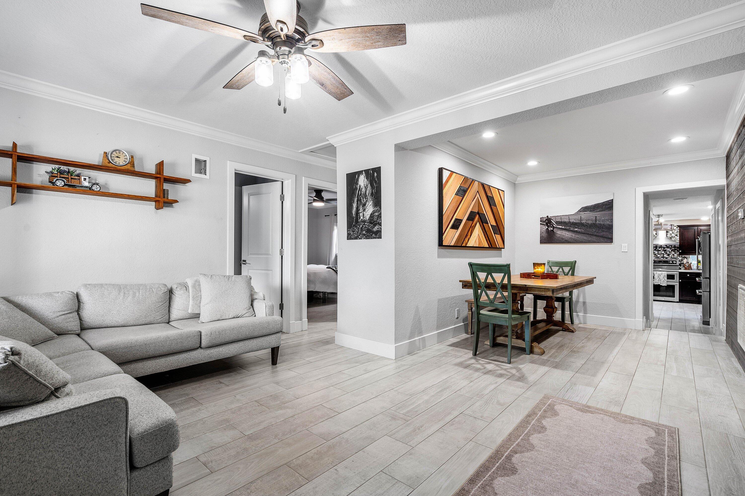 Stop your search! Beautiful 2BR/2BA CBS home with a one-car garage and no HOA. Features crown molding and tile throughout. Impact windows and doors, 2018 roof and 2020 A/C offer peace of mind. Features include a shiplap accent wall with TV included, Stacked-bedroom layout, and a kitchen with quartz countertops. Enjoy a private fenced backyard, large shed, and covered outdoor bar--perfect for entertaining. Plenty of room for boat/RV Parking. Close to the highway and beaches!