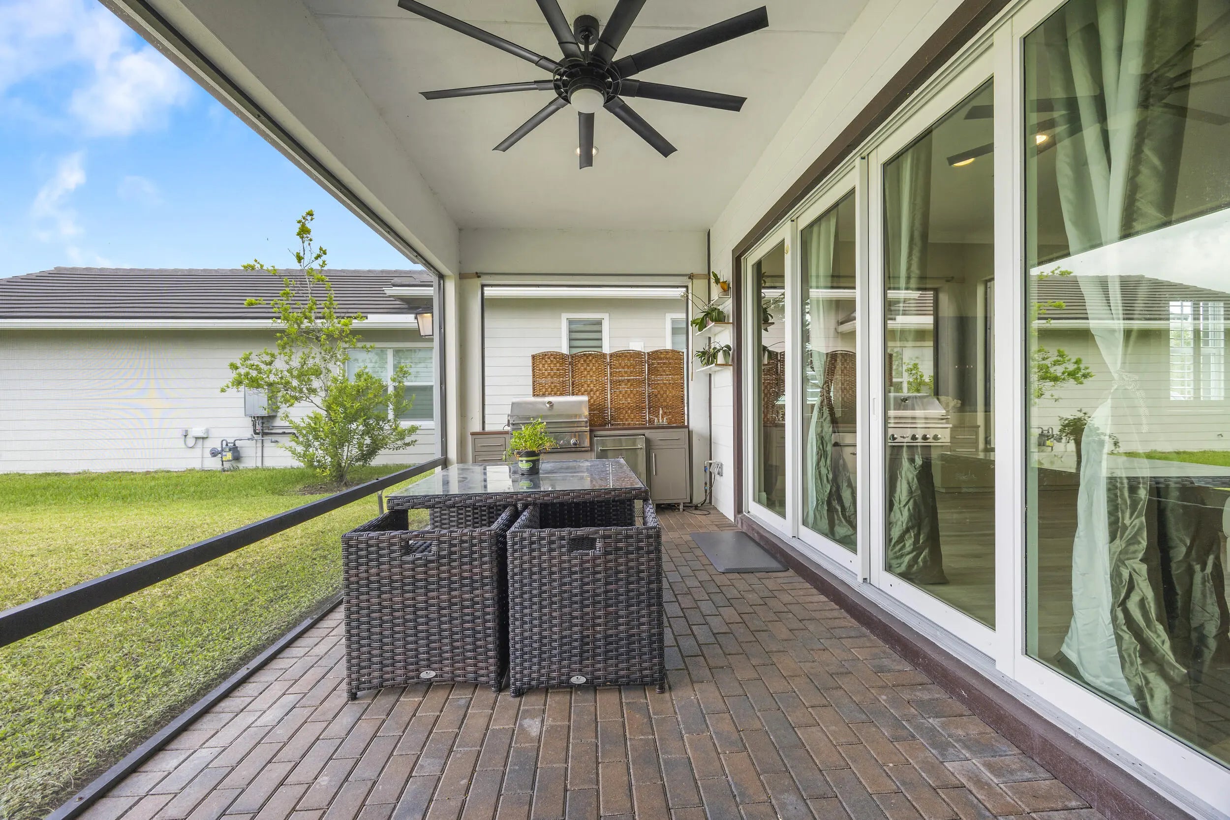 Built-in Grill, Custom Lighting, Screened Patio, Shutters, Summer Kitchen