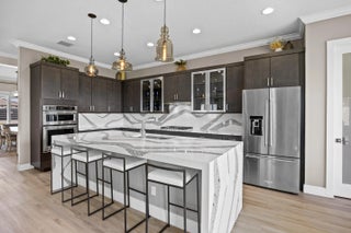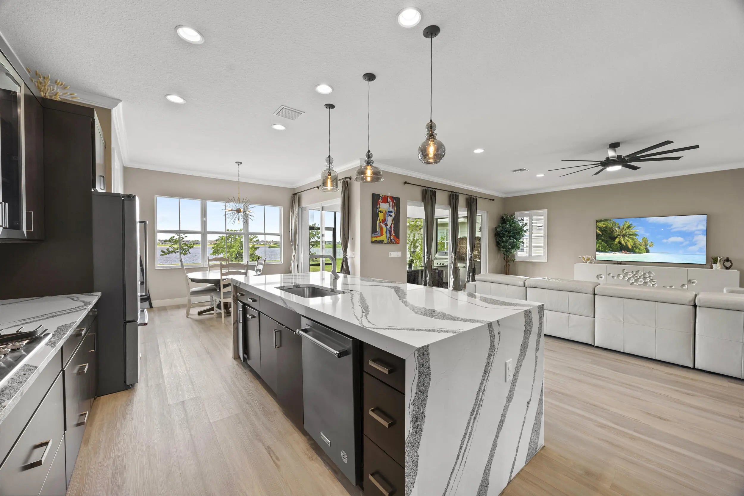Like New! Skip the wait for new construction and move right into this 2021 Kenco built lakefront home offering nearly 4,000 square feet of thoughtfully designed living space. Soaring ceilings and an open, light filled layout set the tone, paired with designer upgrades that elevate every room beyond standard builder finishes.The kitchen anchors the home with thick waterfall quartz countertops, a gas range, and generous space for gathering and entertaining. The main level features a private bonus room with a full ensuite, ideal as a second primary suite, guest retreat, or home office.Upstairs, a spacious loft overlooks the living area, while the lake view owner's suite offers a spa style bath and dual walk in closets. Three additional bedrooms and two full baths complete the upper le