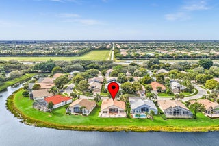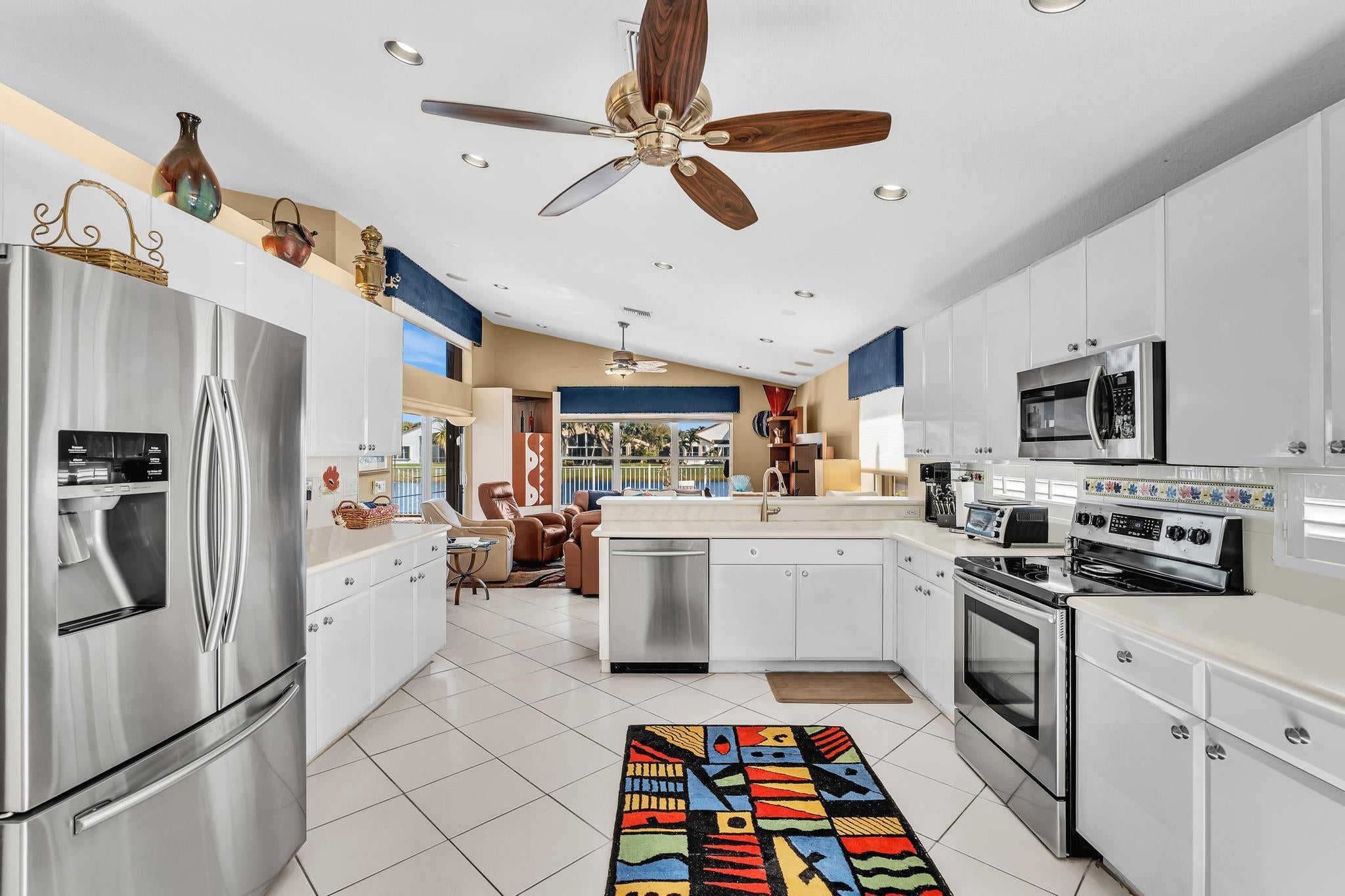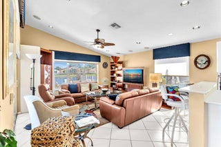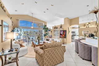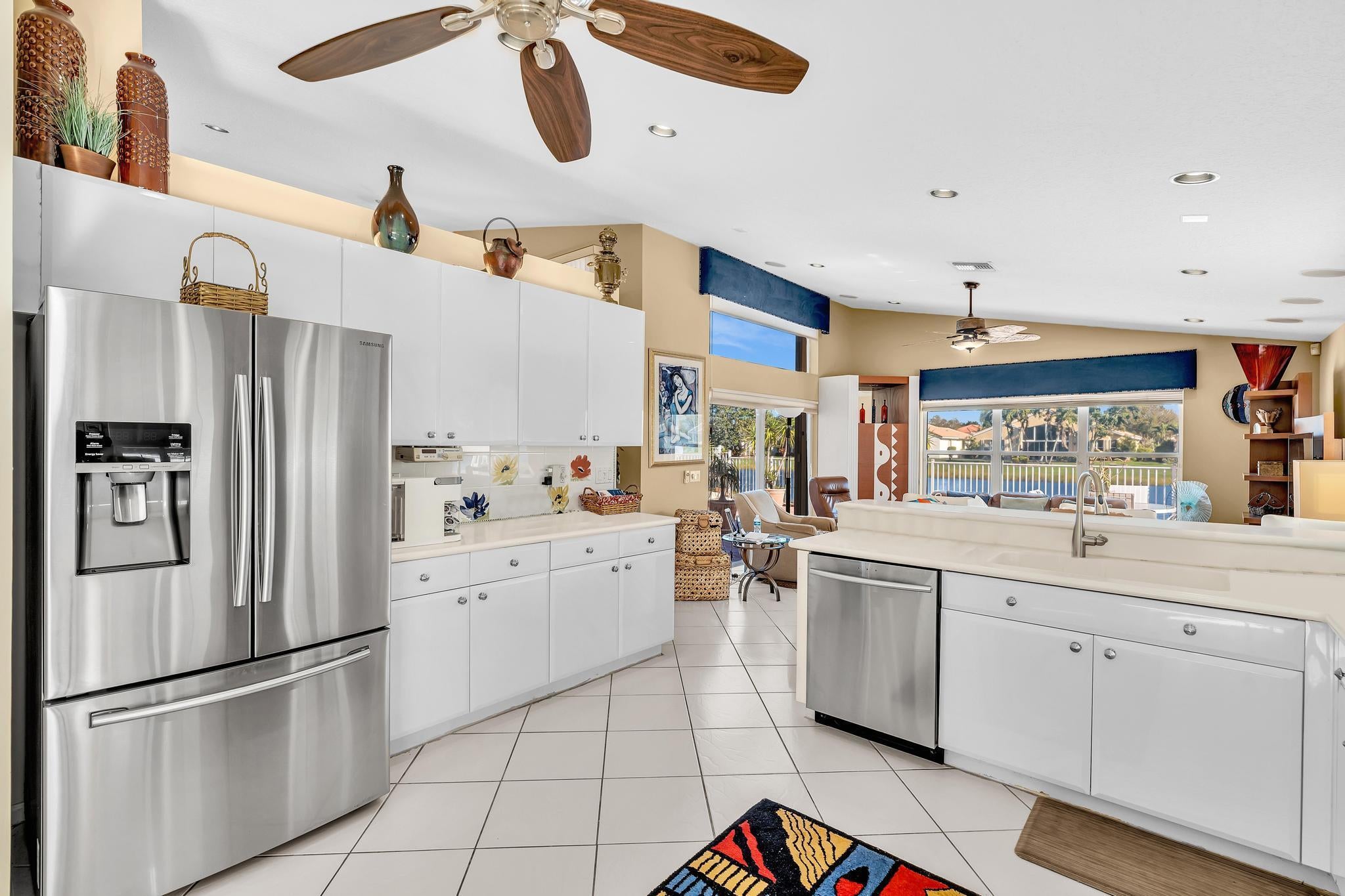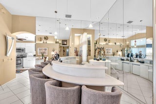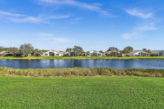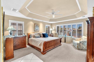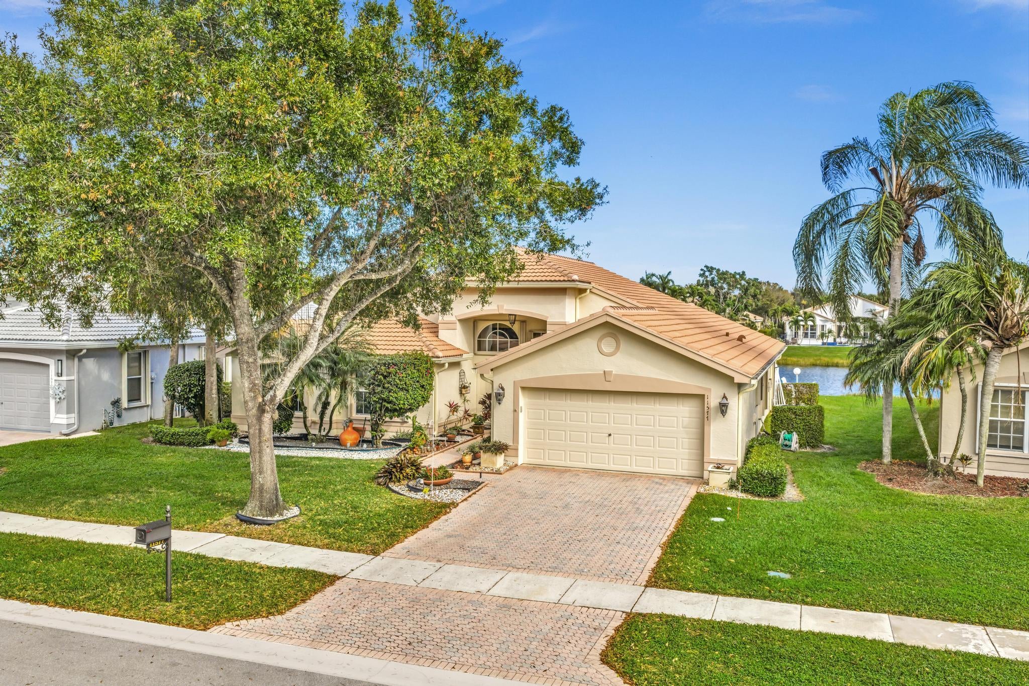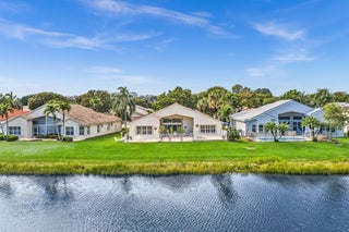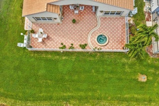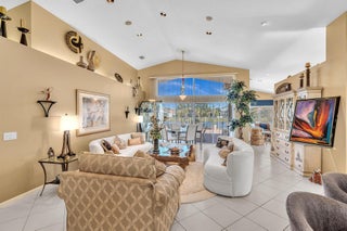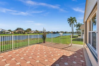 Waterfront luxury with insane panoramic lake & fountain views defines this stunning Granada model. New roof in 2025. Expansive 24'x55' bi-level patio with striking terracotta sealed pavers and contrasting diagonal white inserts offers covered and open area with inground spa-ideal for entertaining or relaxing. Exceptional curb appeal with rock garden landscaping and mature foliage, including 5 Queen Palm trees. Inside, neutral decor with elegant designer finishes and incredible custom contoured built-in bar. Kitchen has upgraded 42'' cabinets, ss appliances, decorative tile backsplash, and glass block accents. Master Suite boasts a trey ceiling, accent lighting and plantation shutters. Panoramic lake views from all primary rooms. Original owner, first time offered - elegantly appointed!