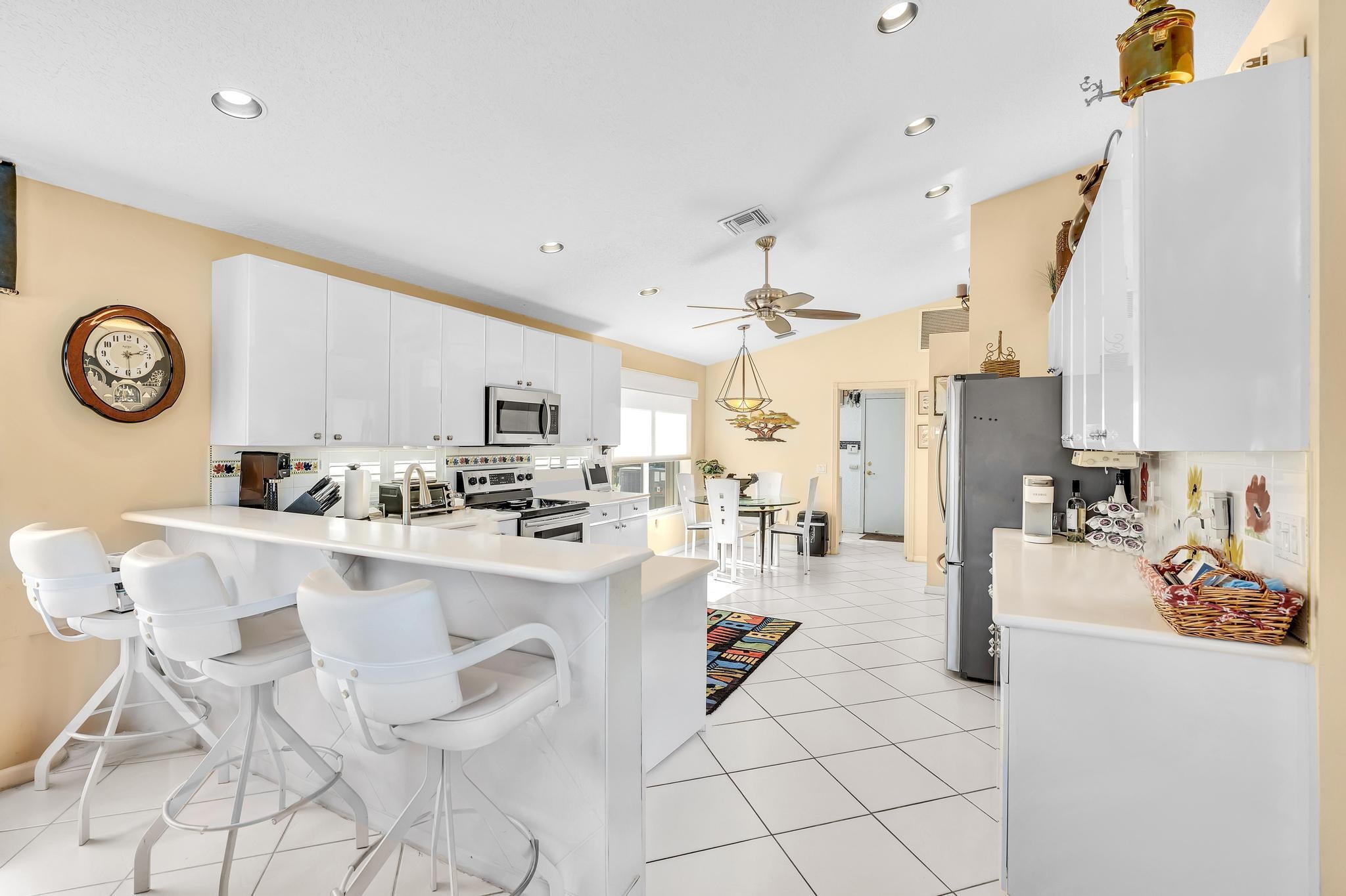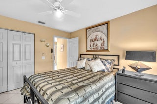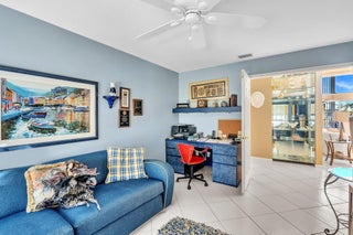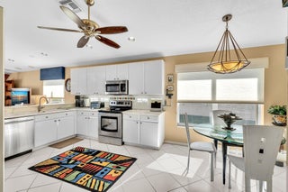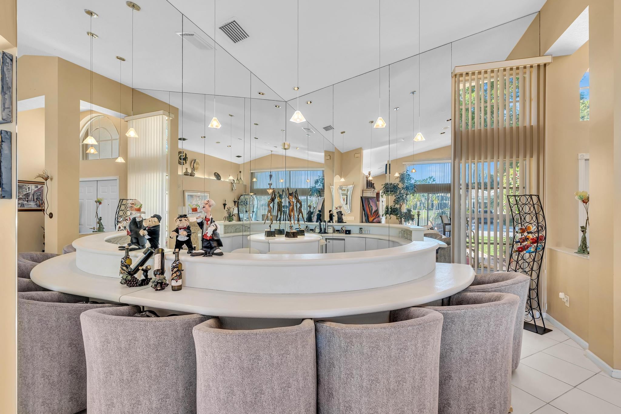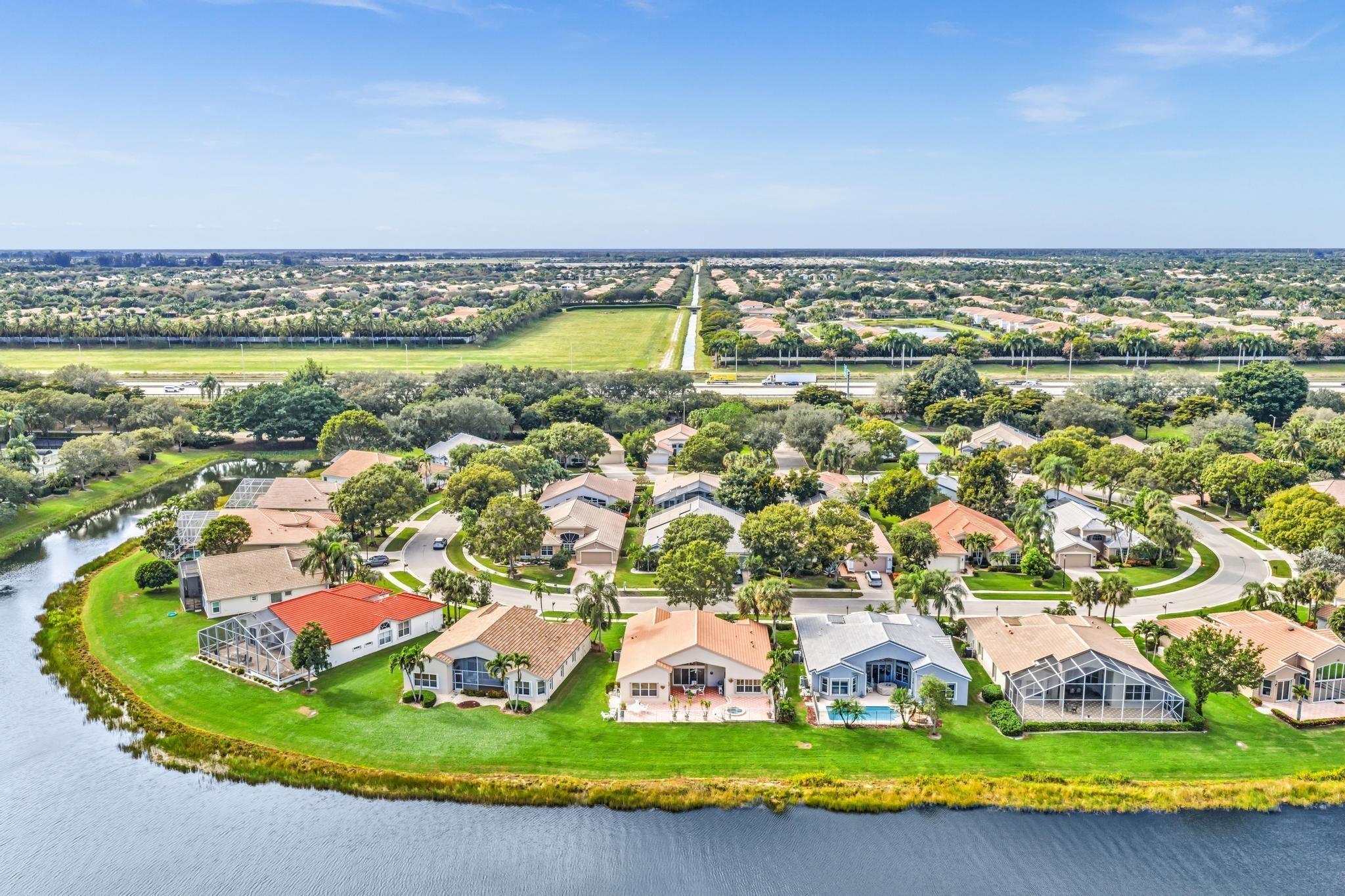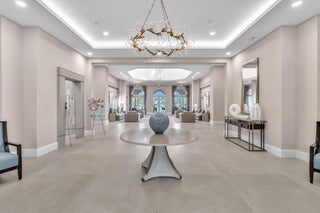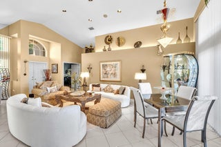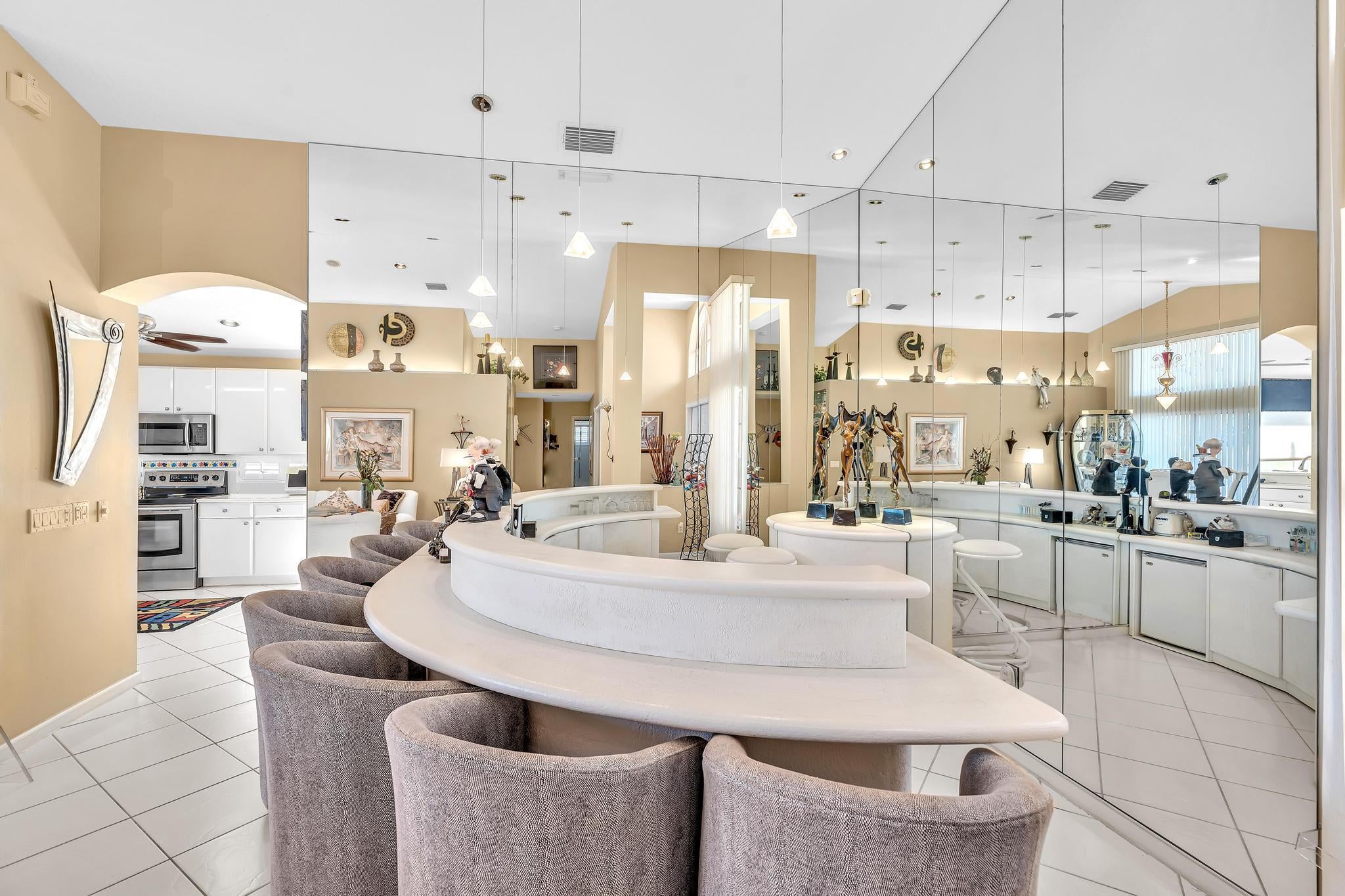 Waterfront luxury with insane panoramic lake & fountain views defines this stunning Granada model. New roof in 2025. Expansive 24'x55' bi-level patio with striking terracotta sealed pavers and contrasting diagonal white inserts offers covered and open area with inground spa-ideal for entertaining or relaxing. Exceptional curb appeal with rock garden landscaping and mature foliage, including 5 Queen Palm trees. Inside, neutral decor with elegant designer finishes and incredible custom contoured built-in bar. Kitchen has upgraded 42'' cabinets, ss appliances, decorative tile backsplash, and glass block accents. Master Suite boasts a trey ceiling, accent lighting and plantation shutters. Panoramic lake views from all primary rooms. Original owner, first time offered - elegantly appointed!