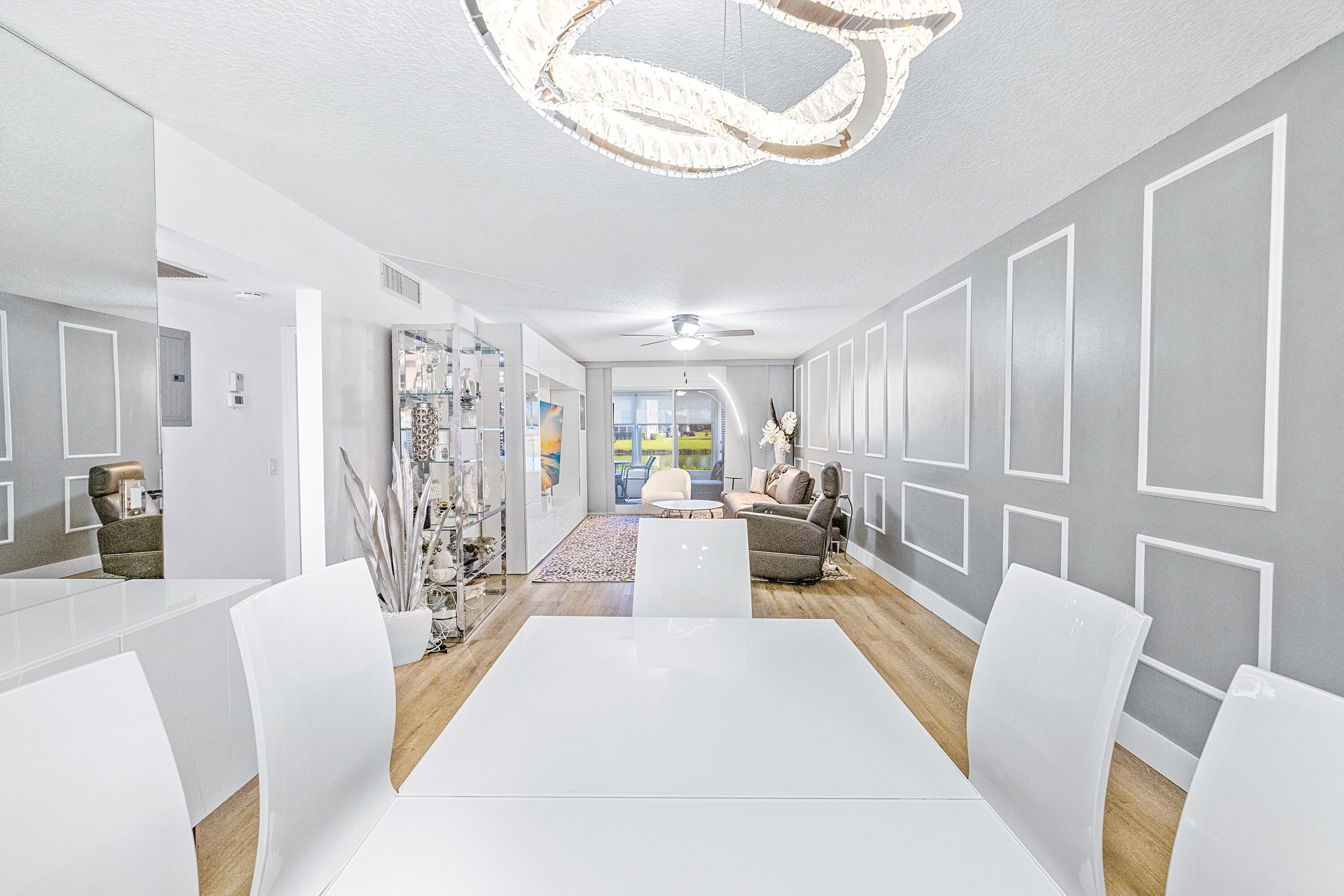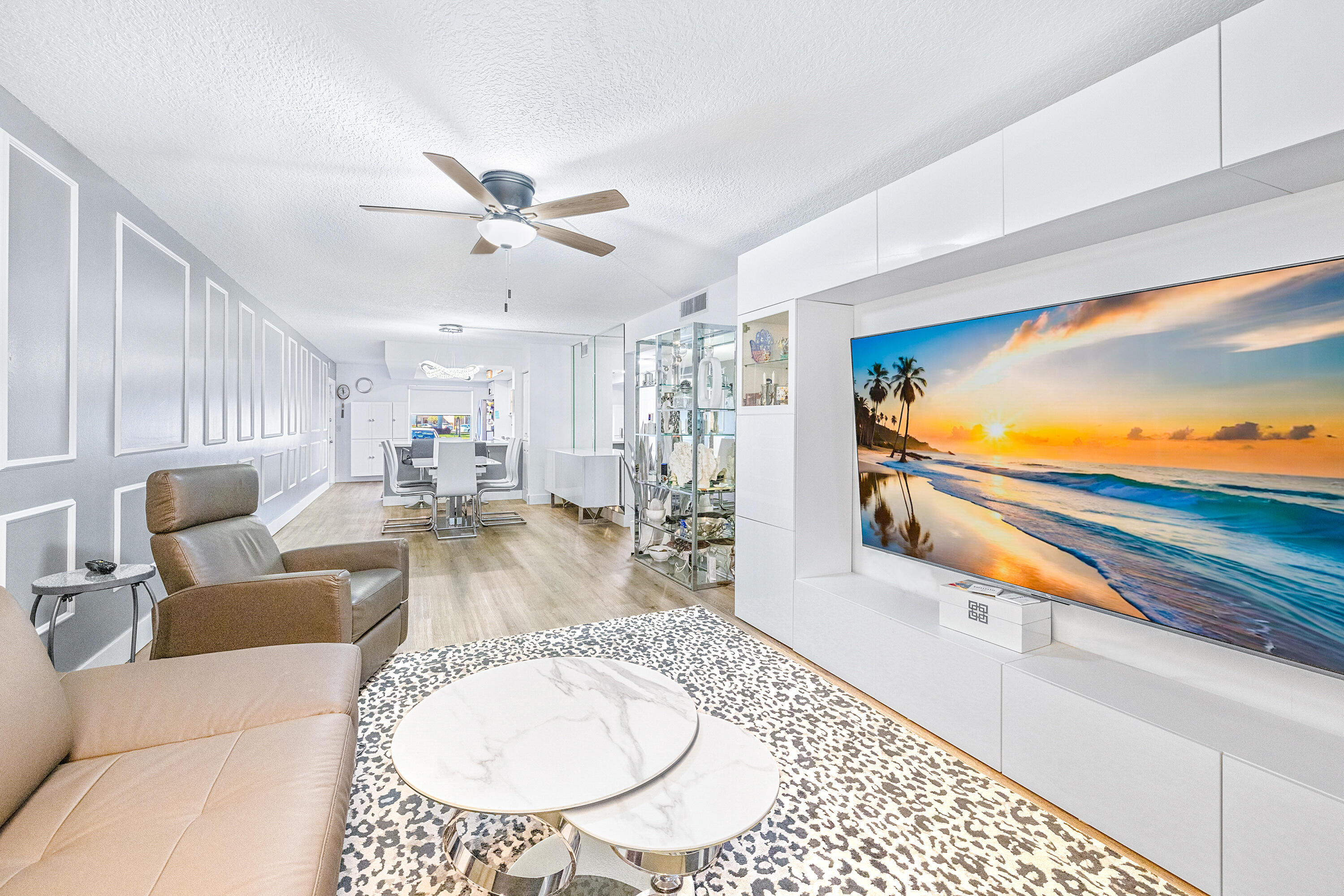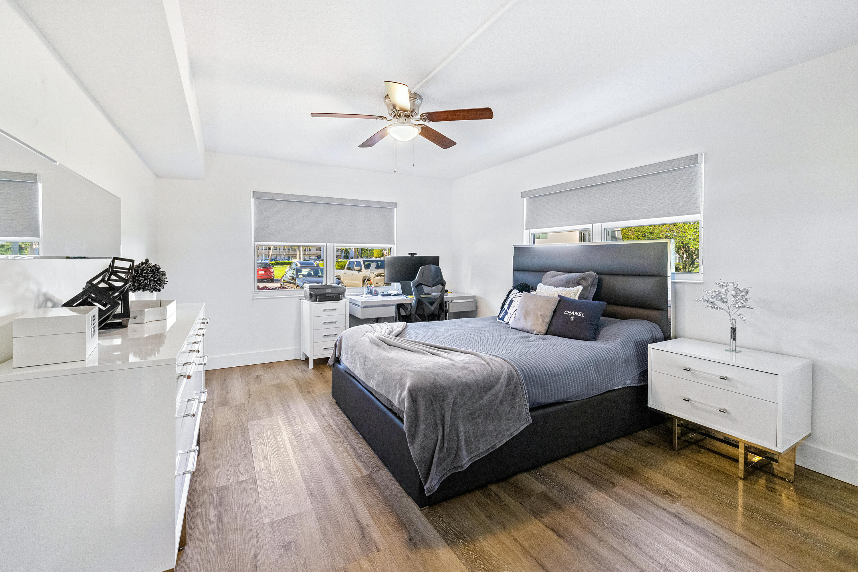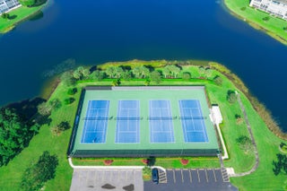 This stunning, recently remodeled 2 bedroom, 2 bathroom GROUND floor CORNER unit features spectacular LAKE VIEW! There is LVP flooring throughout. The open-concept kitchen is equipped with quartz countertops, stainless steel appliances, and plenty of raised shaker cabinets. The spacious primary bedroom offers a walk-in closet. Both bathrooms are equipped with a shower with a seamless glass enclosure. Living areas are finished with stylish picture frame moldings. Century Village is an amazing, active 55+ community that offers a swimming pool, fitness center, tennis and pickleball courts, clubhouse, card room, a movie theater, numerous clubs, classes and endless activities. The community is conveniently located to many shops and restaurants. All measurements are approximate.