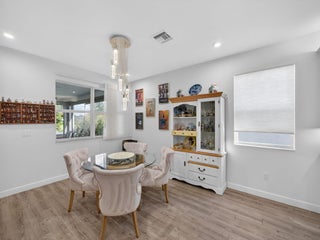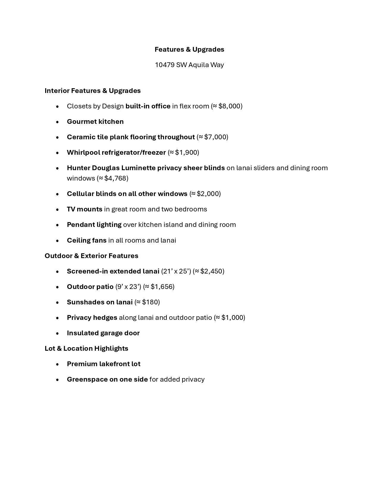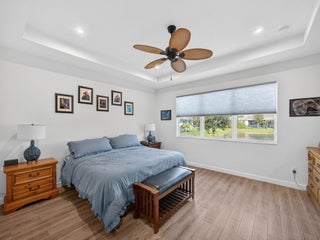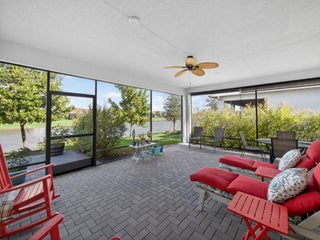 Situated on a premium lakefront lot with lush greenspace on one side, this impeccably upgraded residence located in Telaro at Tradition offers refined indoor-outdoor living and elevated design throughout. Thoughtfully curated enhancements blend luxury, comfort, and functionality in every space. The home features ceramic tile plank flooring throughout, creating a seamless, modern aesthetic. A gourmet kitchen anchors the living space, accented by designer pendant lighting and ideal for both entertaining and everyday living. The flex room has been transformed with a custom Closets by Design built-in office, providing a sophisticated and highly functional workspace.Expansive sliders open to a screened, extended lanai and adjacent outdoor patio, offering the perfect setting to relax while enjoying tranquil lake views. Privacy hedges and lanai sunshades enhance comfort and seclusion, creating a true outdoor retreat. Premium window treatments include Hunter Douglas Luminette privacy sheers on lanai sliders and dining room windows, complemented by custom cellular blinds throughout the remainder of the home. Ceiling fans in every room and the lanai, an insulated garage door, and a Whirlpool refrigerator/freezer add comfort and efficiency. Additional upgrades include TV mounts in the great room and two bedrooms, completing this move-in-ready home designed for effortless Florida living. This exceptional property combines a coveted lot, high-end finishes, and thoughtful upgrades an ideal opportunity for buyers seeking luxury, privacy, and style. HOA covers cable, internet, lawn care, security, and community events. Ideally located near Cleveland Clinic, top medical facilities, the upcoming Heart of Tradition shopping center, and the future Stars & Stripes Sports Park.