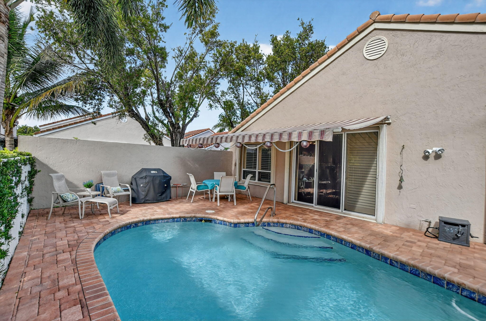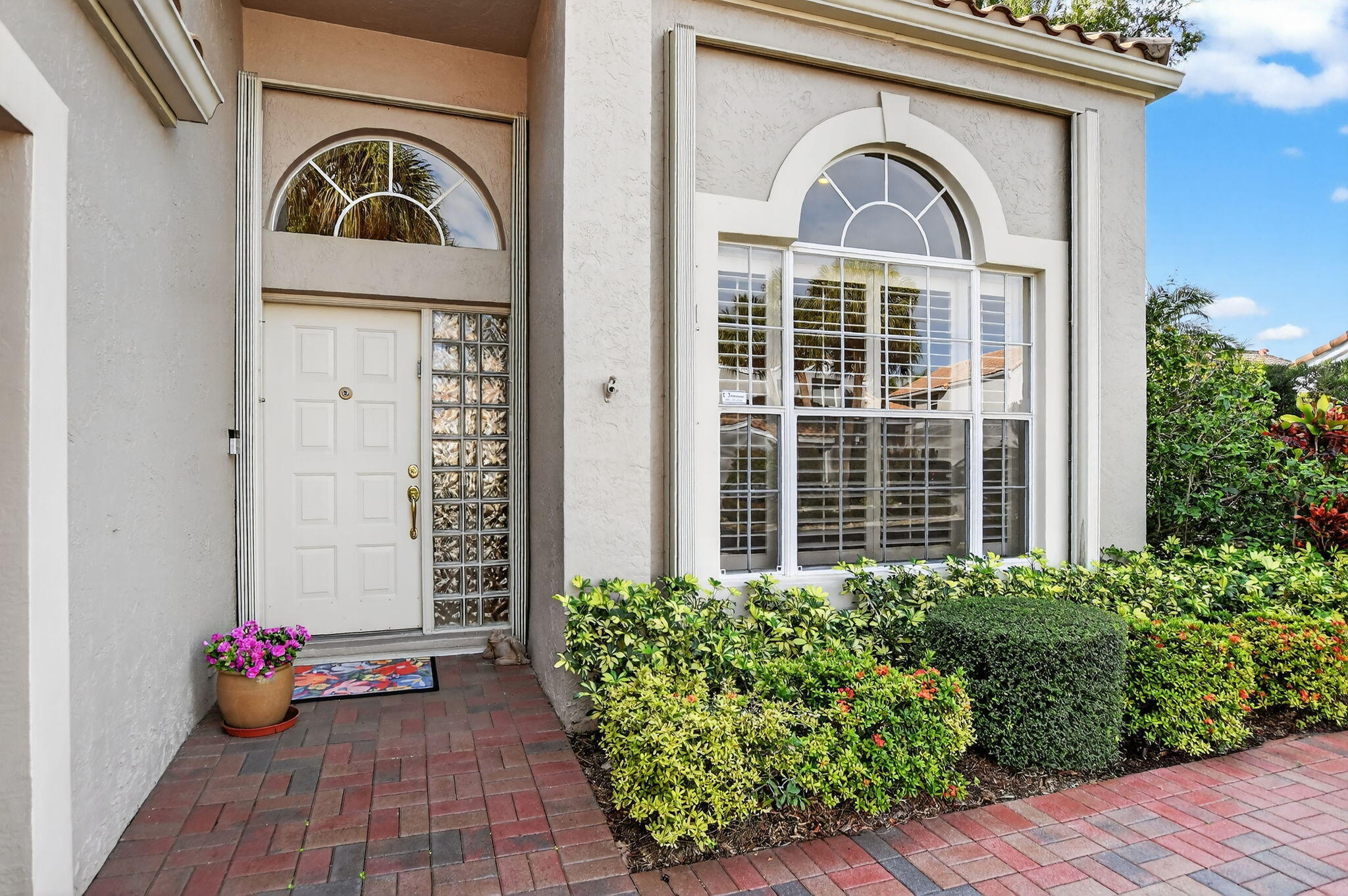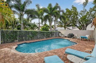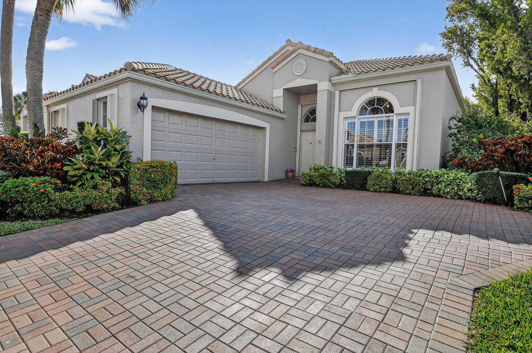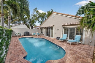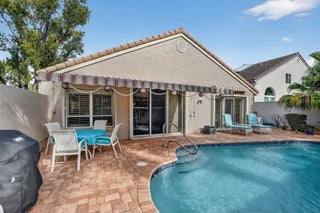Enjoy amazing sunrise views over the lake from your own tropical oasis. The patio has two electric awnings with lights making it easy to relax outside even on those super-sunny days and at dusk. Light-filled one-story home with 3 bedrooms 2 baths and a 2-car garage. Plantation Shutters throughout. Quartz counters in kitchen. Beautiful remodeled baths. Hurricane resistant garage door and Accordion Shutters throughout. Roof 2009. Solar hot water heater and solar panels 2009. Brick paver driveway 2009. Situated in the only non-gated community in Boca Pointe, Palladium has just 35 homes. Residents enjoy a low-maintenance lifestyle. Included in the low monthly HOA is lawn care and roving security.Optional membership at the Club at Boca Pointe offers access to 18-hole championship golf course designed by Jack Nicklaus, world-class tennis facility, state-of-the-art fitness center, resort-style pool, fine dining and a calendar of social events that will keep you as busy you want. Perfectly situated in central Boca Raton just minutes from Town Center Mall, Mizner Park, downtown Boca Raton, beautiful beaches and top-rated Palm Beach County Schools. With it's fabulous location, this immaculate home is an incredible opportunity to experience luxury, comfort and convenience of Boca Raton and Boca Pointe living. Sellers preferred privacy and planted bushes, but they can be removed if you want a lake view. All measurements and information deemed accurate but not guaranteed or warranted.
