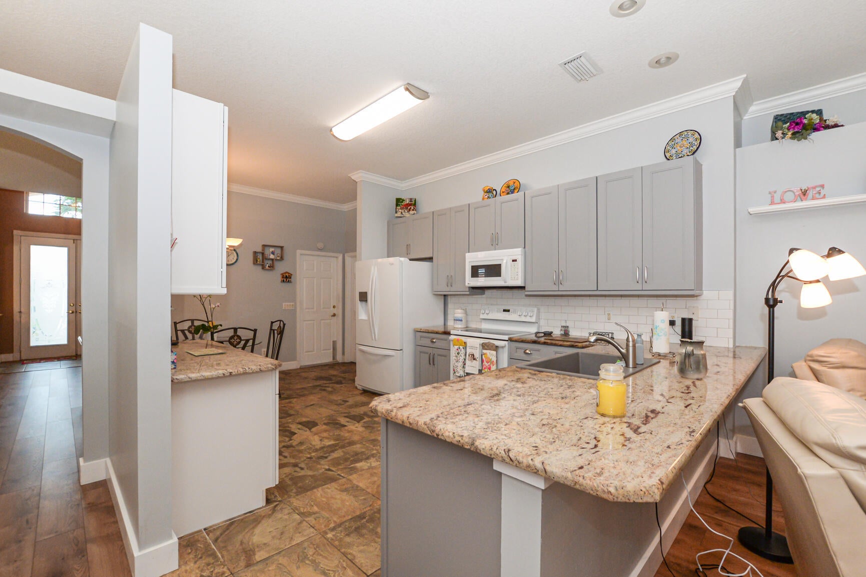 BEAUTIFUL home in Isle of Capri at Kings Isle 55+ community in the heart of St Lucie West. This Monte Carlo model has wonderful curb appeal, front porch, double glass doors & corner property. Features CBS Construction, Barrel tile roof, paver driveway, 3 BR's, 2 BA's & 2 CG. Updated Luxury Vinyl & Tile Flooring. Boasting updated eat in Kitchen, new refrigerator, 42'' cabinets, granite counter tops, breakfast bar & pantry. Spacious living Room, dining room & family room. Split floor plan, updated interior paint, Plantation Shutters, volume ceilings & move in condition. Large Laundry Room has washer, dryer, sink & cabinets. Extended screen enclosed lanai with garden views. Accordion shutters. Updated Water Heater & Electric Panel 2023, A/C 2021, Home shows well & furniture is negotiable.Included in HOA fee: Manned gated security, lawn care, cable, internet, common area & club house. Kings Isle offers something for everyone, grand clubhouse with exercise room, card room, craft room, ball room, tennis, resort style pool and spa. St Lucie West is a planned community with new stores, restaurants, doctors offices, golf courses and even home of the NY Mets spring training. The Treasure Coast boasts about beautiful waterways and beaches with a fabulous location. Only 45 minutes from the Palm Beach Airport, Garden Mall & 1.5 hours from Orlando going north and Ft. Lauderdale going south.