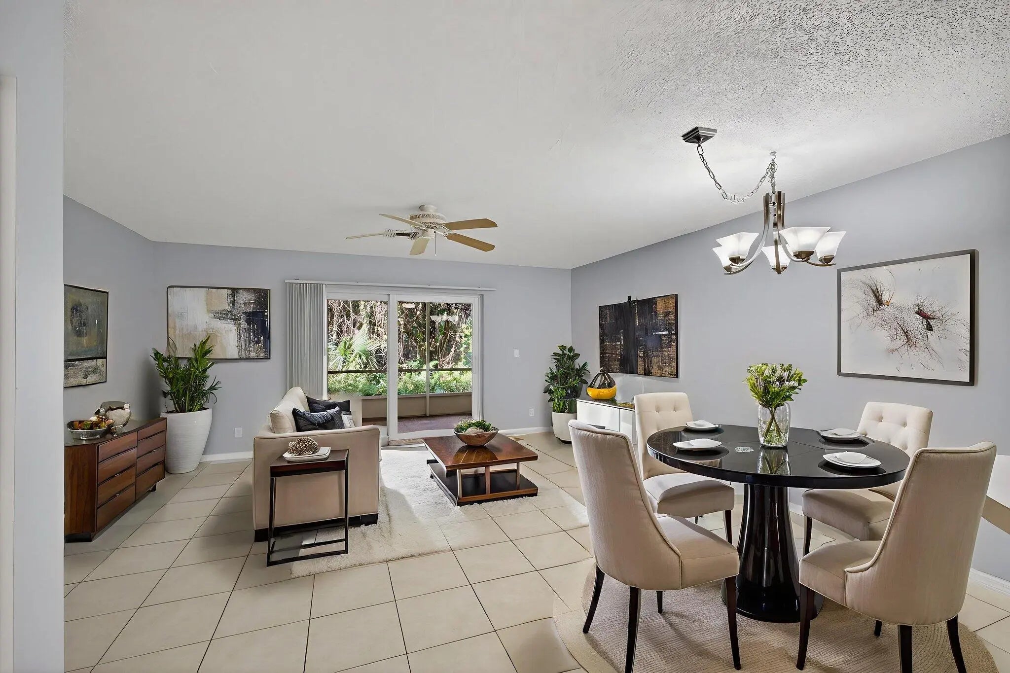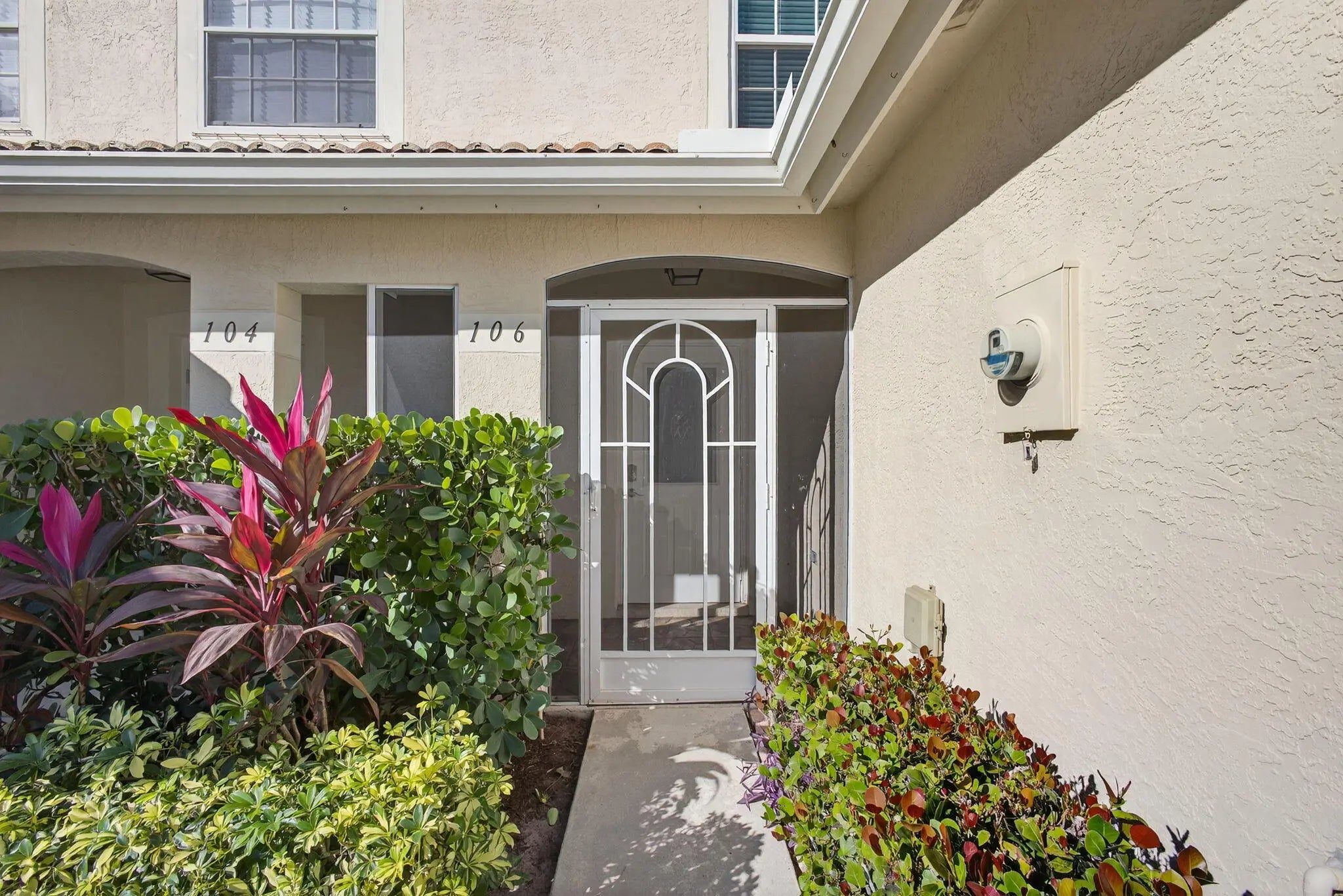 Minutes to the ocean in a gated Jupiter community. Impact Glass Throughout. Discover this impeccably maintained 2-bedroom, 2.5-bath home located in one of Jupiter's most desirable boutique gated communities, just minutes from pristine beaches. A custom stained-glass entry door welcomes you with natural light that flows through the open-concept layout to impact-rated sliding doors and a covered screened-in patio ideal for indoor-outdoor living.This home features impact windows throughout, newer appliances, a newer roof, spacious closets, and rare overhead garage storage. Wall-mounted TV setups in both the living room and primary bedroom add modern convenience. Zoned for top-rated Jupiter schools, this residence offers comfort, convenience, security, and effortless coastal living.