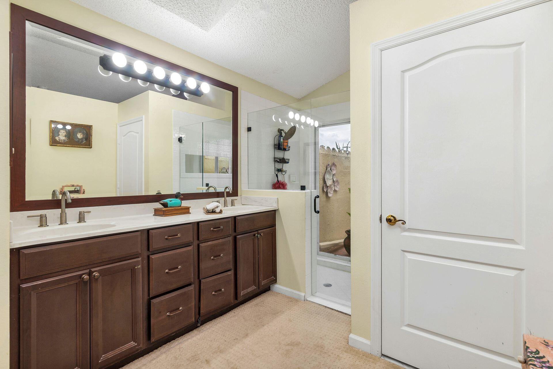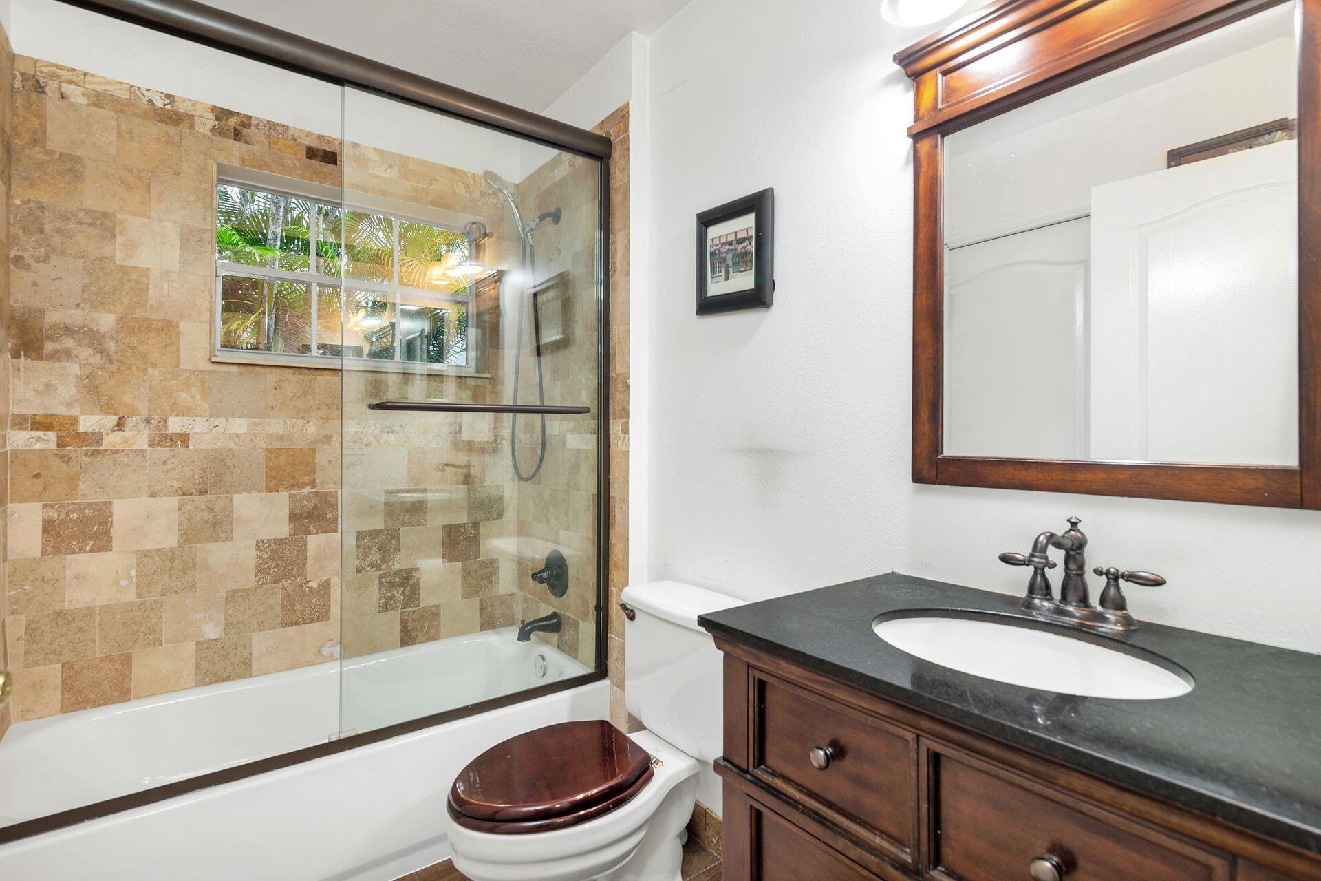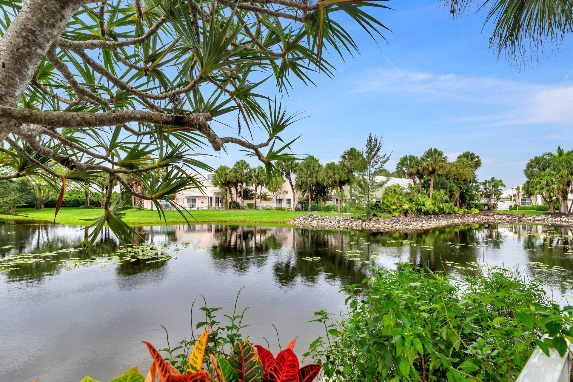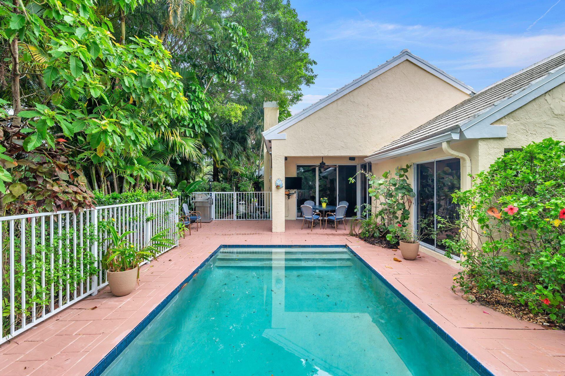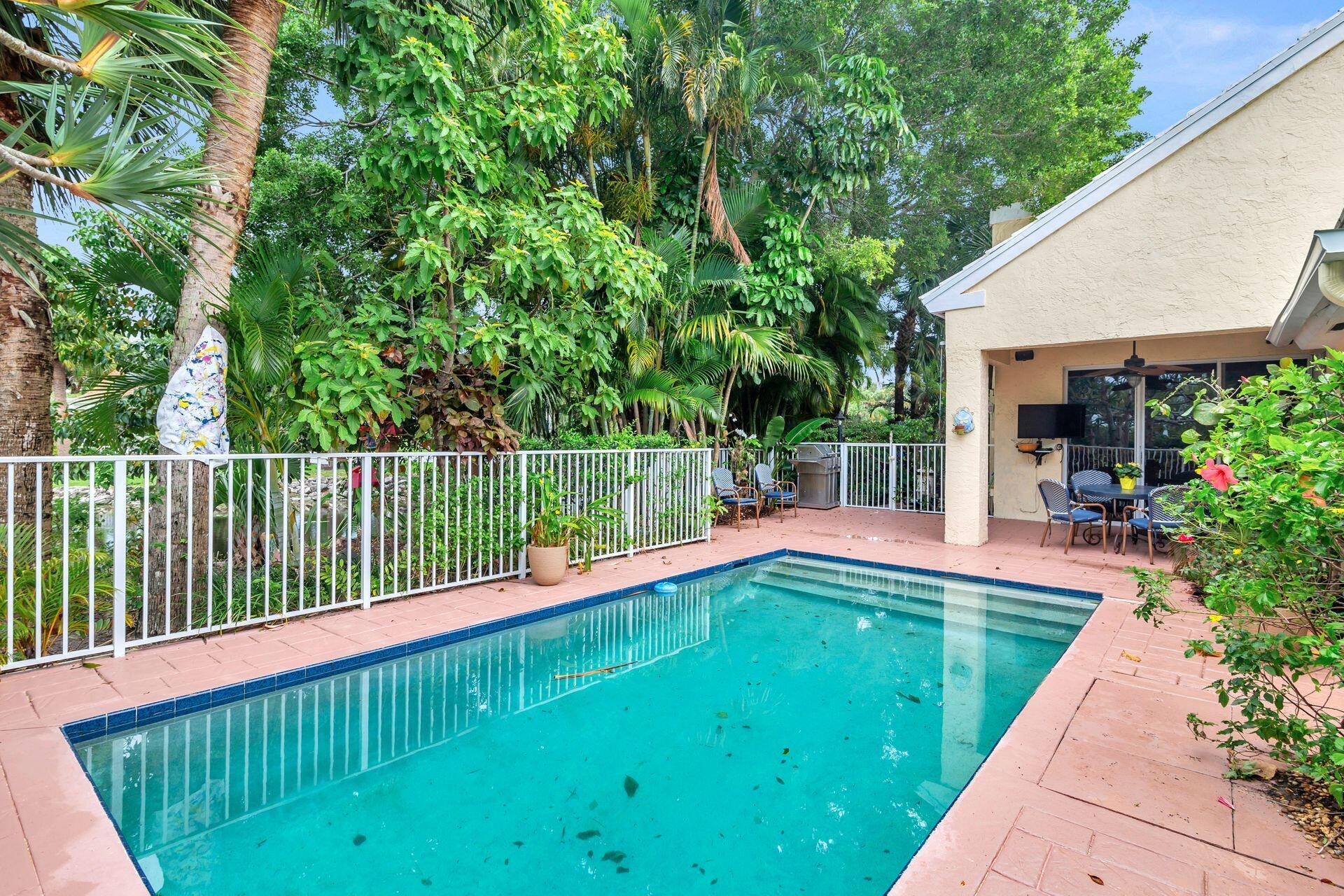 This Bermuda style architecture & charming 3BR 2BA has the ideal waterfront location. Prime tranquil wraparound lakefront views overlook the pool and outdoor whirlpool spa completely fenced with mature landscaping. Rainforest like trees embrace the property and give privacy to your outdoor living space. When you step outside you can stroll to a waterfront gazebo to take in all the nature and surrounding views. Roof & AC 6 years old. Living room has a wood slat cathedral ceiling and wood burning fireplace opening onto your pool and covered loggia. Baths have been updated and kitchen has new stainless steel appliances Roof & AC 6 years old. Nonmandatory memberships -Breakers West & Breakers Hotel Ocean course & Beach. Or join Mayacoo lakes CC. City of WPB 15 min. PB Island & Beach 20 mi